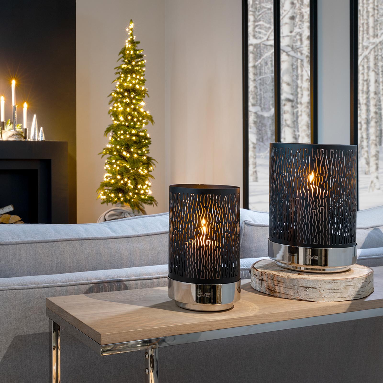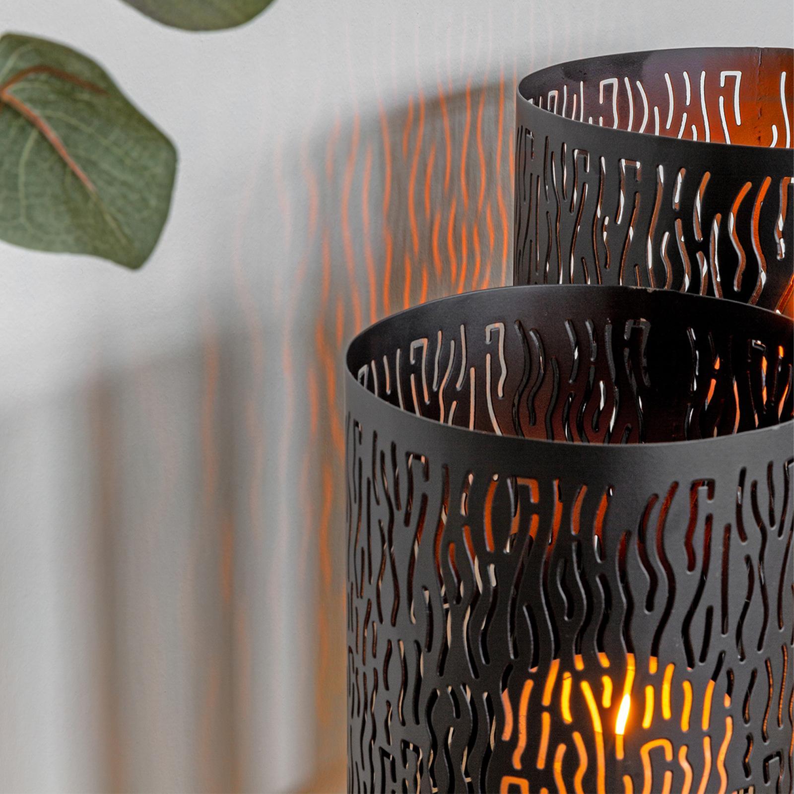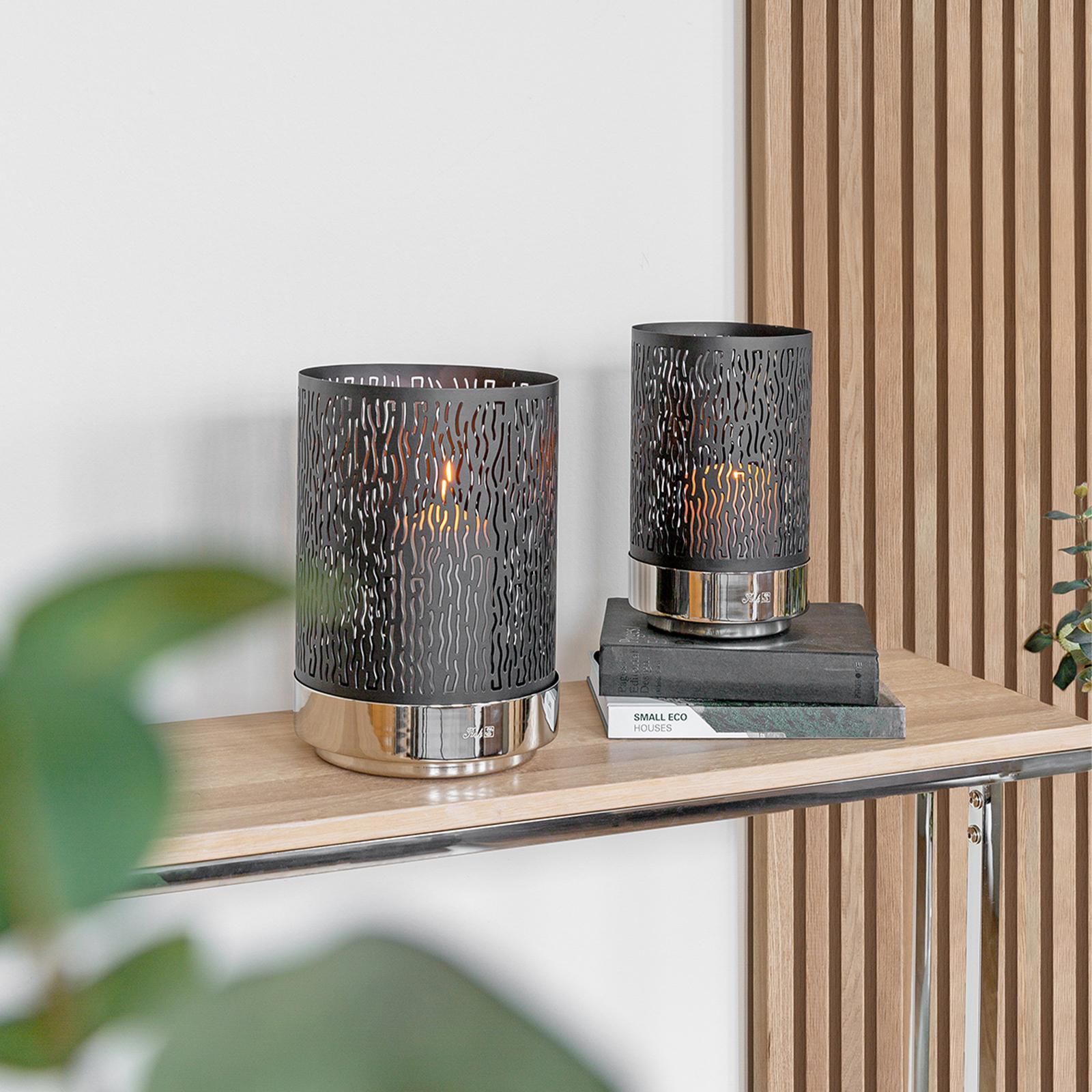 ✓ Schwarzes 30 cm Eisen-Windlicht - ein edles Wohnaccessoire für stilvolle Lichtakzente mit LED-Kerzen ✓ Die wellenförmige Ausstanzungen erzeugen bezaubernde Stimmung und ein faszinierendes Lichtspiel ✓ Beschichtung in schwarz-matter Optik trifft auf glänzenden Standfuß für spannenden Materialkontrast ✓ Kerzenhalter ideal für LED-Kerzen - vielseitig und perfekt für moderne, stimmungsvolle Dekorationen ✓ Ein dekoratives Stimmungslicht, das jeden Tisch oder Sideboard in ein elegantes Highlight verwandelt