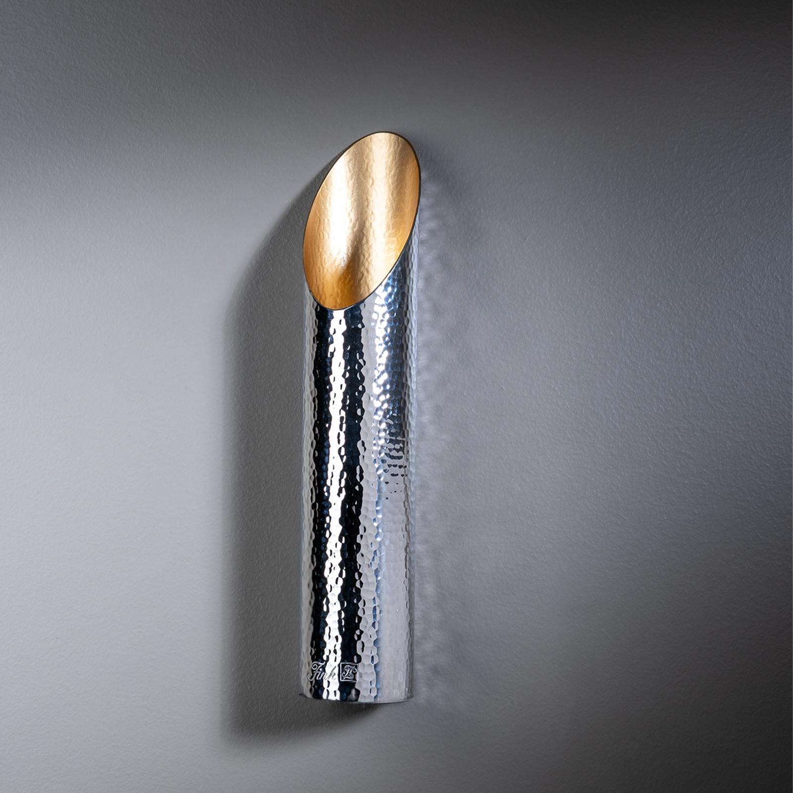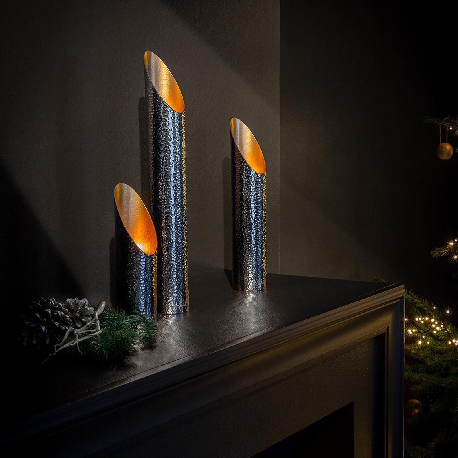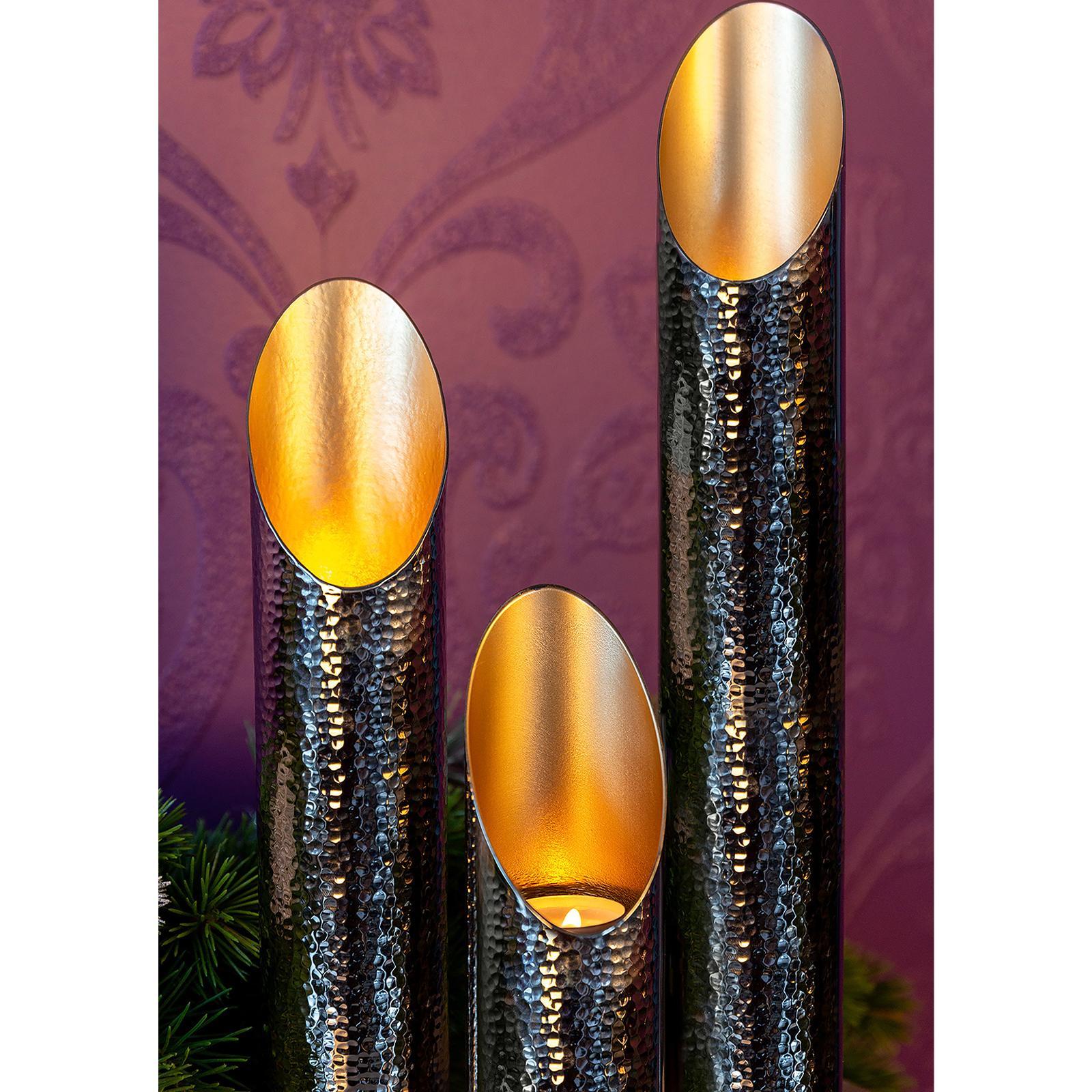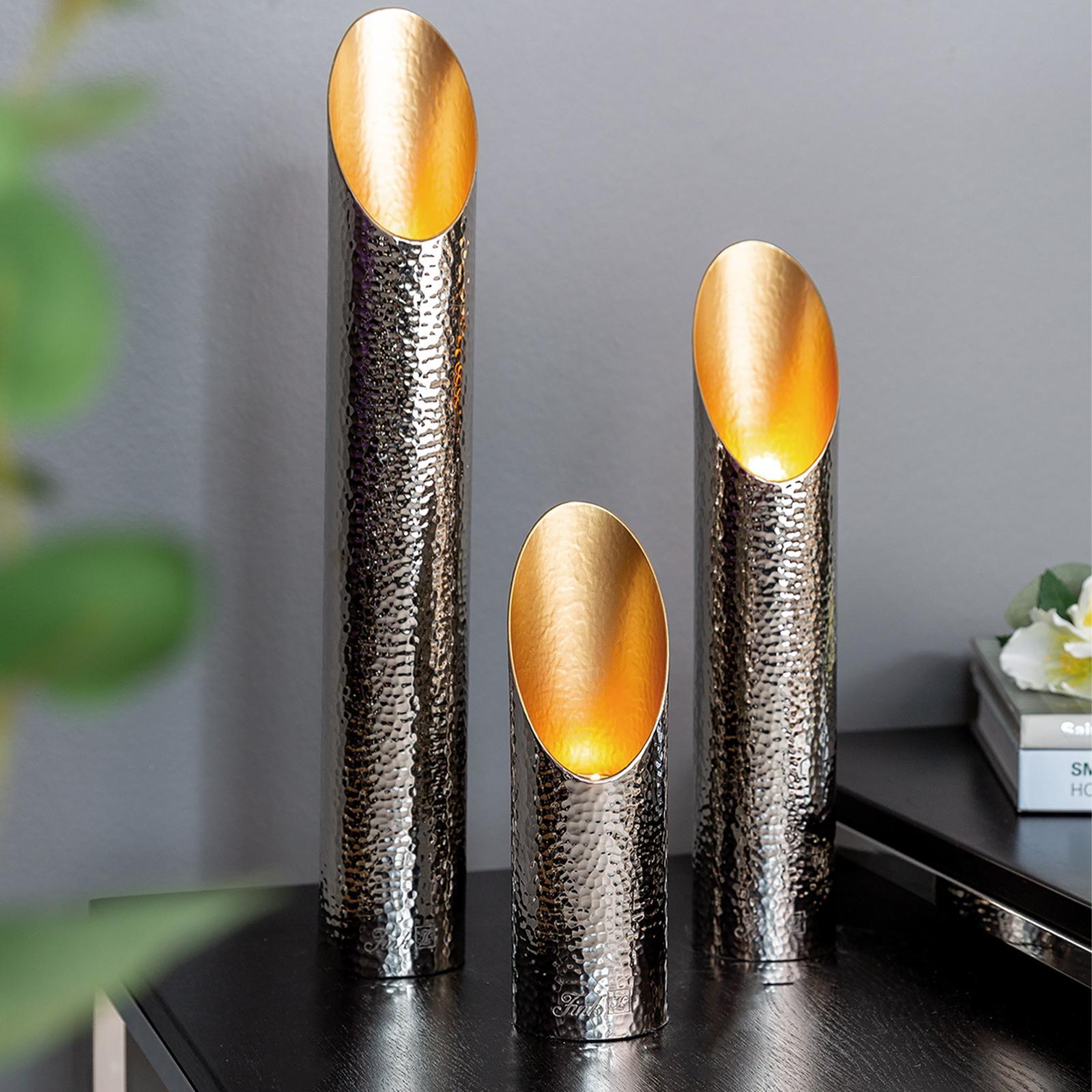 ✓ Schmaler gehämmerter Teelichthalter aus Aluminium mit polierter Außenseite für glänzende Akzente ✓ Goldfarbene Innenbeschichtung, reflektiert das Kerzenlicht warm & schafft eine luxuriöse Atmosphäre ✓ Zylindrische Form mit schräg zulaufender Öffnung - ein Deko-Kerzenhalter mit skulpturalem Charakter ✓ Vielseitig platzierbarer 30 cm hoher Kerzenständer - ideal für Kommoden, Beistelltische & Sideboards ✓ Eleganter Kerzenhalter in Silber-Gold-Optik - verbindet zeitloses Design mit einem Hauch von Glamour