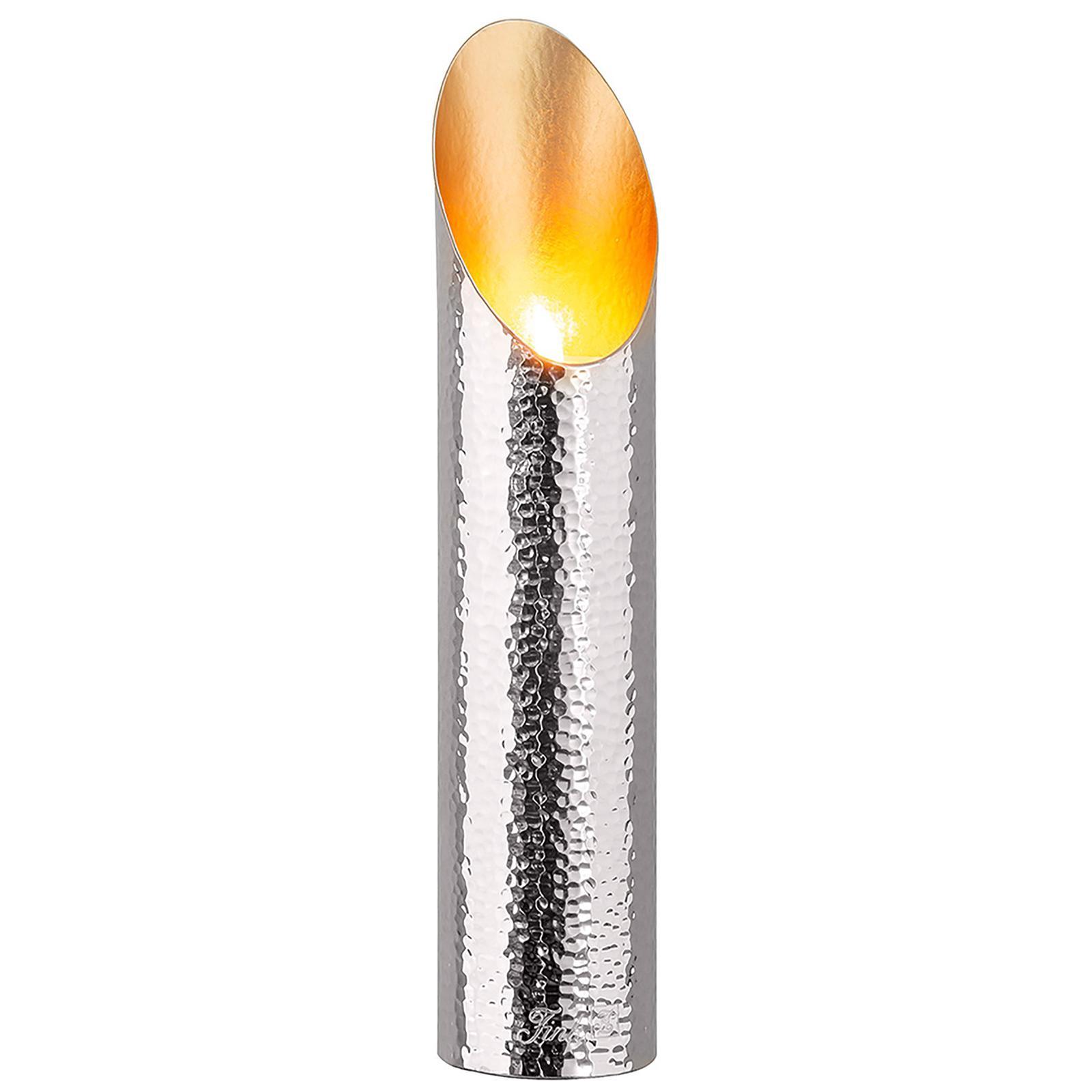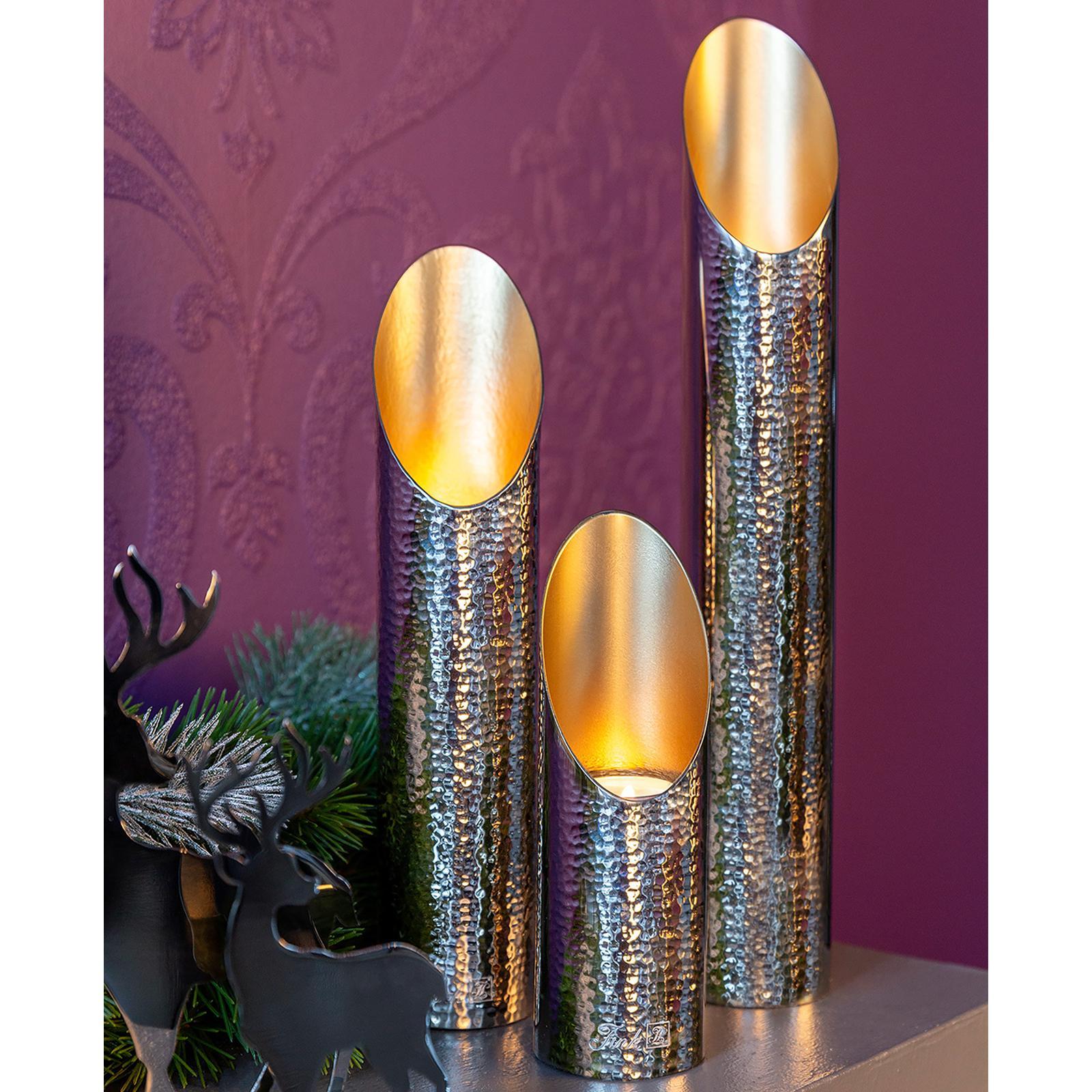 • Länge ca.: 6,2 cm • Breite ca.: 6,2 cm • Höhe ca.: 30 cm • Durchmesser ca.: 6,2 cm • Serie: Fink Living • Kapazität: für 1 Teelicht Ø 6 cm • Material: Aluminium • Veredelung: vernickelt • Oberfläche: glänzend poliert • Oberfläche Details: gehämmert • Farbe: silber • Eigenschaft: innen goldfarben gesprüht • Form: rund • Dimension: mittel • Look & Stil: modern • Umgebungsnutzung: Für Innenbereich • Anlass: Stimmungsvolle Alltags-Momente, Saisonale Deko, Wohnambiente • Nutzungsbereich: Sideboard, Fensterbank, Tischdekoration, Anrichte • Besonderheit: traditionelle, aufwendige Handarbeit • Gewicht ca.: 0,6 Kg