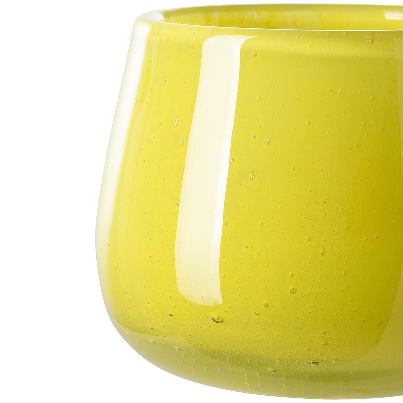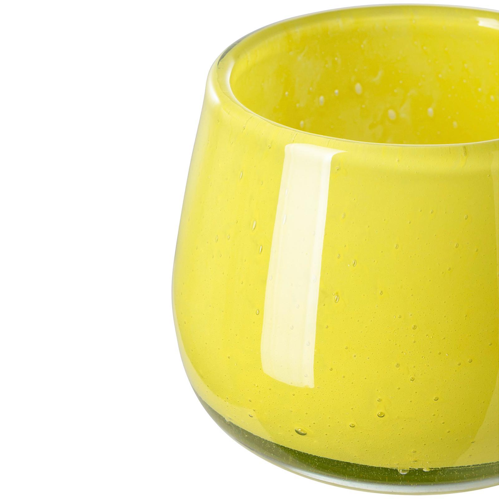 ✓ Handgefertigtes Glas-Windlicht Ø 14 cm in klarem Gelb & kunstvoller, detailreicher Oberflächenoptik ✓ Eine feine Puder-Technik erzeugt eine sanfte Färbung mit markantem Dekor zu einem echten Unikat ✓ Nutzbar als Windlicht oder kleine Blumenvase - ein stilvoller Akzent für Tisch, Regal oder Fensterbank ✓ Eloquenter Handmade-Charakter trifft auf zeitlose Eleganz - ideal kombinierbar mit vielen Wohnstilen ✓ Stimmungsvolles Teelicht-Glas mit feinem Farbspiel & edler Glasqualität für ein besonderes Ambiente