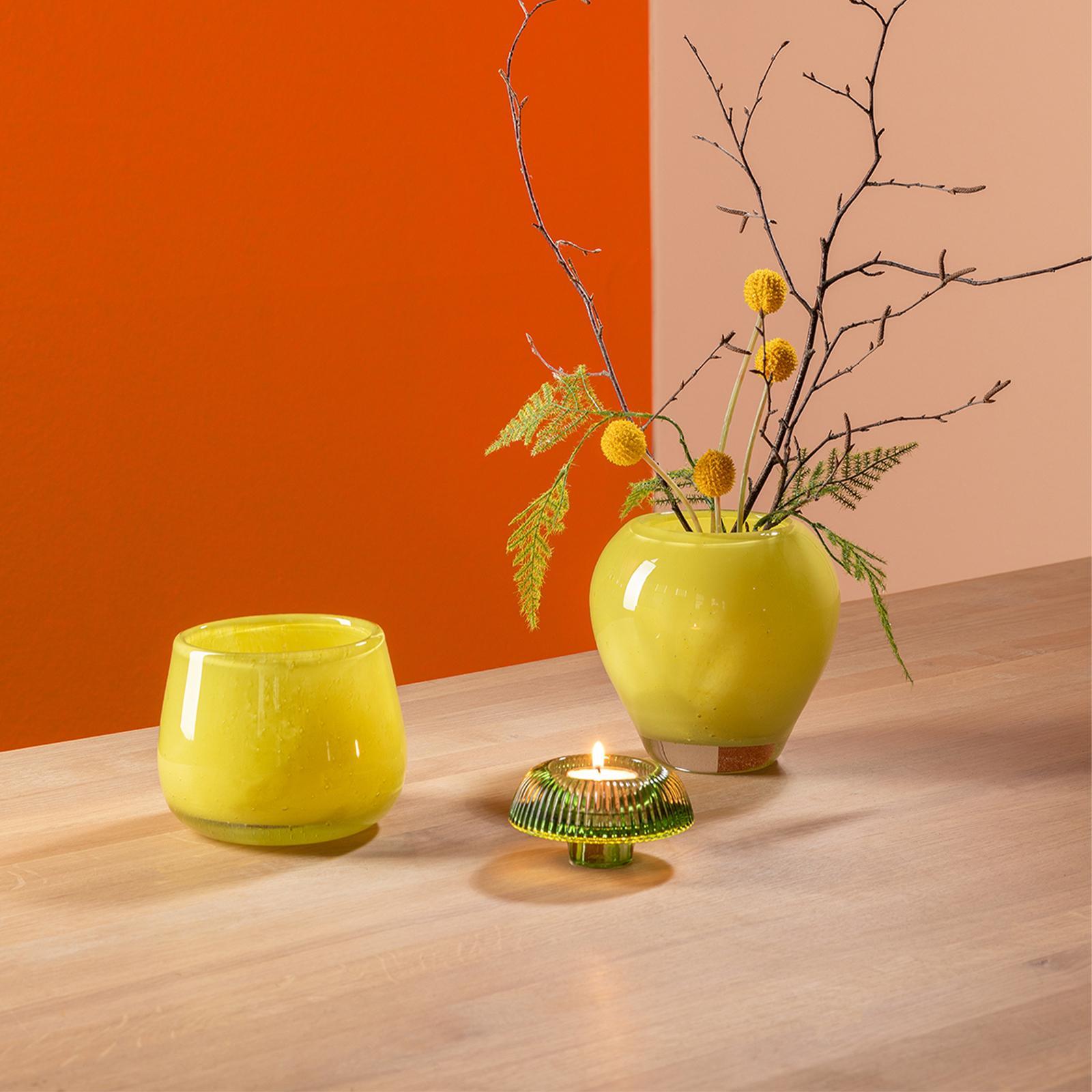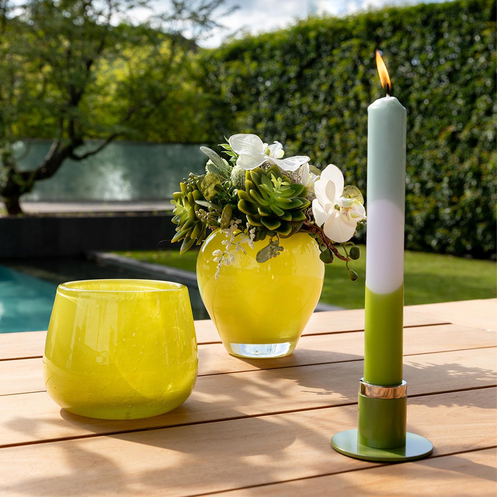 • Länge ca.: 13,5 cm • Breite ca.: 13,5 cm • Höhe ca.: 11 cm • Durchmesser ca.: 13,5 cm • Serie: Fink Living • Kapazität: für 1 Teelicht Ø 4 cm • Material: Glas • Veredelung: durchgefärbtes Glas • Oberfläche: glänzend • Oberfläche Details: glatt • Farbe: grün-gelb • Eigenschaft: auch als Vase verwendbar • Form: rund • Dimension: klein • Umgebungsnutzung: Für Innenbereich • Anlass: Saisonale & thematische Deko, Gartenabende, Geschenkidee • Nutzungsbereich: Sideboard, Fensterbank, Tischdekoration, Anrichte • Besonderheit: mundgeblasen • Besonderheit I: Unikatcharakter, Handarbeit • Gewicht ca.: 1,24 Kg