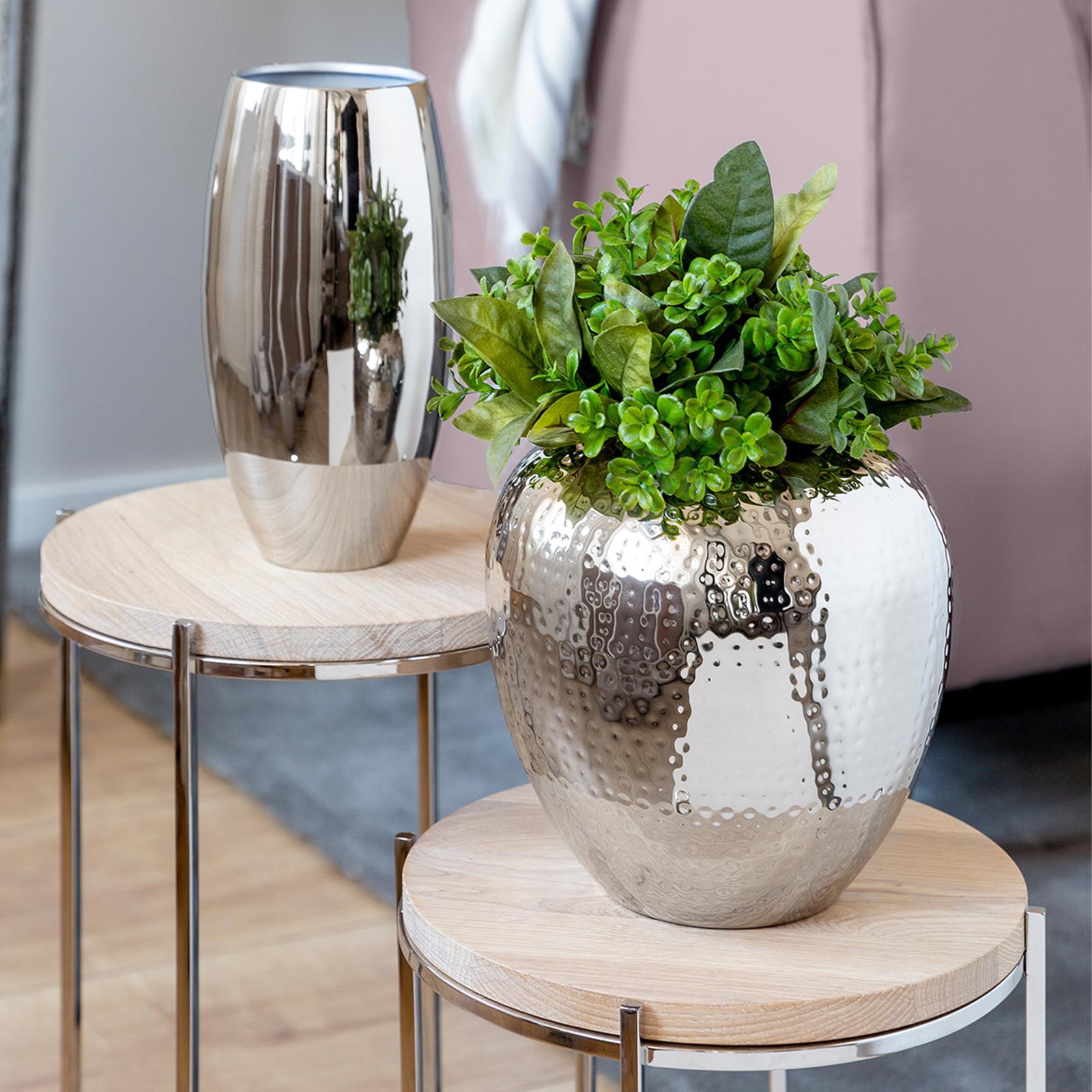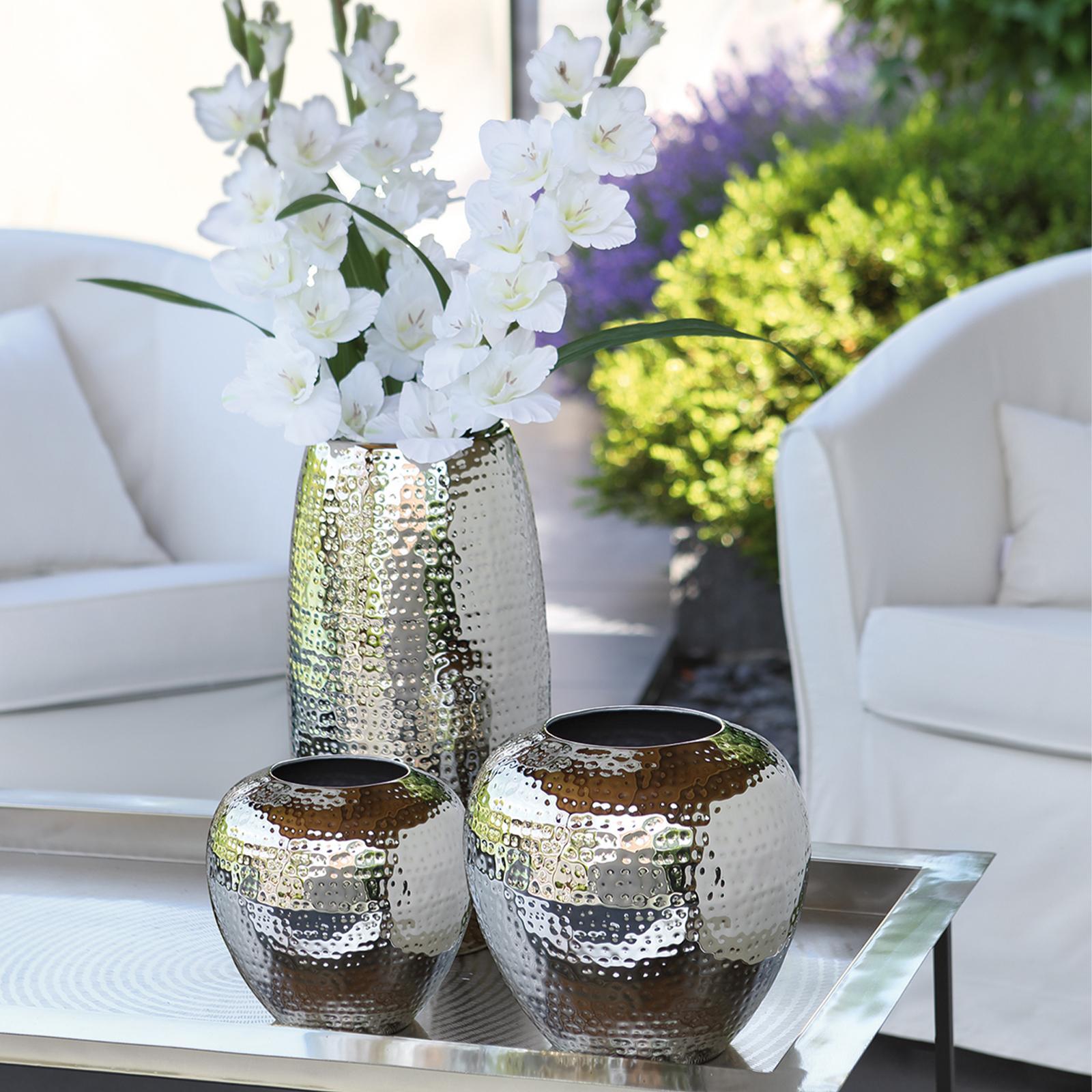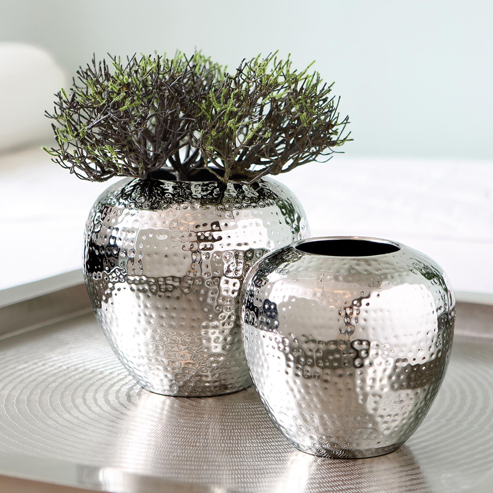 • Länge ca.: 25 cm • Breite ca.: 25 cm • Höhe ca.: 25 cm • Durchmesser ca.: 25 cm • Serie: Fink Living • Material: Eisen • Veredelung: vernickelt • Oberfläche: glänzend poliert • Oberfläche Details: gehämmert • Farbe: silber • Form: rund • Dimension: groß • Umgebungsnutzung: Für Innenbereich • Anlass: Jubiläen & Feste, Deko, Saisonale Anlässe, Geschenkidee • Nutzungsbereich: Sideboard, Fensterbank, Tischdekoration, Anrichte • Nutzungsmöglichkeit: Schnittblumen, Trockenblumen, Sträuße • Gewicht ca.: 1,3 Kg