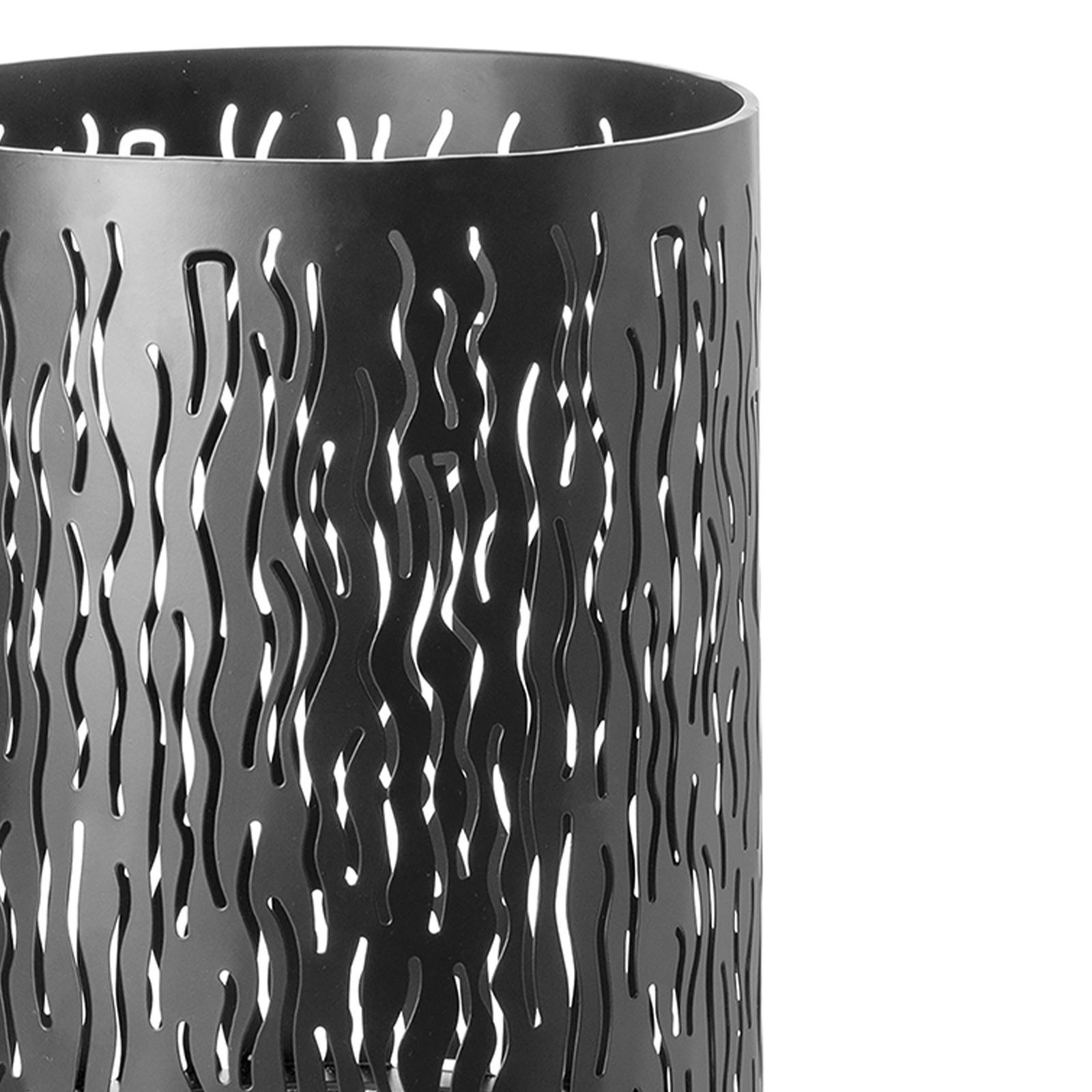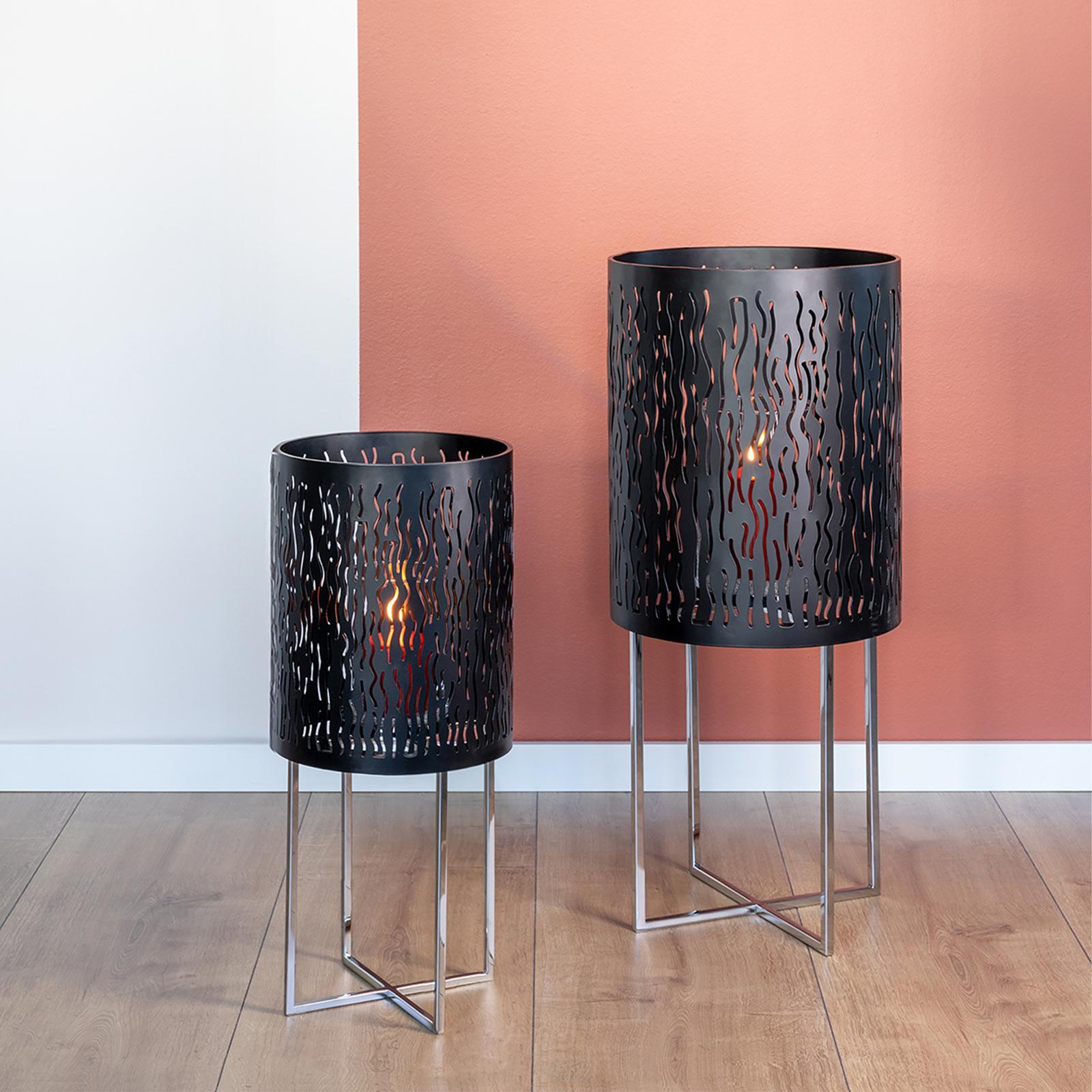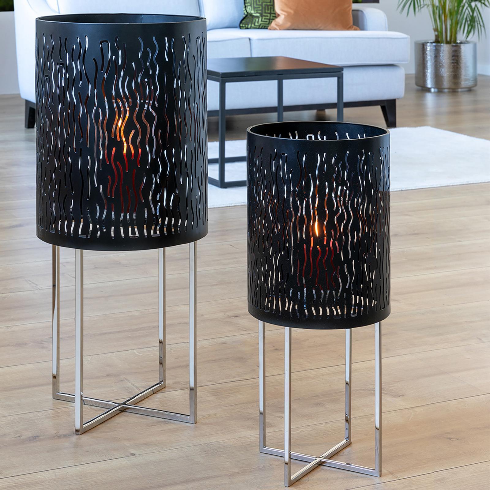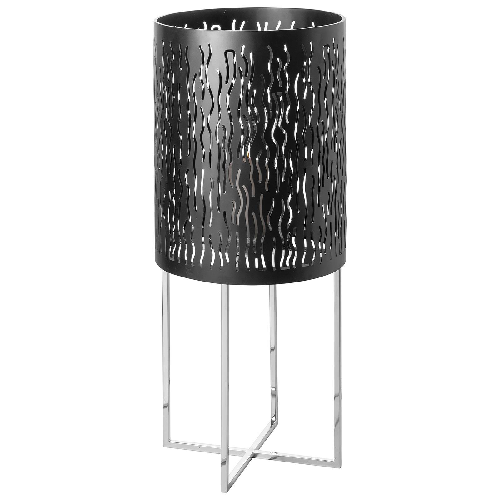 ✓ Boden-Windlicht 82 cm in markantem Design mit mattschwarzer Oberfläche & poliertem Edelstahlfuß ✓ Wellenförmige Aussparungen erzeugen tolle Lichteffekte & ein faszinierendes Schattenspiel im Raum ✓ Kombination aus Pulverbeschichtung & glänzendem Edelstahl, für edlen Kontrast & hochwertige Optik ✓ Stumpenkerzenhalter als edles Statement für Eingangsbereiche, Wohnräume & überdachte Terrassen ✓ Kerzenhalter mit Untergestell - ideale Wahl für elegante Dekorationen & behagliche Lichtatmosphäre