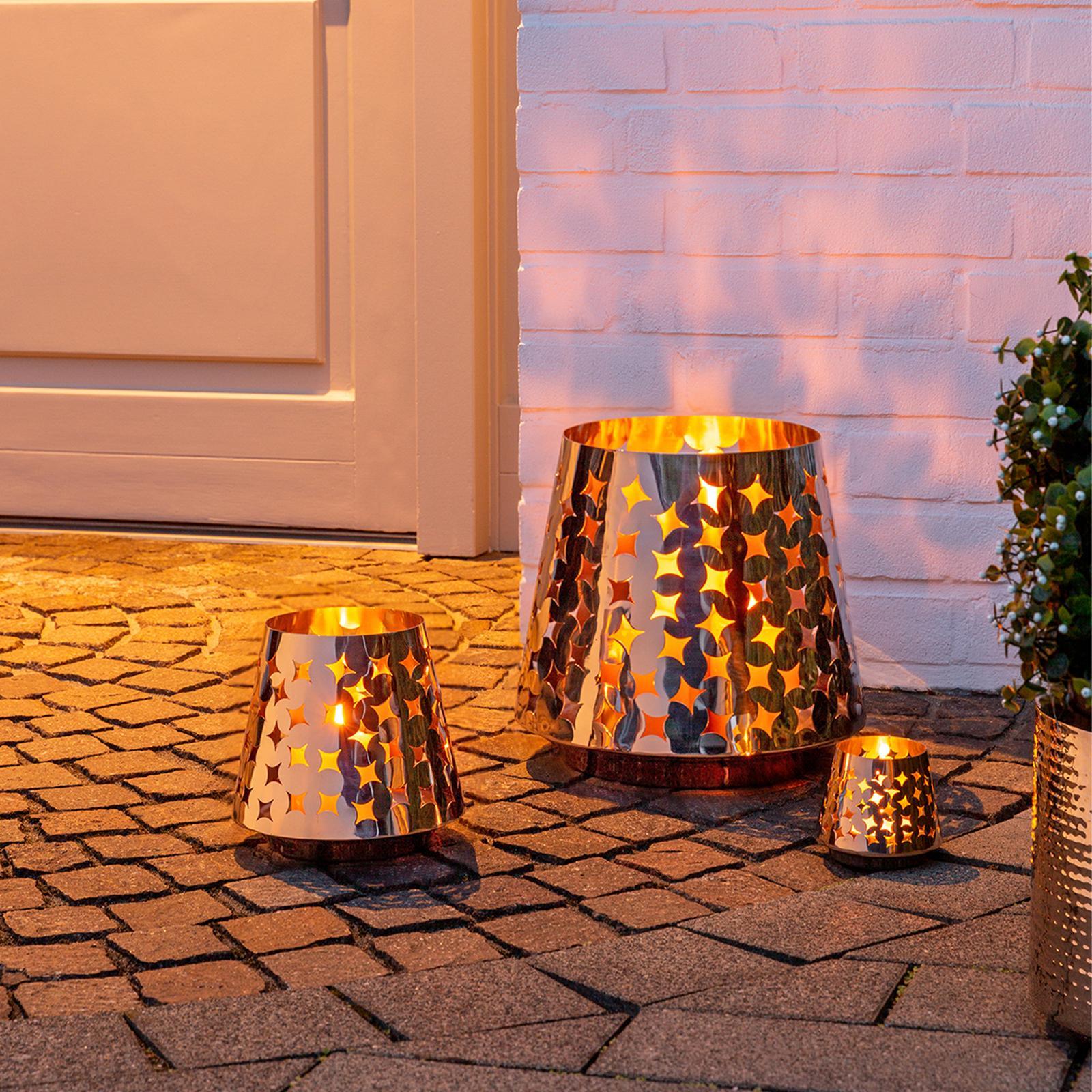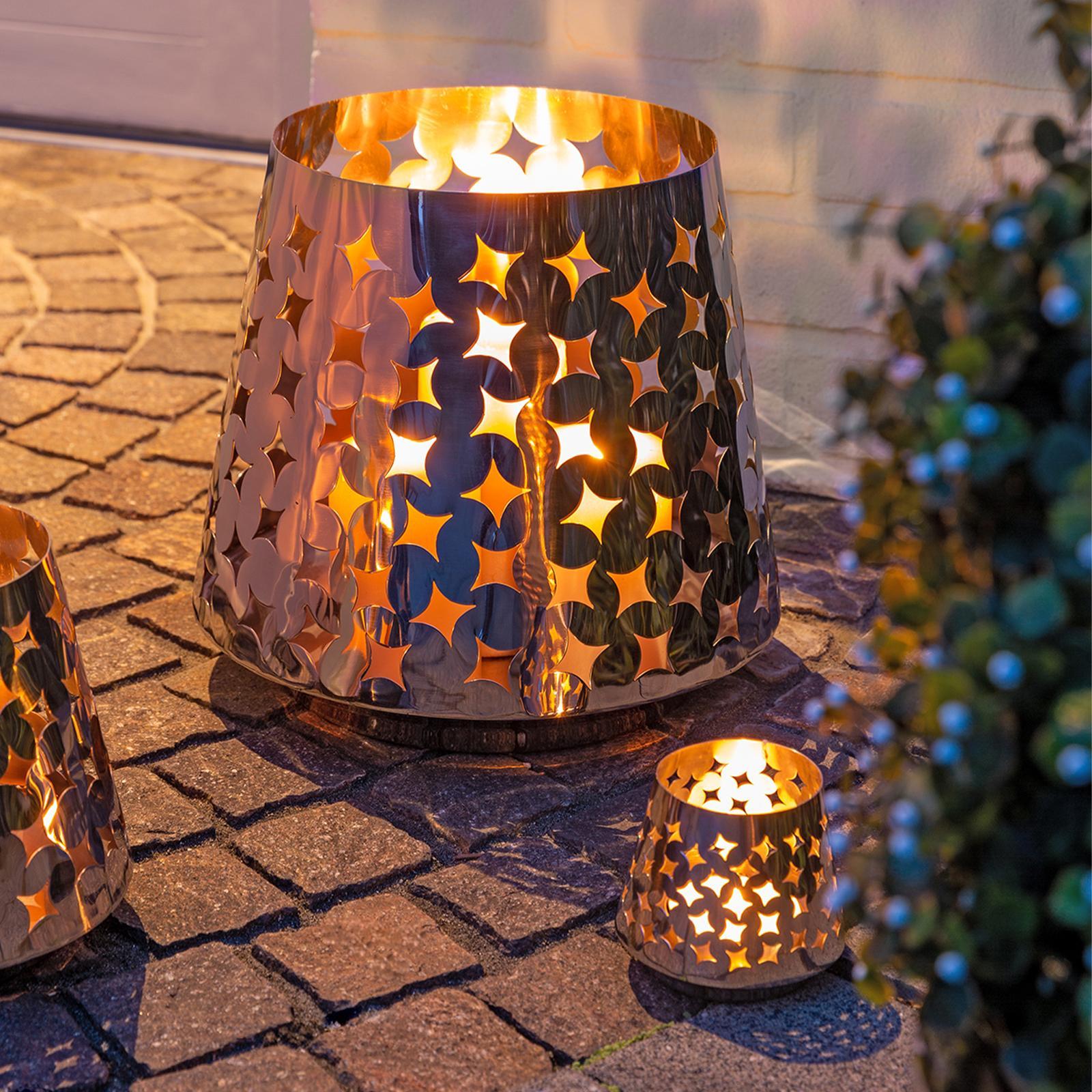 ✓ Das große kegelförmige Edelstahl-Windlicht 32x23 cm bringt stimmungsvolle Lichtspiele in Ihr Zuhause ✓ Die raffiniert gearbeiteten Öffnungen erzeugen tolle Effekte aus Kerzenlicht, Schatten & Reflexionen ✓ Glänzend veredeltes Metall reflektiert die Flamme & setzt elegante Kontraste in Ihre Einrichtungsstile ✓ Kerzenhalter für Stumpenkerzen, ist harmonisch mit klassischen & zeitgemäßen Dekoren kombinierbar ✓ Schöner Blickfang für den Eingangsbereich oder im Wohnbereich - schafft sofort behagliches Ambiente