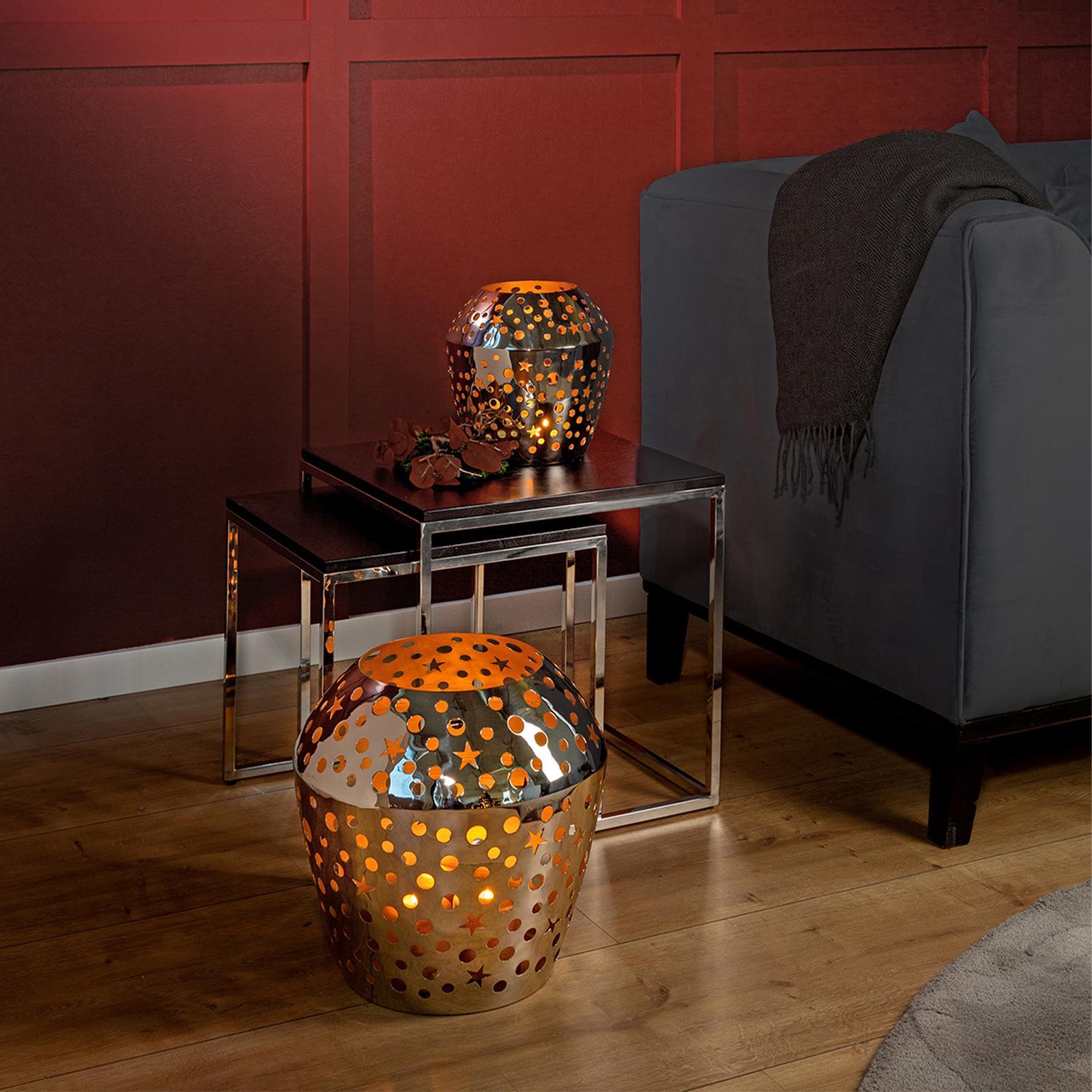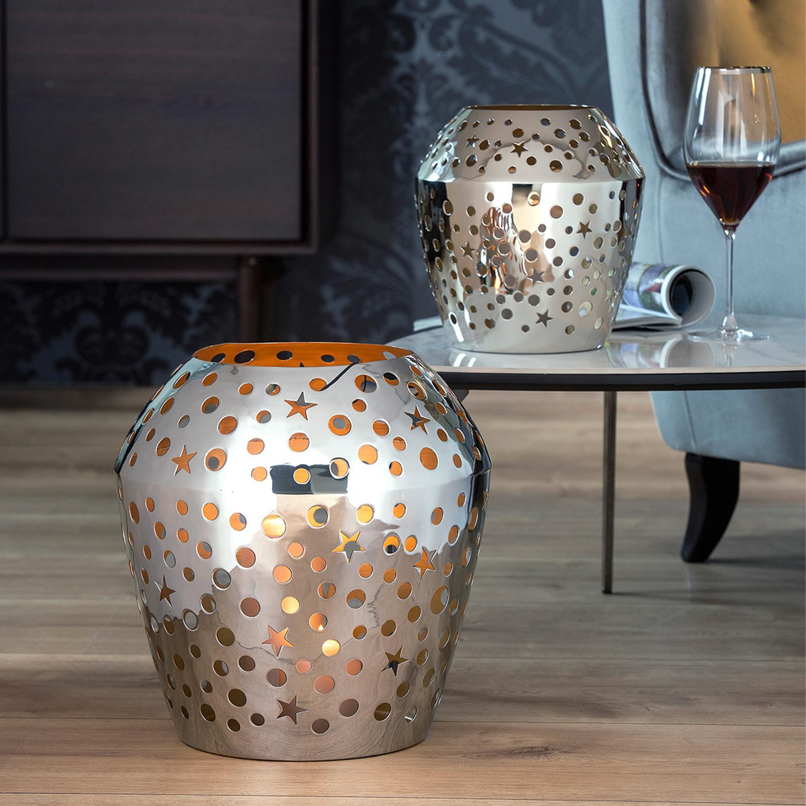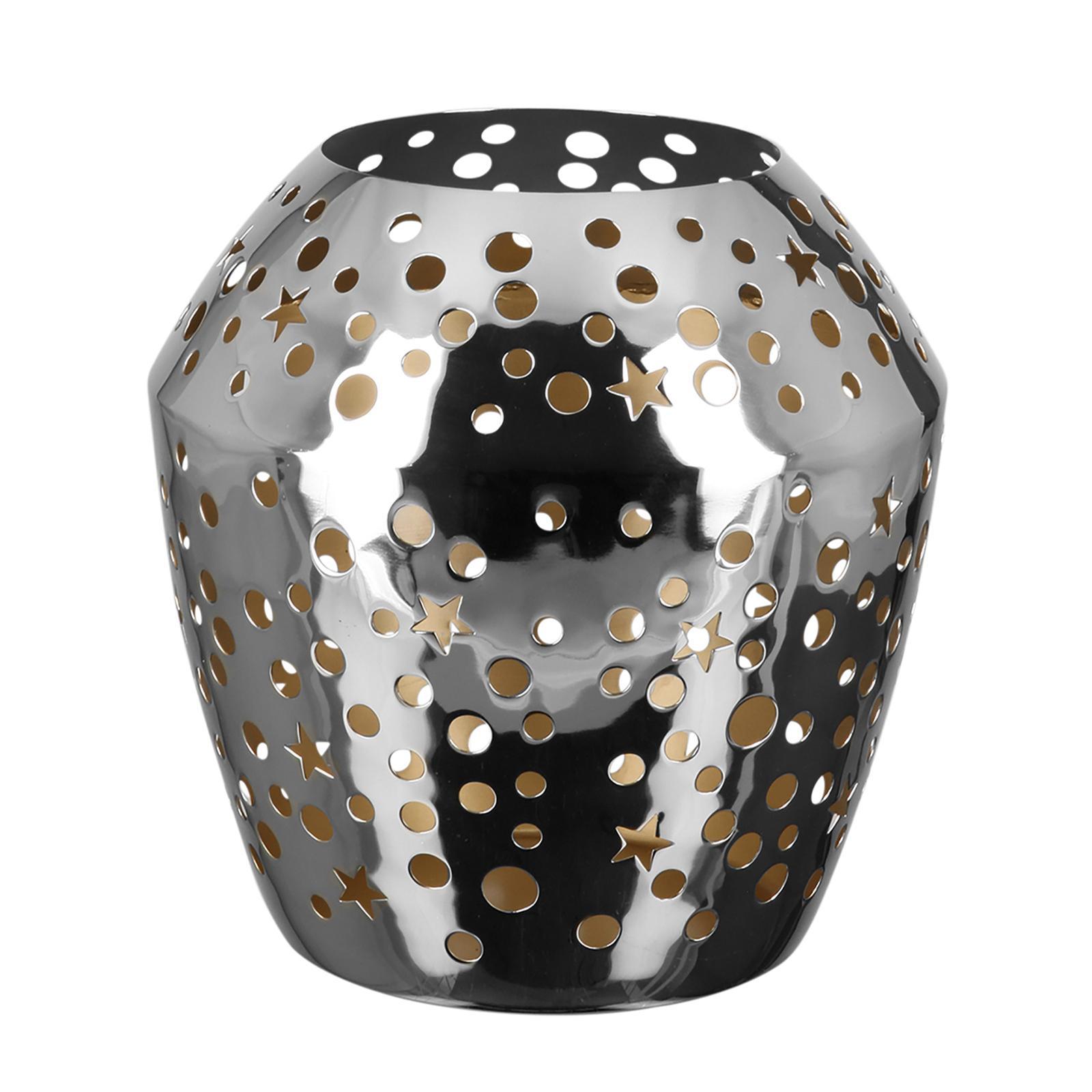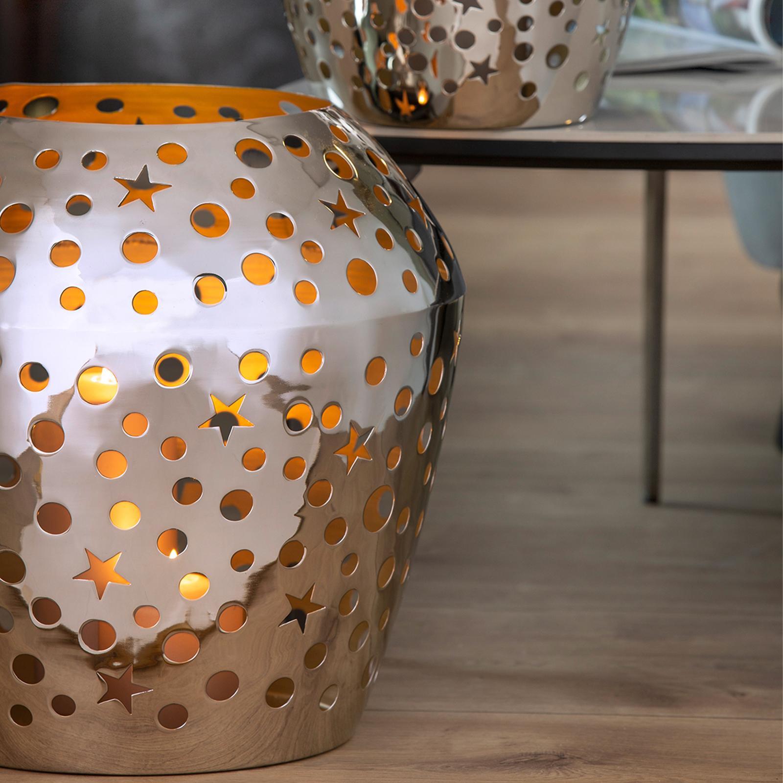 • Länge ca.: 24 cm • Breite ca.: 24 cm • Höhe ca.: 24 cm • Durchmesser ca.: 24 cm • Serie: Fink Living • Kapazität: für 1 Stumpenkerze • Material: Eisen • Beschichtung: pulverbeschichtet • Veredelung: vernickelt • Oberfläche: glänzend poliert • Oberfläche Details: strukturiert • Farbe: silber • Eigenschaft: ohne Aufsatz-Glaszylinder • Ausstattung: innen goldfarben • Dimension: klein • Look & Stil: kreis- & sternförmige Ausstanzung • Umgebungsnutzung: Für Innenbereich • Anlass: Saisonale & thematische Deko, Gartenabende, Geschenkidee • Nutzungsbereich: Sideboard, Fensterbank, Tischdekoration, Anrichte • Besonderheit: für LED Leuchten / Kerzen geeignet • Gewicht ca.: 1,37 Kg