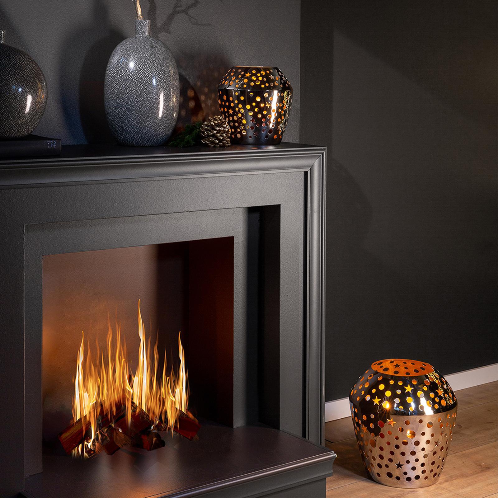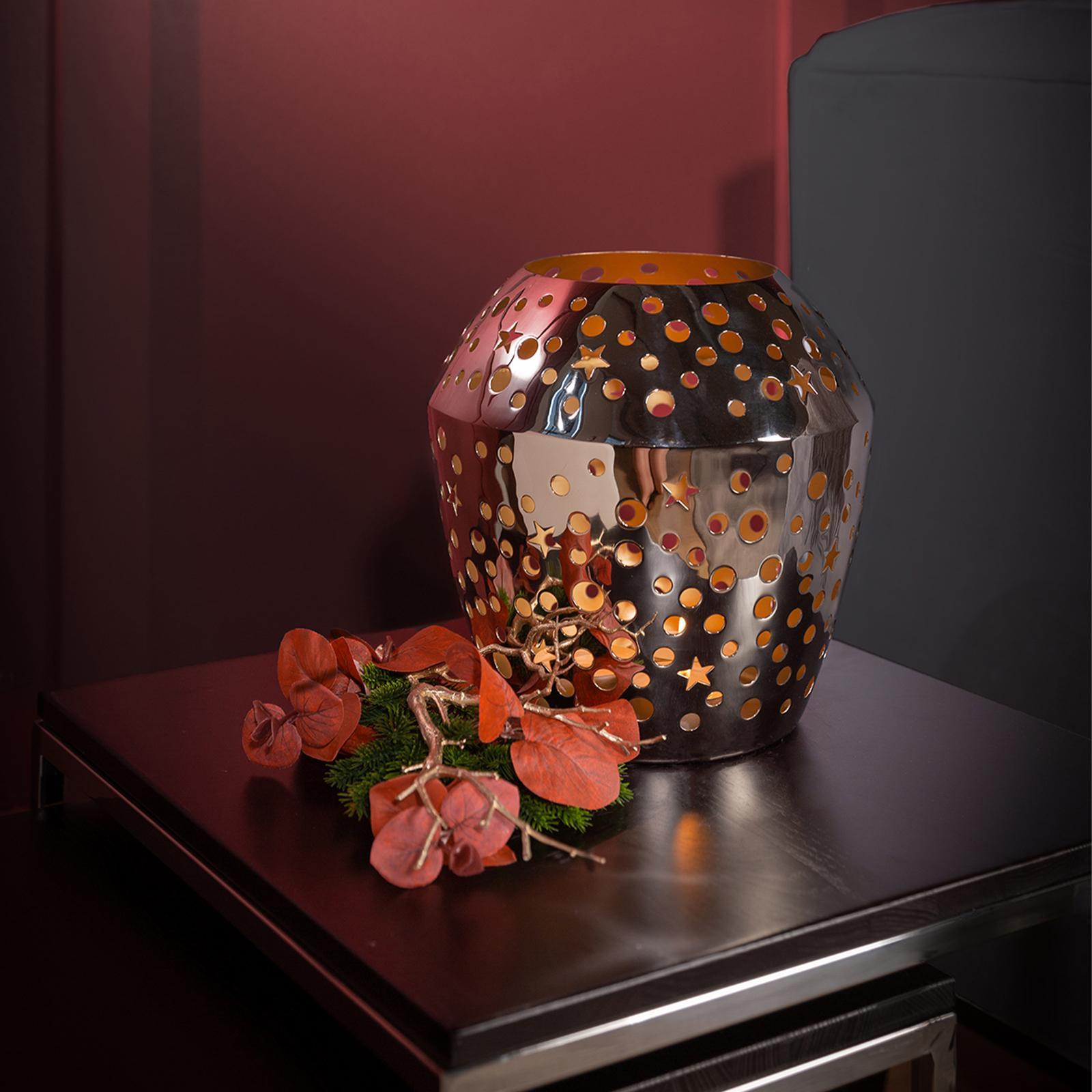 • Länge ca.: 36 cm • Breite ca.: 36 cm • Höhe ca.: 36 cm • Durchmesser ca.: 36 cm • Serie: Fink Living • Kapazität: für 1 Stumpenkerze • Material: Eisen • Beschichtung: pulverbeschichtet • Veredelung: vernickelt • Oberfläche: glänzend poliert • Oberfläche Details: strukturiert • Farbe: silber • Eigenschaft: ohne Aufsatz-Glaszylinder • Ausstattung: innen goldfarben • Dimension: groß • Look & Stil: kreis- & sternförmige Ausstanzung • Umgebungsnutzung: Für Innenbereich • Anlass: Saisonale & thematische Deko, Gartenabende, Geschenkidee • Nutzungsbereich: Sideboard, Fensterbank, Tischdekoration, Anrichte • Besonderheit: für LED Leuchten / Kerzen geeignet • Gewicht ca.: 2 Kg