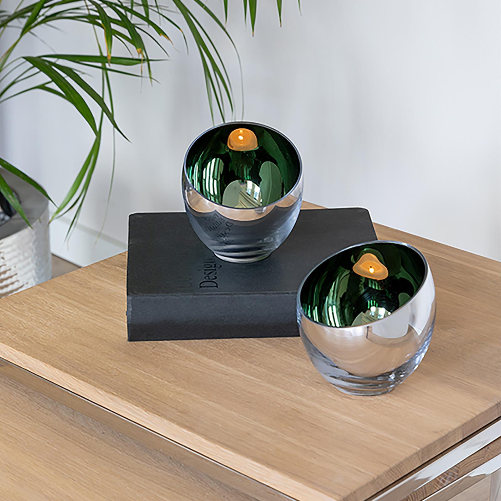• Länge ca.: 11 cm • Breite ca.: 11 cm • Höhe ca.: 11 cm • Durchmesser ca.: 11 cm • Serie: Fink Living • Kapazität: für 1 Teelicht Ø 6 cm • Material: Glas • Oberfläche: silberglänzend • Oberfläche Details: glatt • spülmaschinengeeignet: nein • Farbe: moosgrün • Form: rund • Dimension: mittel • Look & Stil: modern • Setumfang: 2-teilig • Umgebungsnutzung: Für Innenbereich und geschützten Außenbereich • Anlass: Stimmungsvolle Alltags-Momente, Saisonale Deko, Wohnambiente • Nutzungsbereich: Sideboard, Fensterbank, Tischdekoration, Anrichte • Besonderheit: mundgeblasen