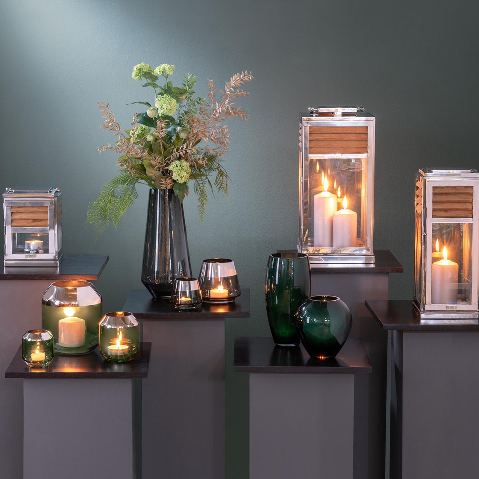 • Länge ca.: 15 cm • Breite ca.: 15 cm • Höhe ca.: 13 cm • Durchmesser ca.: 15 cm • Serie: Fink Living • Kapazität: für 1 Teelicht Ø 6 cm • Material: Glas • Material 1: Silberfolie • Veredelung: Rand foliert • Oberfläche: glänzend poliert • Oberfläche Details: glatt • spülmaschinengeeignet: nein • Farbe: dunkelgrün-silber • Eigenschaft: mit silberfarbenem Rand • Ausstattung: mit verjüngter Öffnung • Form: rund • Dimension: mittel • Look & Stil: modern • Umgebungsnutzung: Für Außenbereich und Innenbereich • Anlass: Stimmungsvolle Alltags-Momente, Saisonale Deko, Wohnambiente • Nutzungsbereich: Sideboard, Fensterbank, Tischdekoration, Anrichte • Besonderheit: mundgeblasen • Besonderheit I: auch als Vase verwendbar • Gewicht ca.: 0,64 Kg