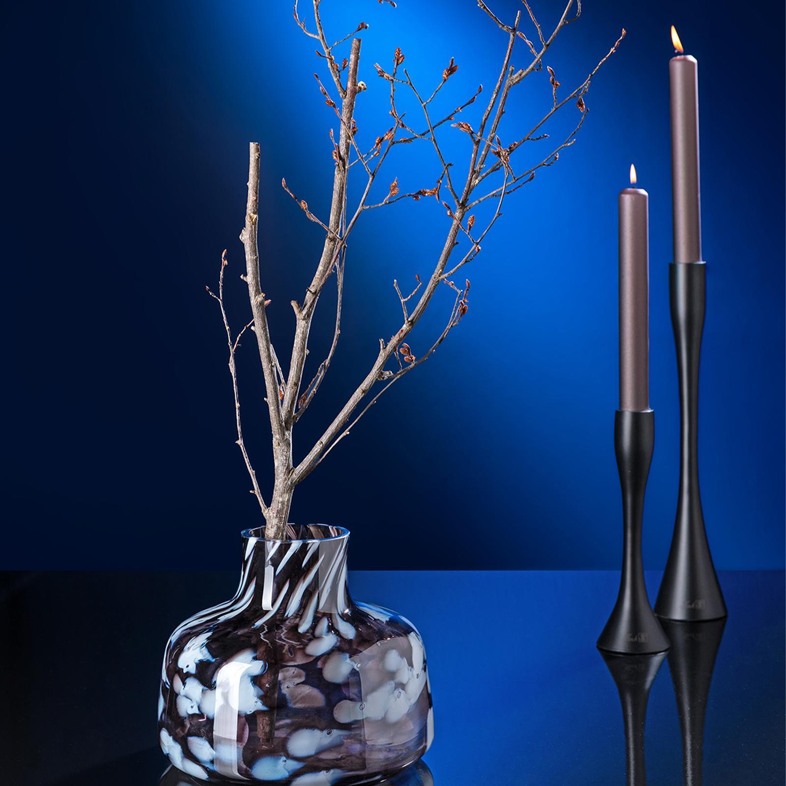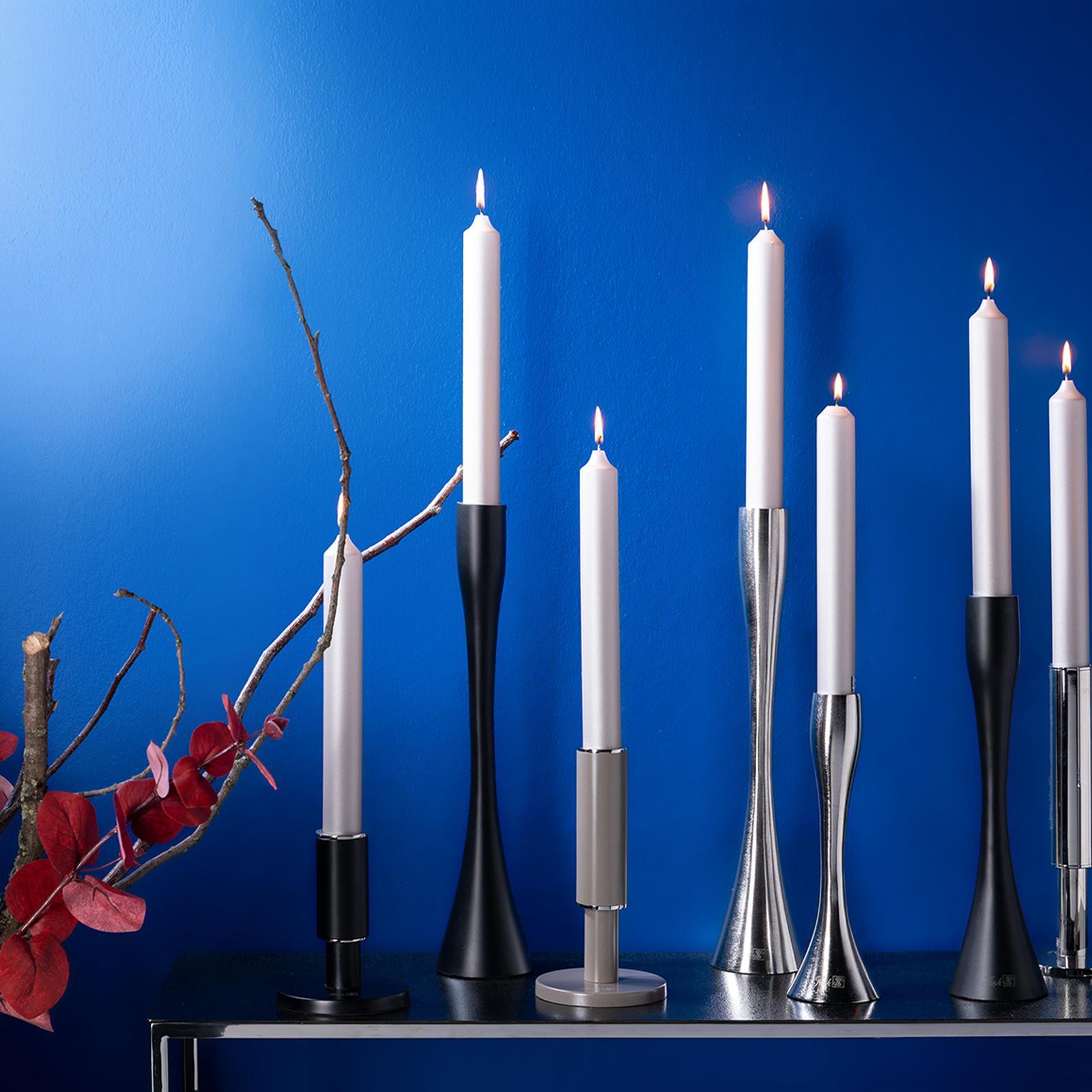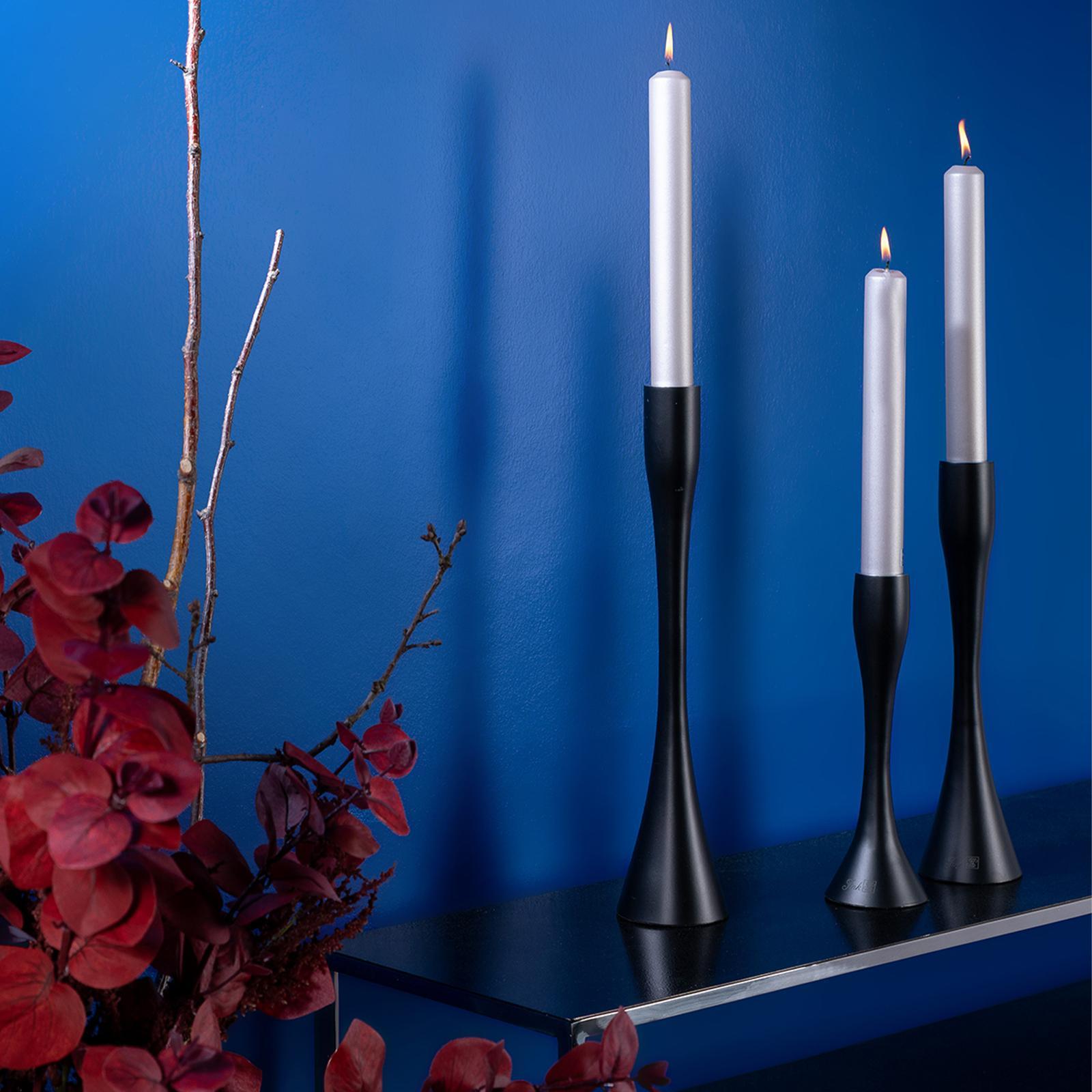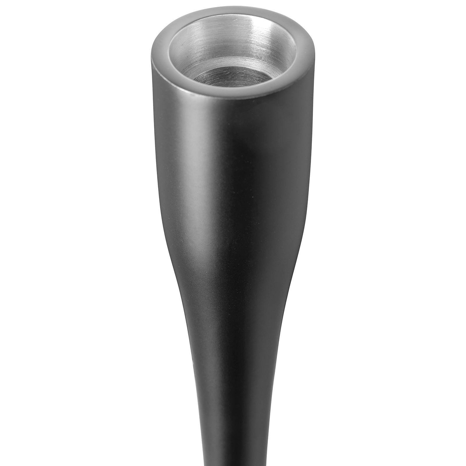 Dieser Kerzenhalter verbindet schlankes Design mit einer modernen Ausstrahlung und wird so zu einem eleganten Blickfang in jedem Raum. Mit einer Höhe von 36 cm setzt er Stabkerzen bis 3 cm Durchmesser stilvoll in Szene und schafft eine warme Lichtstimmung, die Ihr Zuhause in ein stimmungsvolles Ambiente taucht. Das matte Schwarz verleiht dem Leuchter eine edle Tiefe und sorgt dafür, dass er sich mühelos in verschiedenste Einrichtungsstile einfügt. Ob auf dem Esstisch, einem Sideboard oder als dekoratives Detail bei festlichen Anlässen - er überzeugt durch seine Vielseitigkeit und fügt sich harmonisch in moderne wie klassische Wohnwelten ein. Gefertigt aus Aluminium bietet der Kerzenhalter eine leichte, aber stabile Konstruktion. Die satinierte Oberfläche reflektiert das Kerzenlicht dezent und unterstützt die ruhige, elegante Wirkung des Designs. So entsteht ein Accessoire, das nicht nur funktional, sondern auch ästhetisch überzeugt. Als dekoratives Highlight wertet der Leuchter Buffets oder Dinnerpartys auf und eignet sich ebenso als geschmackvolles Geschenk für stilbewusste Gastgeber. Mit seiner klaren Formensprache und dem eleganten Schwarz wird er zu einem zeitlosen Begleiter für gemütliche wie festliche Momente.