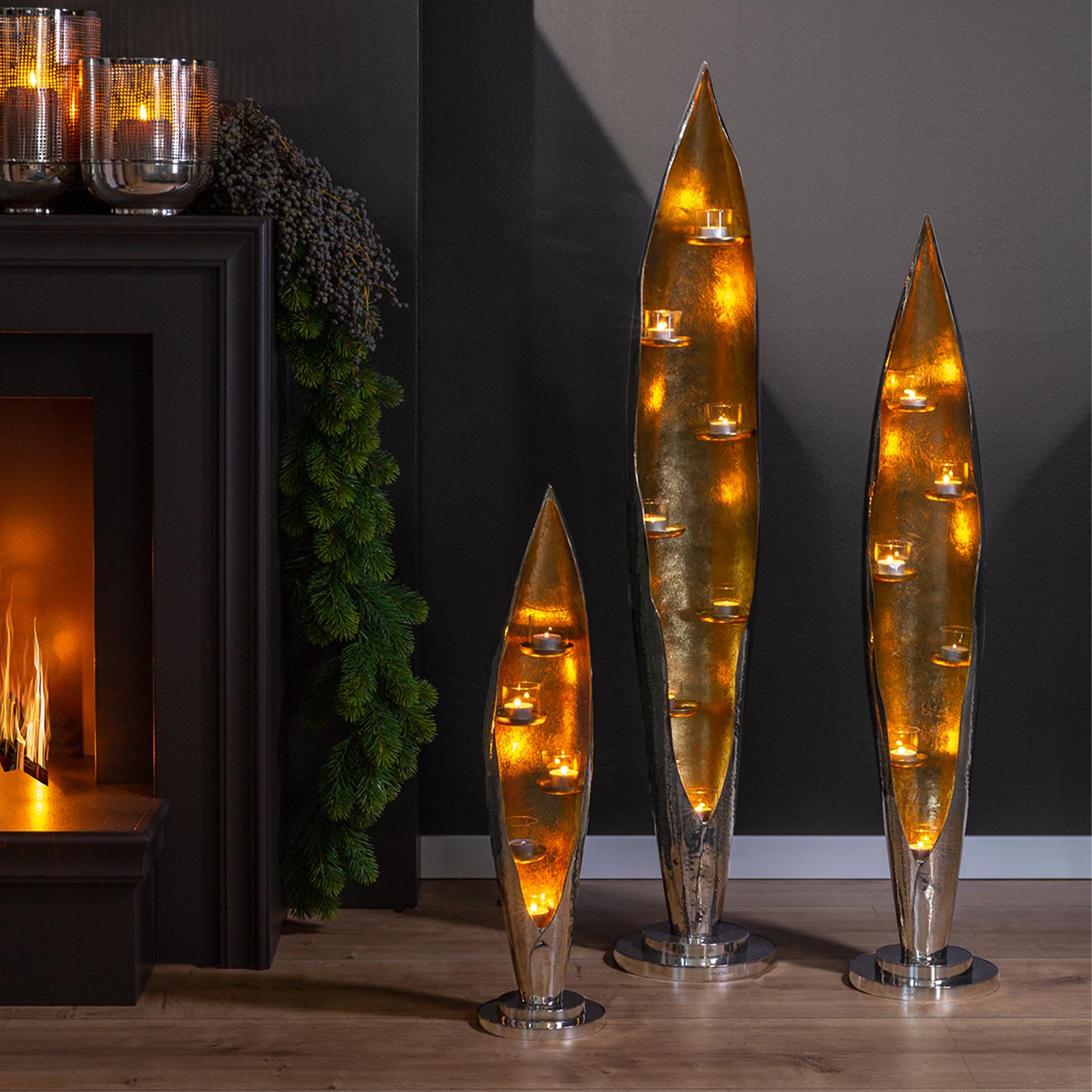 • Länge ca.: 18 cm • Breite ca.: 18 cm • Höhe ca.: 70 cm • Durchmesser ca.: 18 cm • Serie: Fink Living • Kapazität: für 5 Teelichter • Material: Aluminium • Material 1: Glas • Beschichtung: Foliengold • Veredelung: vernickelt • Oberfläche: glänzend poliert • Oberfläche Details: gehämmert außen • Farbe: silber • Eigenschaft: mit 5 Teelicht-Gläser • Form: säulenform • Dimension: groß • Look & Stil: innen goldfarben • Umgebungsnutzung: Für Innenbereich • Nutzungsbereich: Fußboden im Wohnzimmer oder Esszimmer • Besonderheit: für LED Leuchten / Kerzen geeignet