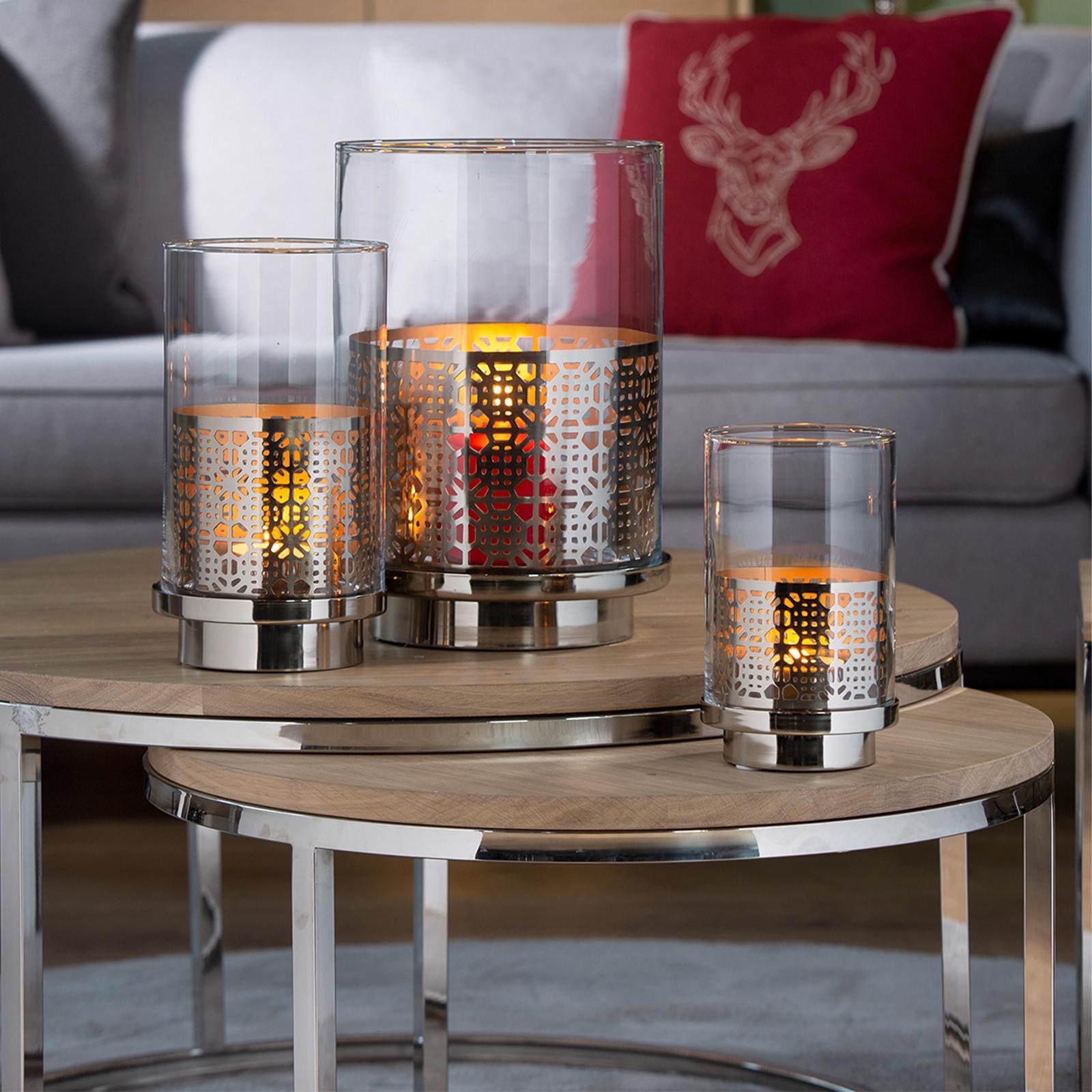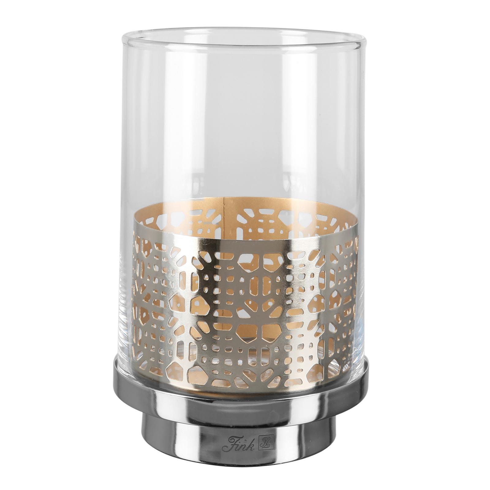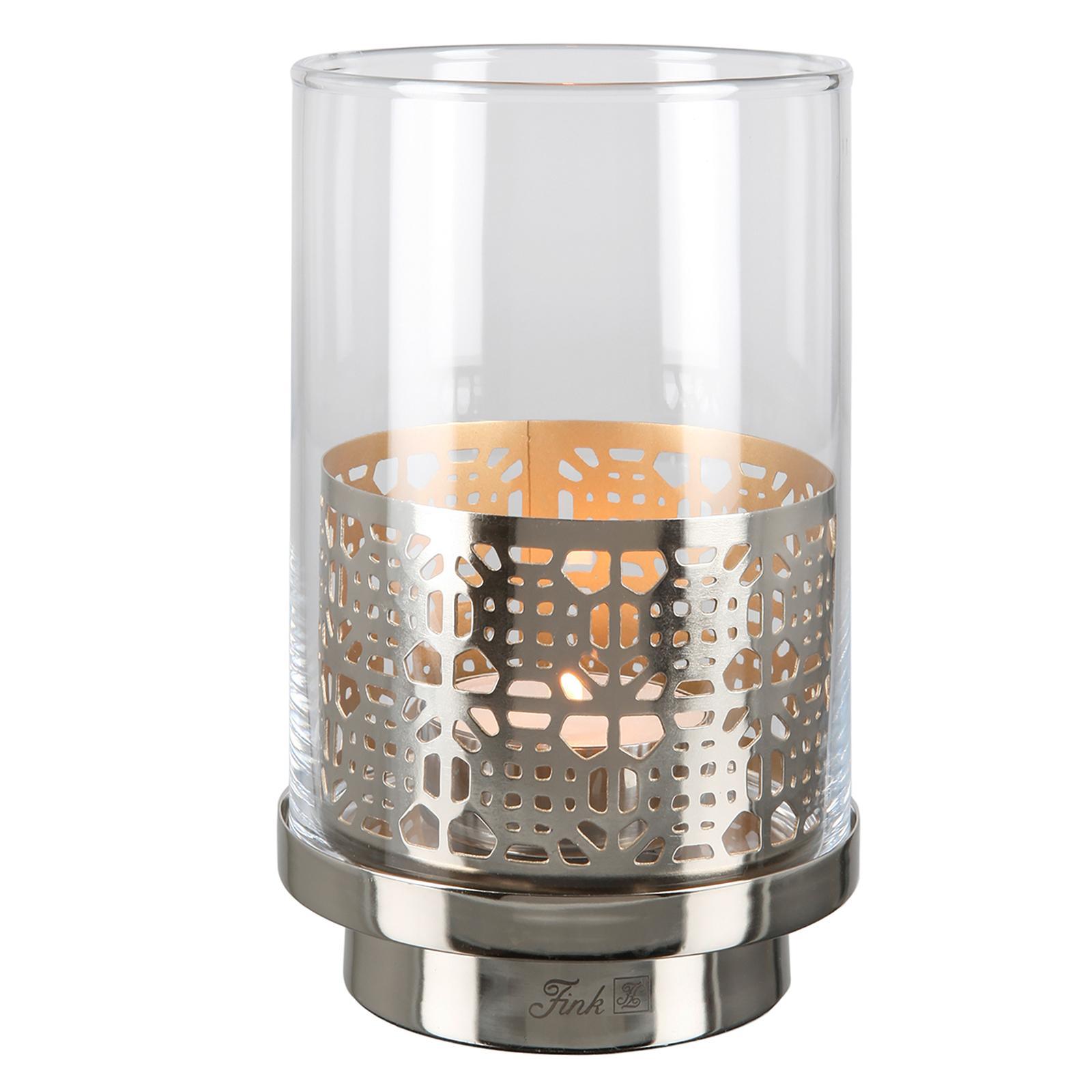 • Länge ca.: 12,6 cm • Breite ca.: 12,6 cm • Höhe ca.: 20,5 cm • Durchmesser ca.: 12,6 cm • Serie: Fink Living • Kapazität: für 1 Stumpenkerze Ø 8 cm • Material: Eisen • Material 1: Glas • Veredelung: vernickelt • Oberfläche: glänzend poliert • Oberfläche Details: glatt • Farbe: silber • Eigenschaft: mit Aufsatz-Glaszylinder • Ausstattung: mit Standfuß • Ausstattung 1: ausgestanzte Muster • Form: rund • Dimension: klein • Look & Stil: goldfarbenes Finish innen • Umgebungsnutzung: Für Innenbereich • Anlass: Saisonale & thematische Deko, Gartenabende, Geschenkidee • Nutzungsbereich: Sideboard, Fensterbank, Tischdekoration, Anrichte • Besonderheit: für LED Leuchten / Kerzen geeignet • Gewicht ca.: 2,8 Kg