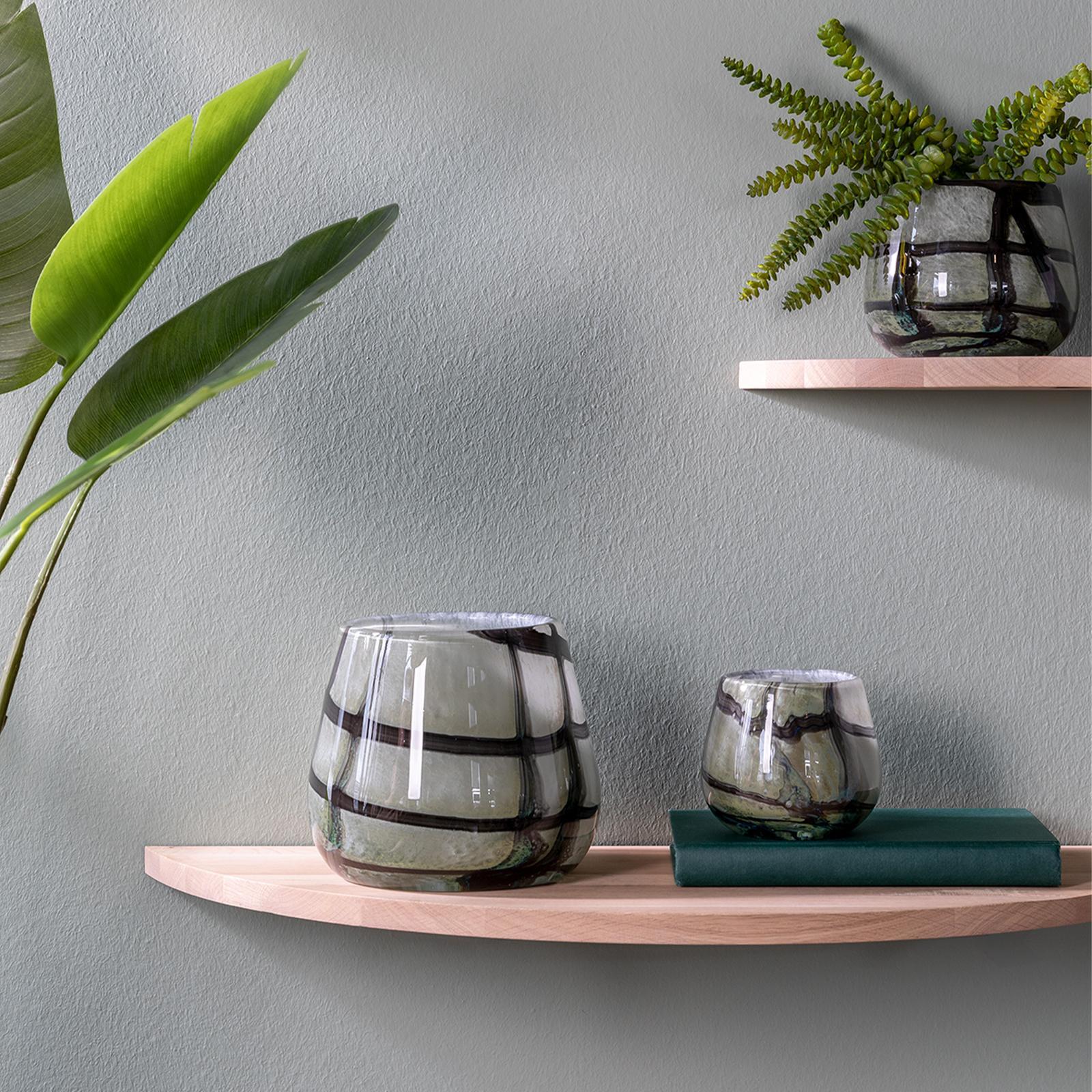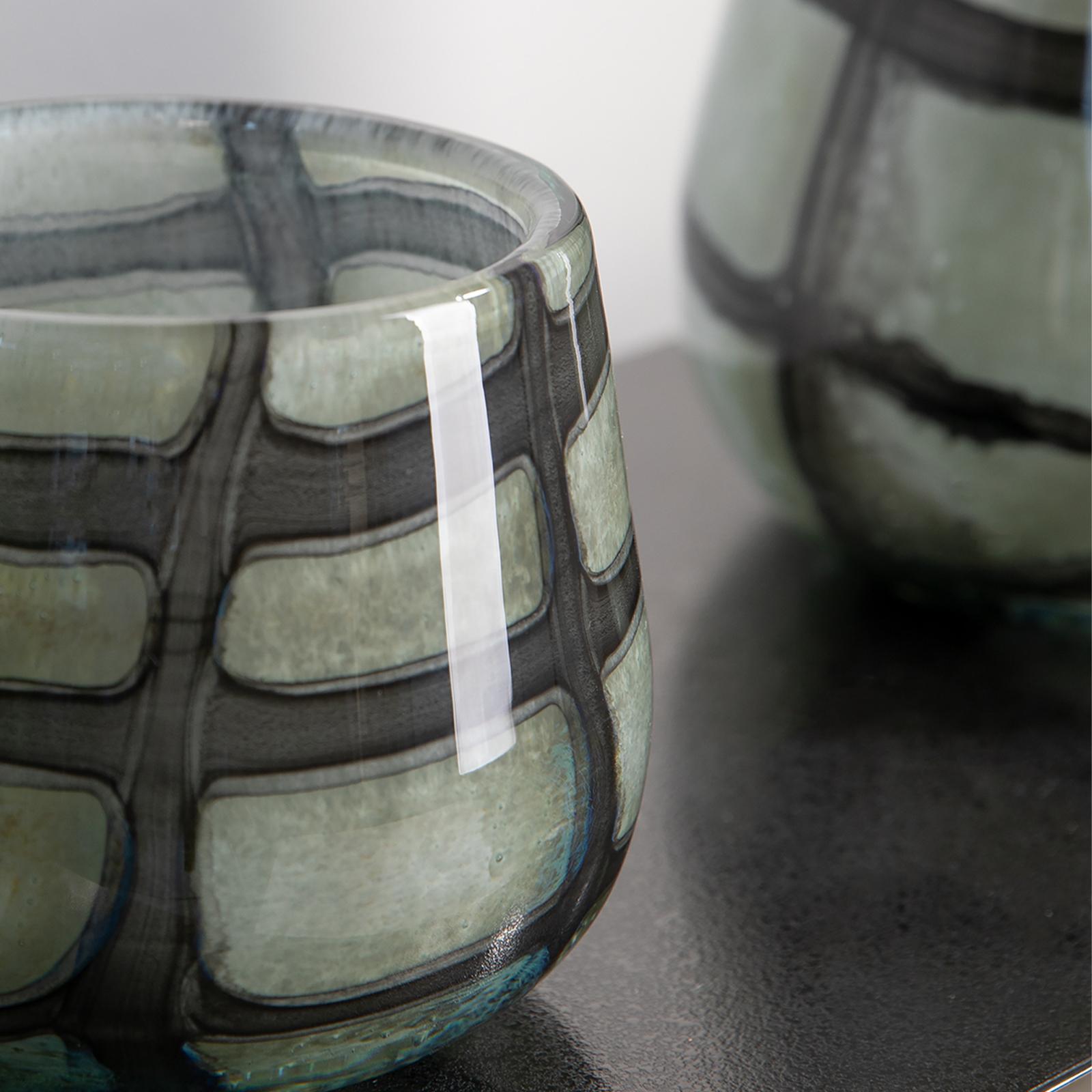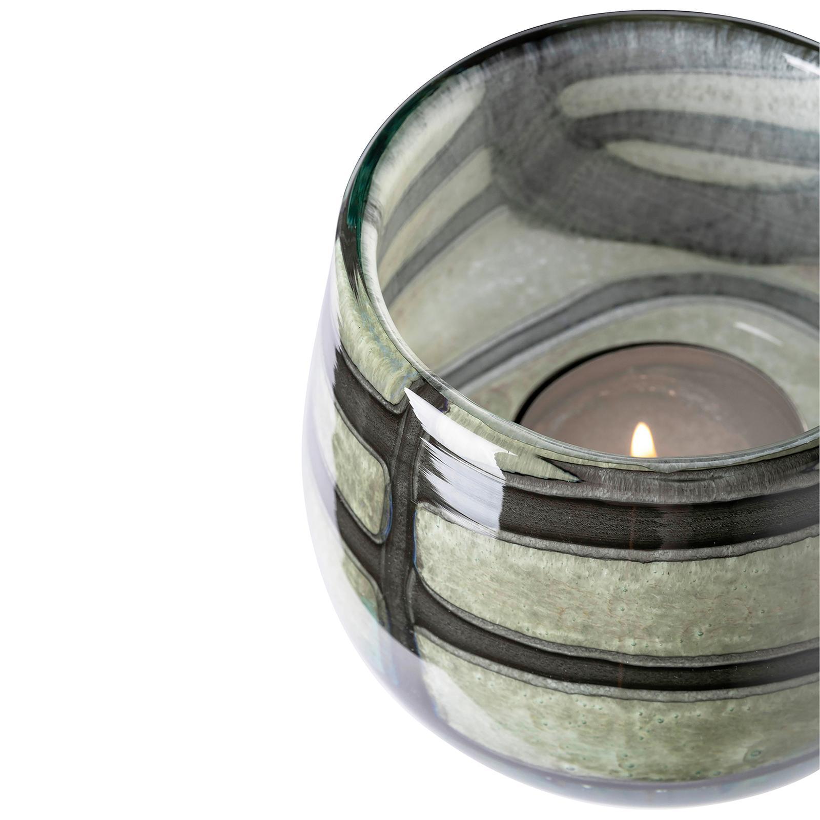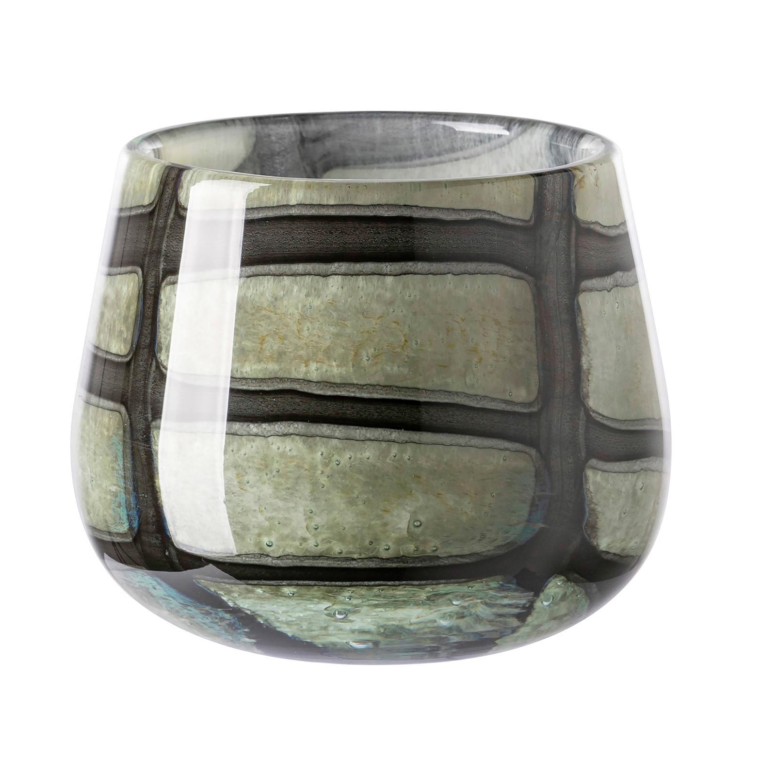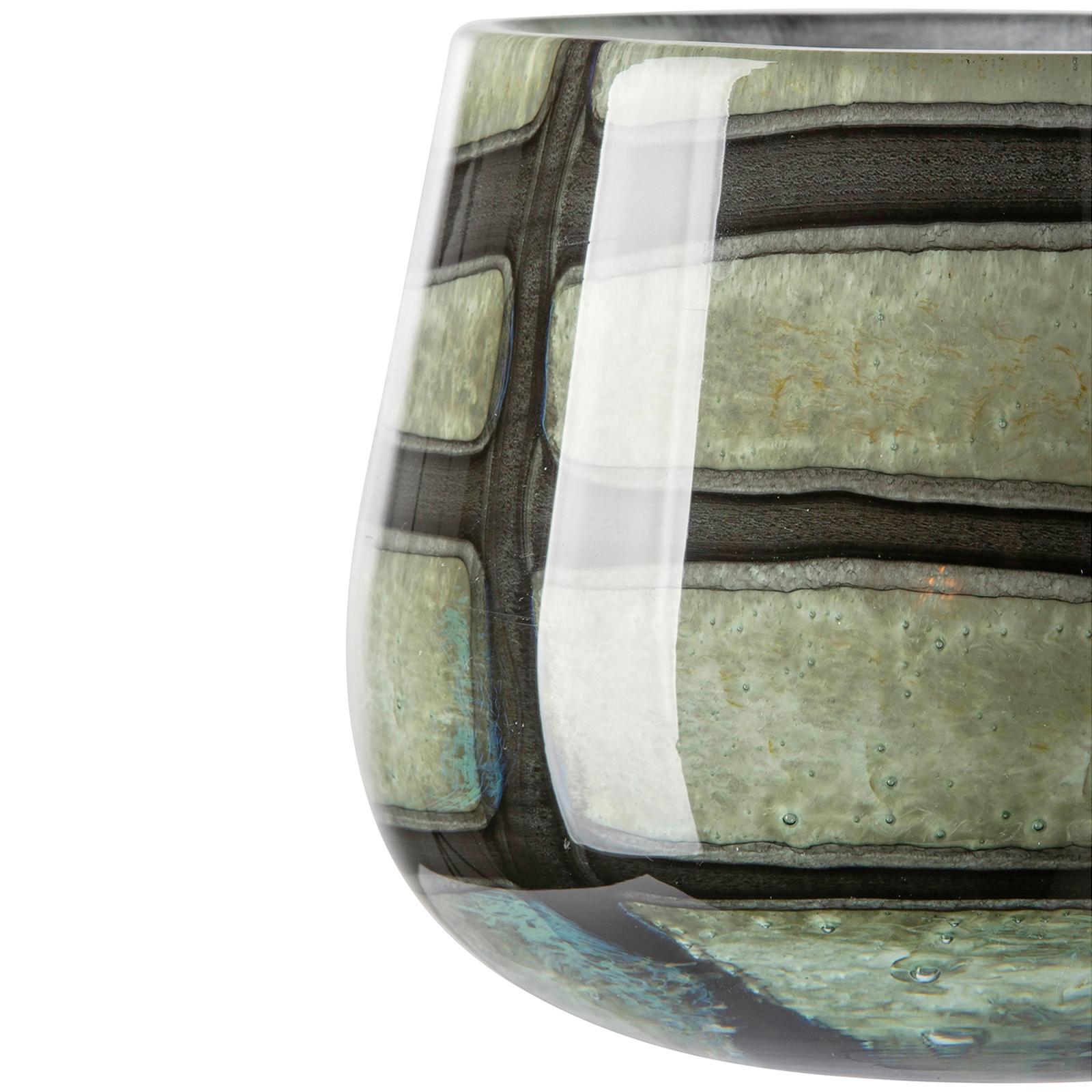 ✓ Handgefertigtes Glas-Windlicht Ø 11 cm mit grün-schwarzem Muster & detailreicher Oberflächenoptik ✓ Eine feine Puder-Technik erzeugt sanfte Salbei-Färbung mit markantem Dekor zu einem echten Unikat ✓ Nutzbar als Windlicht oder kleine Blumenvase - ein stilvoller Akzent für Tisch, Regal oder Fensterbank ✓ Eloquenter Handmade-Charakter trifft auf zeitlose Eleganz - ideal kombinierbar mit vielen Wohnstilen ✓ Stimmungsvolles Teelicht-Glas mit feinem Farbspiel & edler Glasqualität für ein besonderes Ambiente