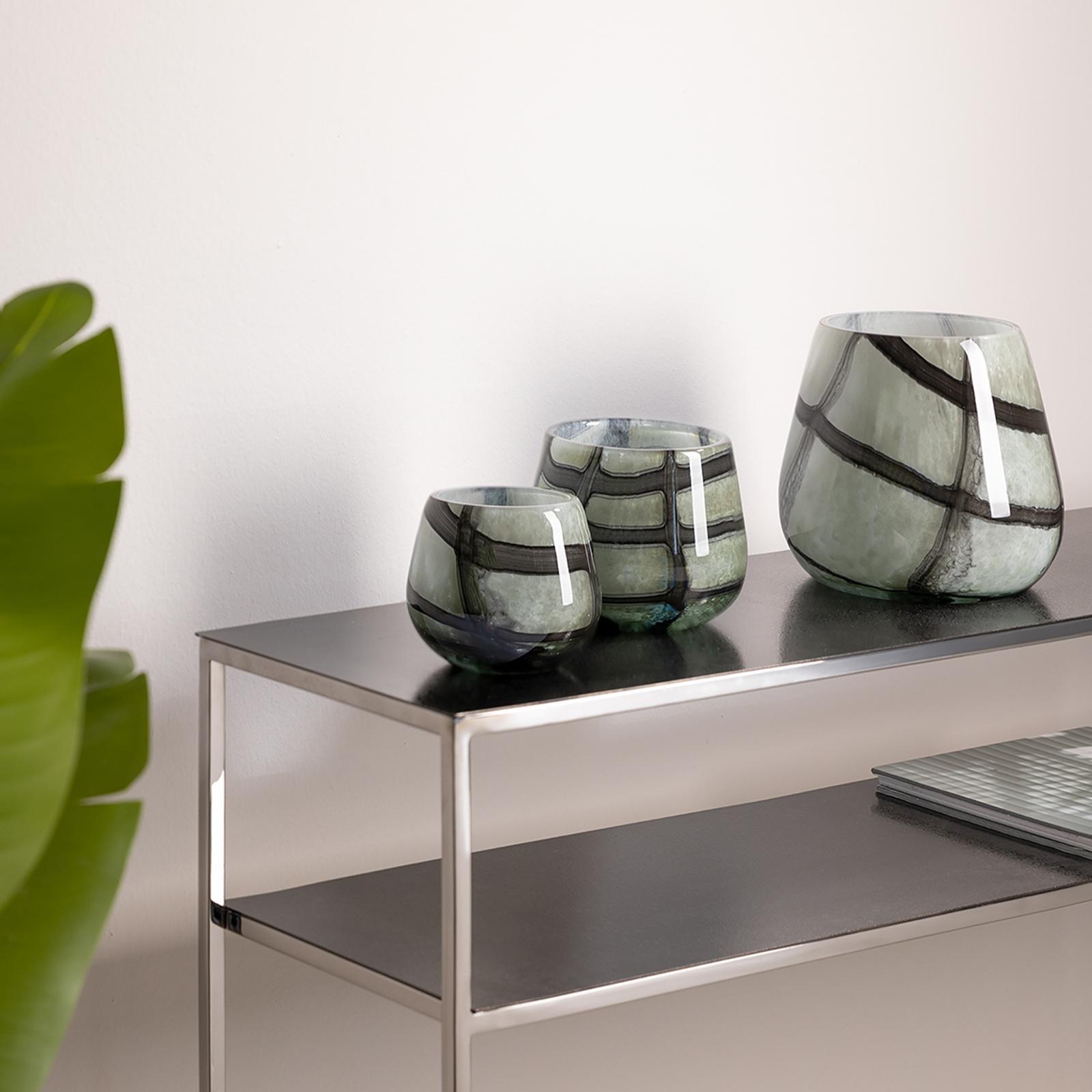 • Länge ca.: 11 cm • Breite ca.: 11 cm • Höhe ca.: 9,5 cm • Durchmesser ca.: 11 cm • Serie: Fink Living • Kapazität: für 1 Teelicht Ø 4 cm • Material: Glas • Veredelung: durchgefärbtes Glas • Oberfläche: glänzend • Oberfläche Details: glatt • Farbe: hellgrün-schwarz • Eigenschaft: auch als Vase verwendbar • Form: rund • Dimension: klein • Umgebungsnutzung: Für Innenbereich • Anlass: Saisonale & thematische Deko, Gartenabende, Geschenkidee • Nutzungsbereich: Sideboard, Fensterbank, Tischdekoration, Anrichte • Besonderheit: mundgeblasen • Besonderheit I: Unikatcharakter, Handarbeit • Gewicht ca.: 0,8 Kg