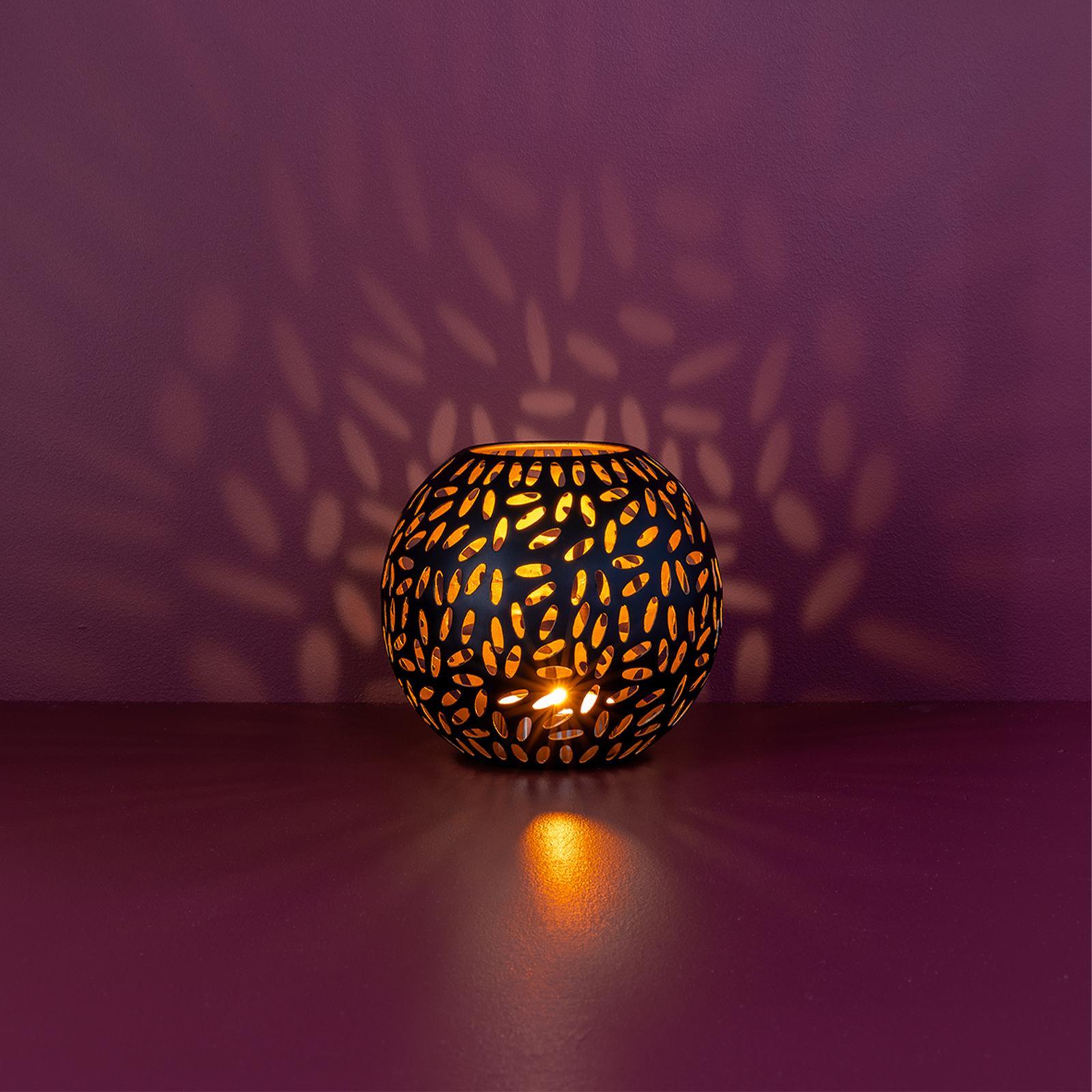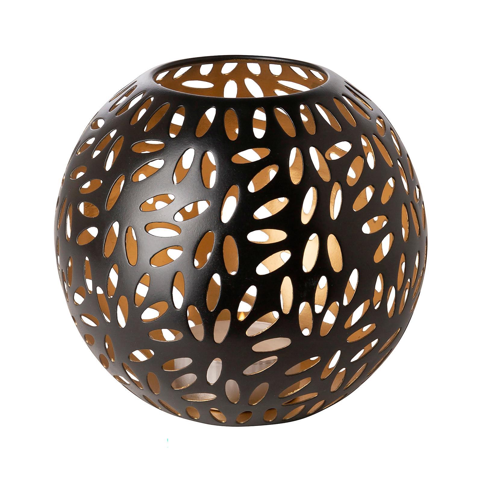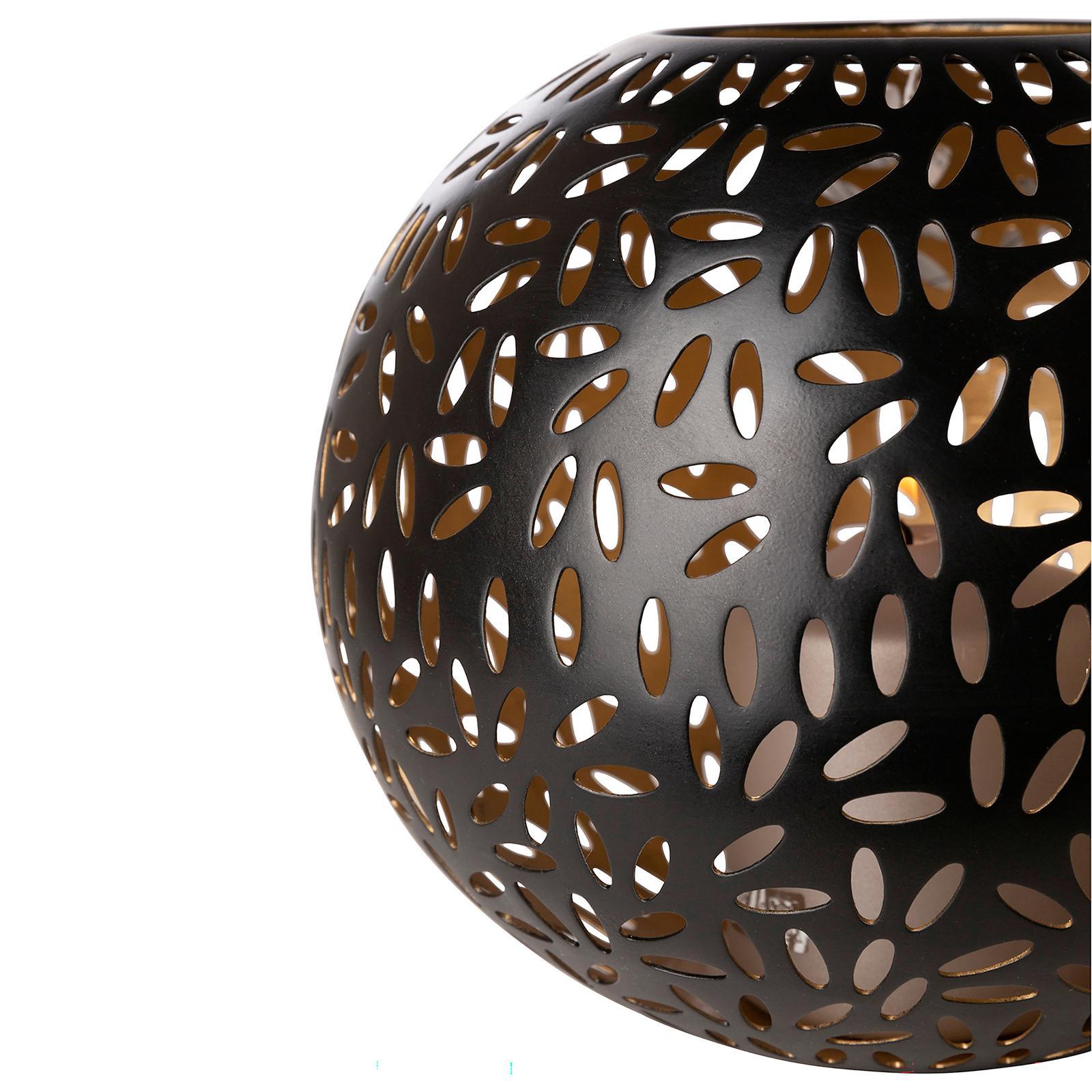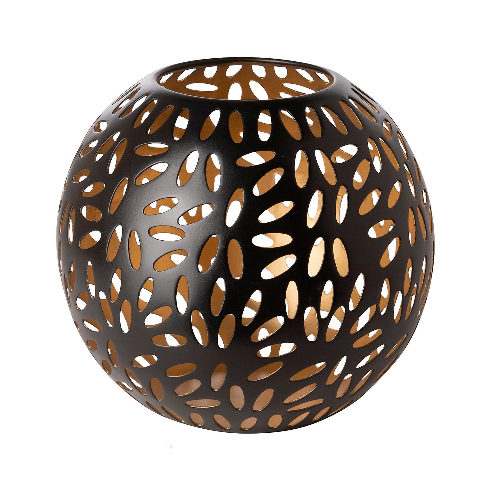 • Länge ca.: 17 cm • Breite ca.: 17 cm • Höhe ca.: 15 cm • Durchmesser ca.: 17 cm • Serie: Fink Living • Kapazität: für 1 Teelicht Ø 4 cm • Material: Eisen • Beschichtung: pulverbeschichtet • Oberfläche: matt • Oberfläche Details: strukturiert • Farbe: schwarz • Eigenschaft: elliptische Ausschnitte • Ausstattung: innen goldfarben • Form: rund • Dimension: klein • Umgebungsnutzung: Für Innenbereich • Anlass: Saisonale & thematische Deko, Gartenabende, Geschenkidee • Nutzungsbereich: Sideboard, Fensterbank, Tischdekoration, Anrichte • Gewicht ca.: 0,4 Kg