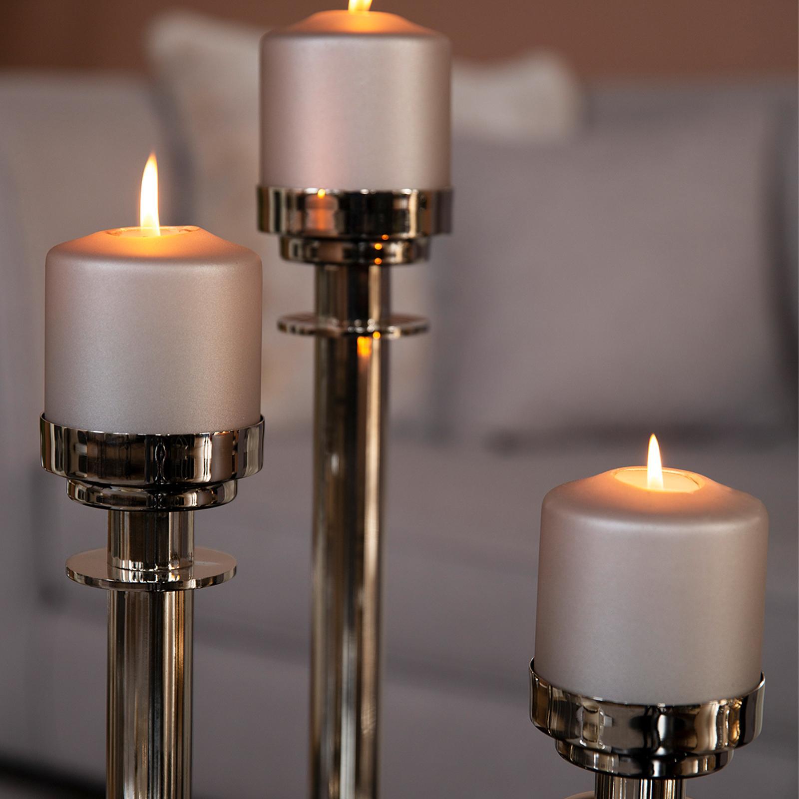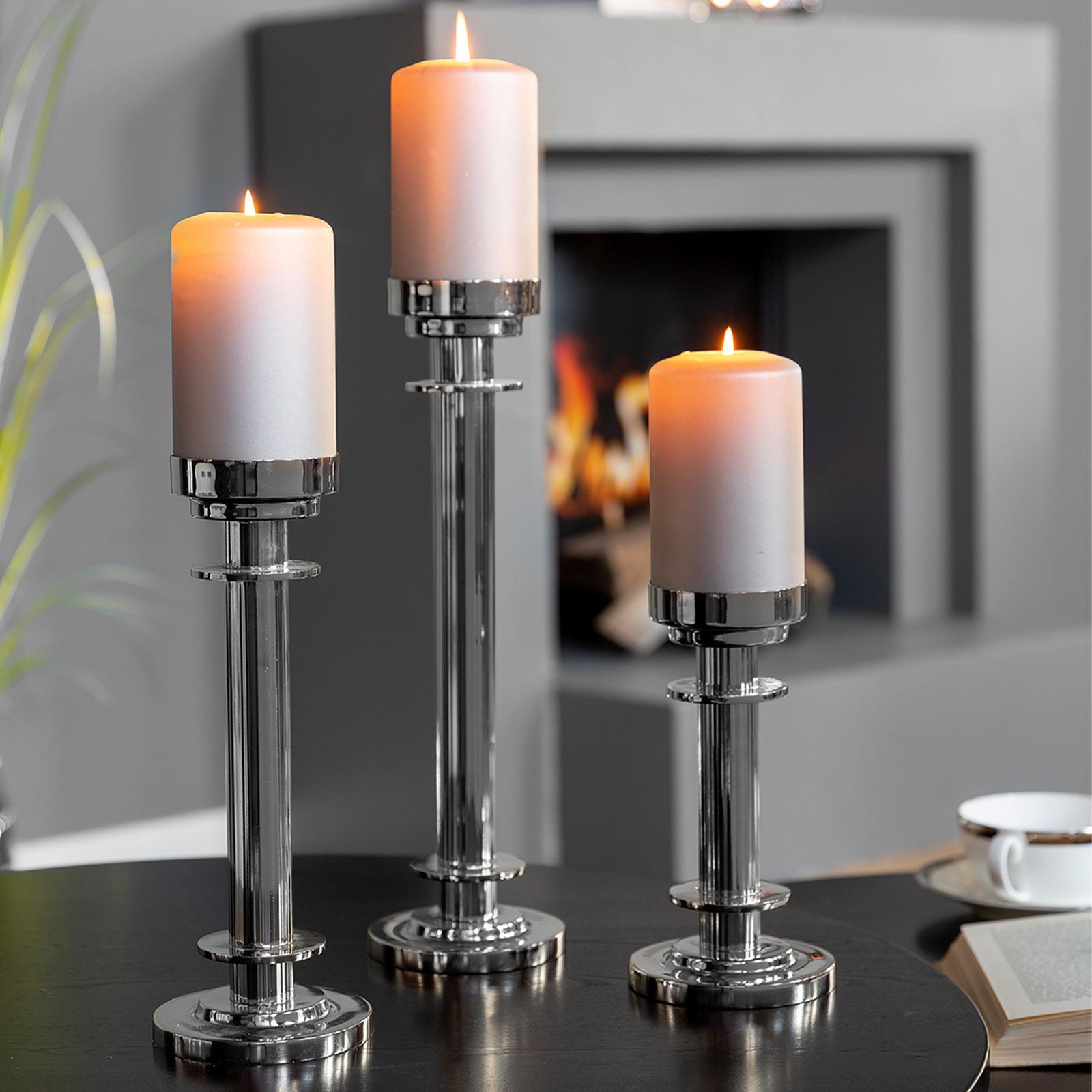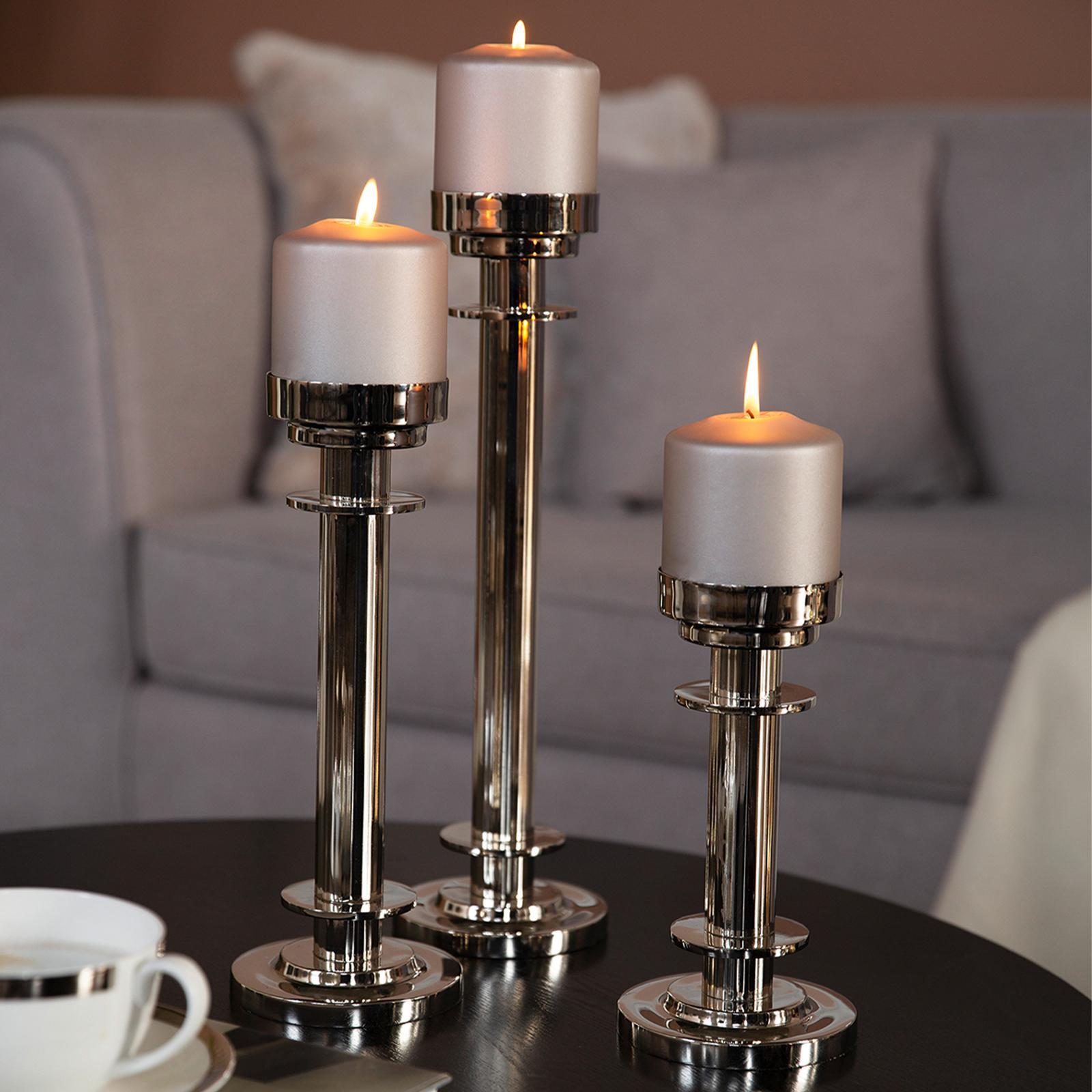• Länge ca.: 11 cm • Breite ca.: 11 cm • Höhe ca.: 29 cm • Durchmesser ca.: 11 cm • Serie: Fink Living • Kapazität: für 1 Stumpenkerze Ø 8 cm oder 1 Teelicht Ø 6 cm • Material: Edelstahl • Material 1: Eisen • Veredelung: vernickelt • Oberfläche: glänzend poliert • Oberfläche Details: glatt • Farbe: silber • Eigenschaft: ohne Aufsatz-Glaszylinder • Form: rund • Dimension: groß • Umgebungsnutzung: Für Innenbereich • Anlass: Hochzeiten, Deko, Wellnes & Entspannung, Geschenkidee • Nutzungsbereich: Tischdekoration, Buffets, Wohnzimmer • Gewicht ca.: 0,74 Kg