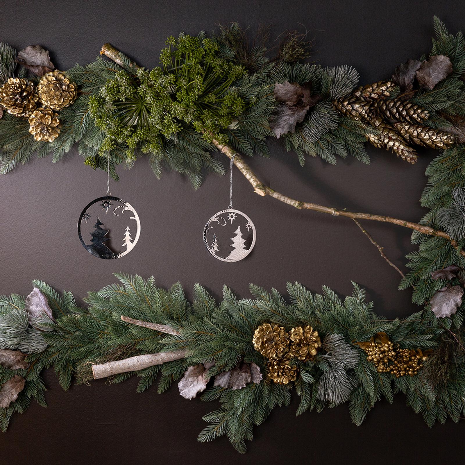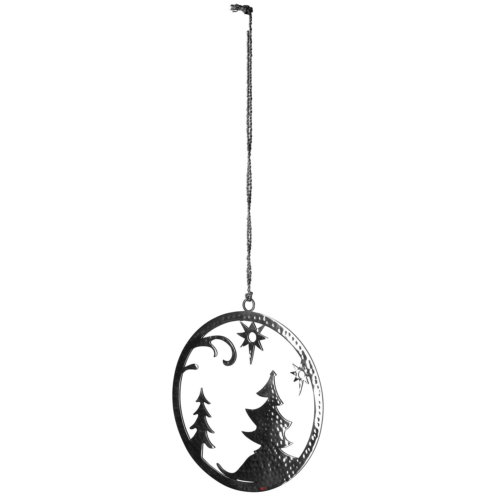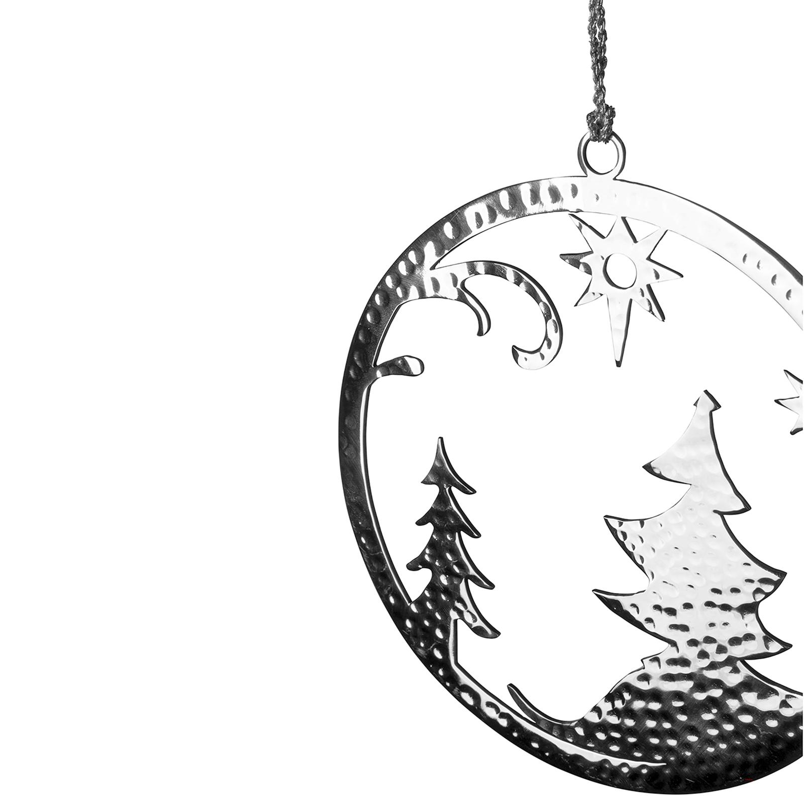 • Länge ca.: 18 cm • Breite ca.: 0,2 cm • Höhe ca.: 18 cm • Durchmesser ca.: 18 cm • Serie: Fink Living • Material: Edelstahl • Oberfläche: glänzend poliert • Oberfläche Details: gehämmert • Farbe: silber • Eigenschaft: traditionelle, aufwendige Handarbeit • Ausstattung: mit silberfarbener Kordel • Platzierungsart: zum Aufhängen • Form: rund • Dimension: groß • Motiv-Design: Tannen • Look & Stil: Winterlandschaft innen • Umgebungsnutzung: Für Außenbereich und Innenbereich • Anlass: Weihnachten, Nikolaus, Adventszeit • Nutzungsbereich: Fensterdeko, Türkränze, Geschenk, am Weihnachtsbaum • Gewicht ca.: 1,2 Kg