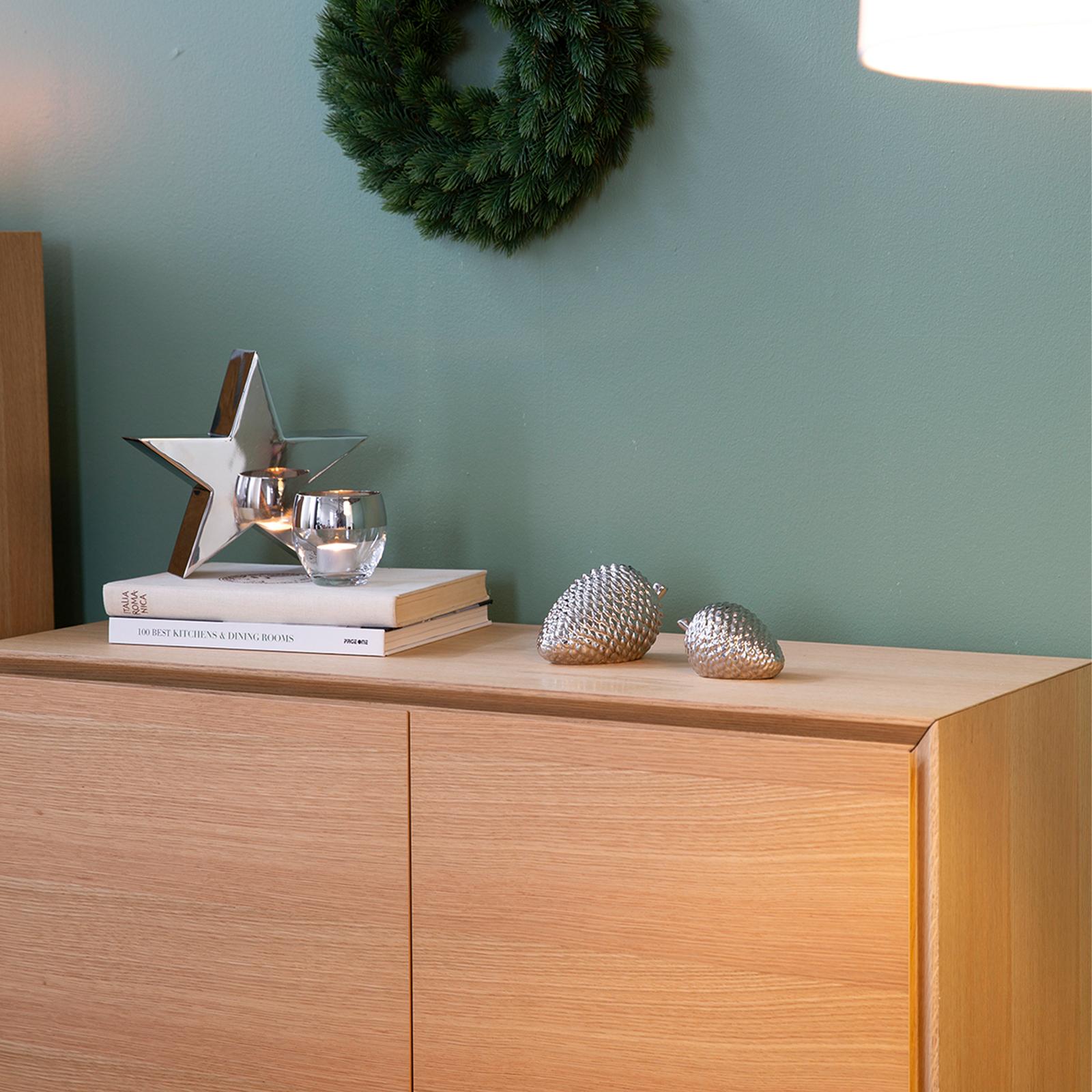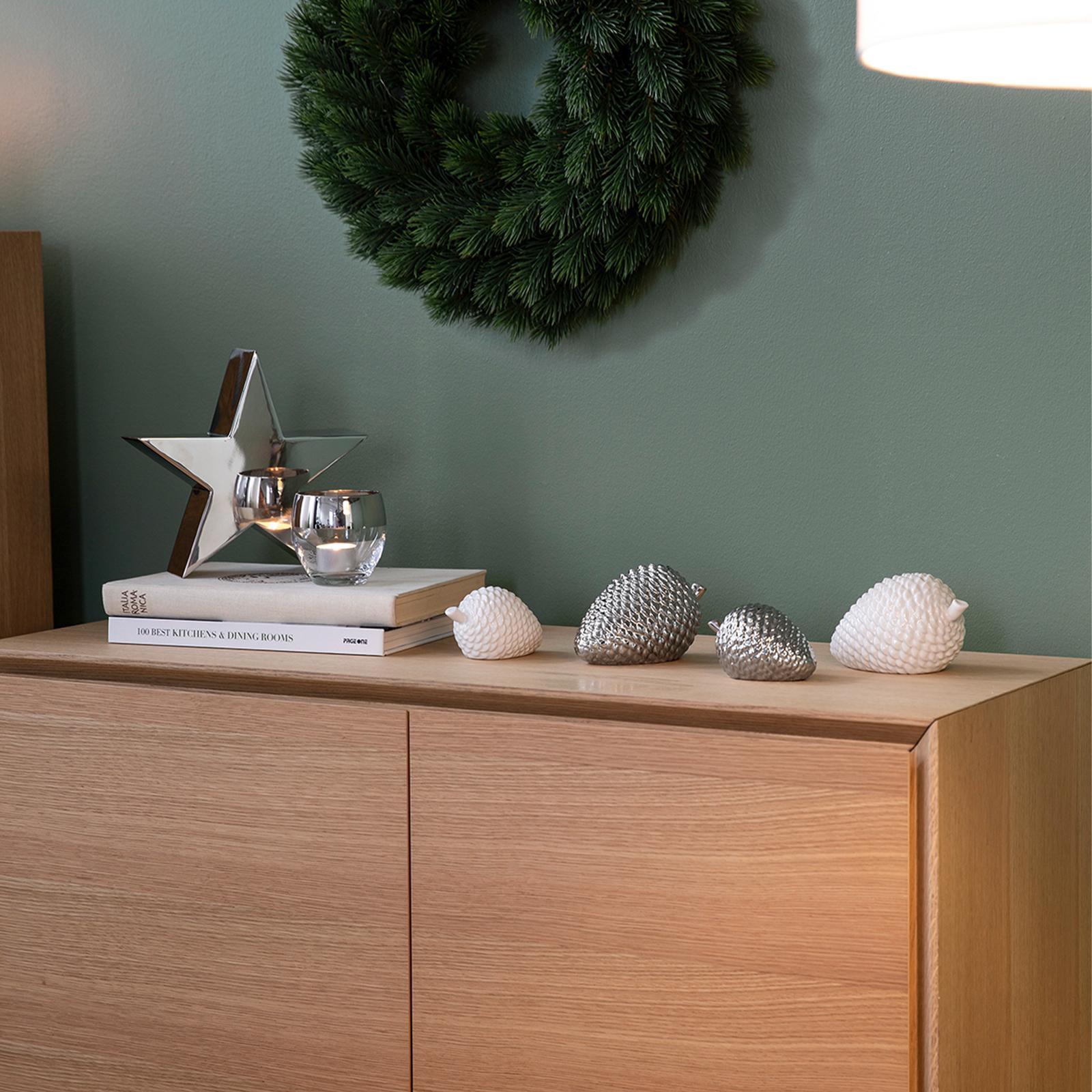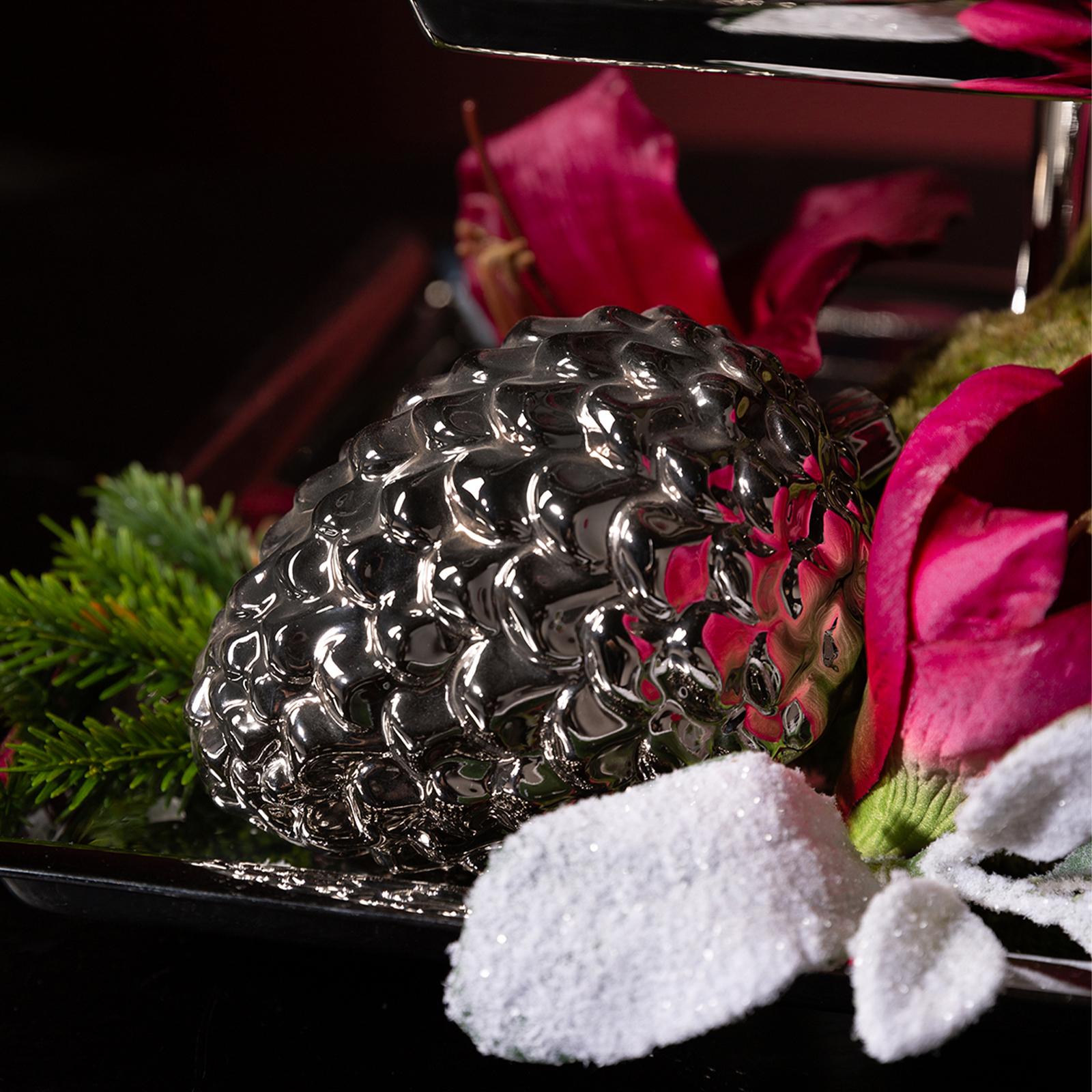Dieser Zapfen aus silberfarbenem Porzellan mit einer Höhe von 15 cm bringt einen festlichen Glanz in Ihr Zuhause. Durch die detailreiche Gestaltung erinnert er an die natürliche Form eines Tannenzapfens, wirkt jedoch durch die glänzende Oberfläche modern und dekorativ. Damit eignet er sich hervorragend als eleganter Akzent für die Winter- und Weihnachtszeit. Seine kompakte Größe macht ihn besonders vielseitig einsetzbar. Ob auf der festlich gedeckten Tafel, als dekoratives Detail auf der Fensterbank oder als Teil eines weihnachtlichen Arrangements, der silberne Zapfen fügt sich harmonisch in verschiedene Umgebungen ein. Auch in Kombination mit Kerzen, Tannenzweigen oder weiteren Porzellanfiguren entfaltet er seine volle Wirkung und sorgt für ein stimmungsvolles Gesamtbild. Durch die dezente Farbgebung passt er sowohl zu klassischem Interieur als auch zu modernen Wohnkonzepten. Die glatte, glänzende Oberfläche reflektiert das Licht und setzt kleine Akzente, die für eine warme und festliche Atmosphäre sorgen. Ob als einzelnes Dekostück oder als Teil einer Gruppe, dieser Porzellan-Zapfen verleiht jedem Raum eine besondere Note und bietet vielfältige Möglichkeiten für kreative Dekorationen, die weit über die Adventszeit hinaus Freude bereiten.
