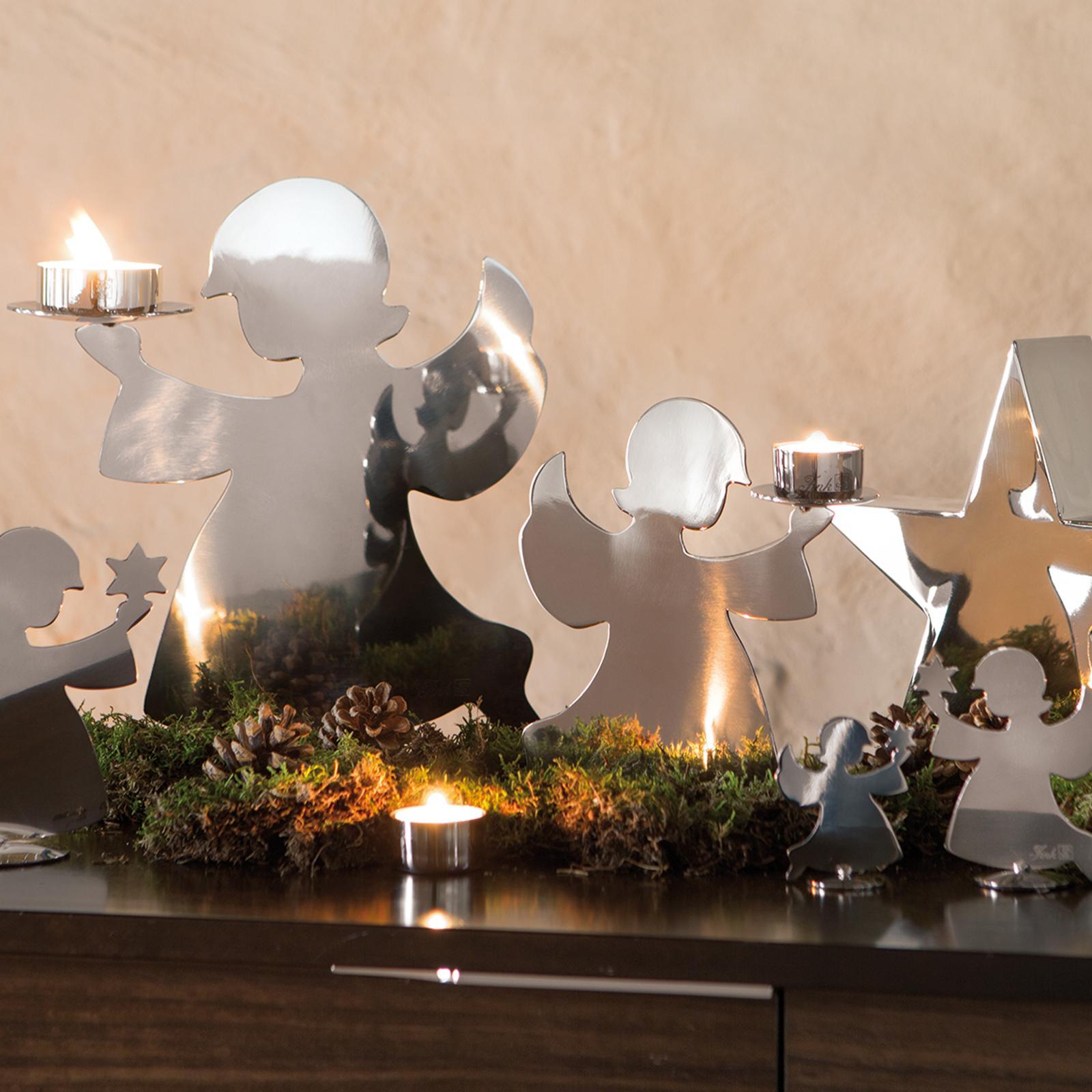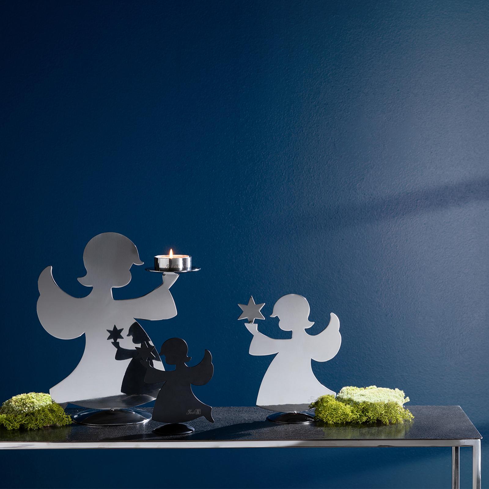 • Länge ca.: 18 cm • Breite ca.: 9 cm • Höhe ca.: 20 cm • Serie: Fink Living • Kapazität: für 1 Teelicht • Material: Edelstahl • Oberfläche: glänzend poliert • Oberfläche Details: glatt • Farbe: silber • Dimension: mittel • Motiv: Engel • Umgebungsnutzung: Für Außenbereich und Innenbereich • Anlass: Weihnachten, Nikolaus, Adventszeit • Besonderheit: Fink Design • Gewicht ca.: 0,4 Kg