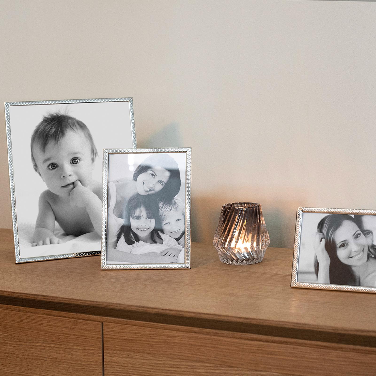 Dieser Bilderrahmen verbindet klassische Eleganz mit dezenten Gestaltungselementen und setzt Fotos im Format 13x18 cm geschmackvoll in Szene. Die feine Musterleiste verleiht dem Rahmen eine zarte Struktur, die zurückhaltend wirkt und dennoch jedem Motiv einen besonderen Rahmen gibt. Durch die Versilberung erhält der Rahmen eine glänzende Oberfläche, die Licht dezent reflektiert und so Ihre Bilder sanft hervorhebt. Mit seinem filigranen Design eignet sich der Rahmen sowohl für moderne als auch traditionelle Wohnumgebungen. Er passt auf den Schreibtisch, das Regal oder das Sideboard ebenso gut wie an die Wand. Ob Familienfoto, Urlaubsaufnahme oder Portrait - das Motiv rückt durch die feine Umrandung in den Mittelpunkt, ohne überladen zu wirken. Besonders die subtile Verzierung bringt eine leichte nostalgische Note mit, die an klassische Bilderrahmen erinnert, dabei aber modern interpretiert ist. So entsteht ein stilvolles Accessoire, das Erinnerungen nicht nur bewahrt, sondern sie auch auf ansprechende Weise präsentiert. Der Bilderrahmen ist vielseitig einsetzbar und fügt sich harmonisch in unterschiedliche Einrichtungsstile ein. Ob als einzelner Blickfang oder in Kombination mit weiteren Rahmen - er schafft eine warme Atmosphäre und setzt persönliche Akzente in Ihrem Zuhause.