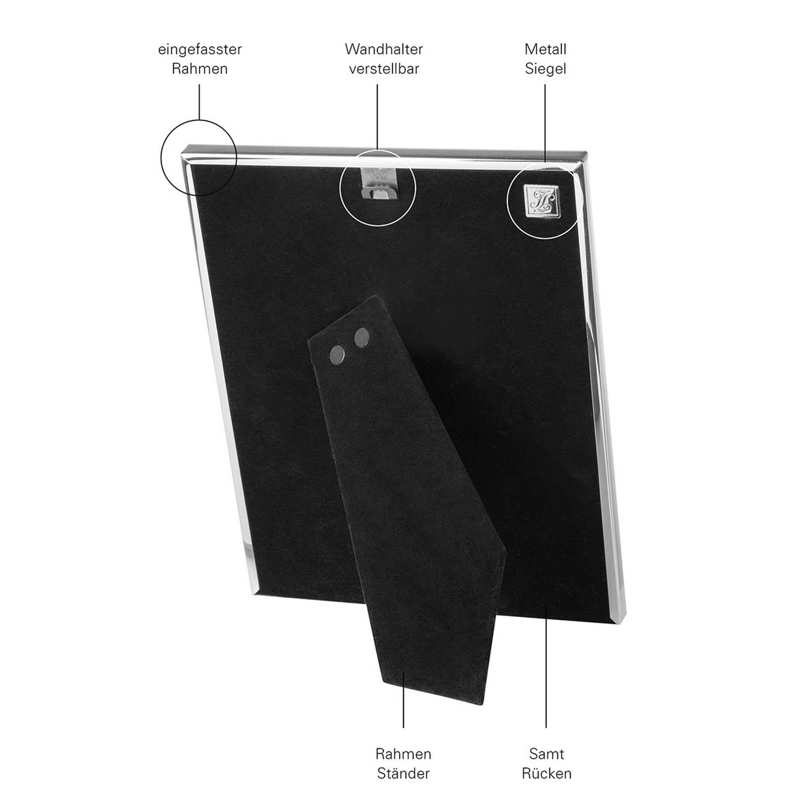 Dieser Bilderrahmen setzt Fotos im Format 10x15 cm elegant in Szene. Die glänzende Oberfläche unterstreicht die Wirkung der Aufnahmen und gibt ihnen einen edlen Rahmen, der sich harmonisch in verschiedenste Einrichtungsstile einfügt. Dank seiner schlichten Gestaltung lenkt der Rahmen nicht vom Motiv ab, sondern hebt es dezent hervor. Ob im Hoch- oder Querformat, der Rahmen lässt sich sowohl stellen als auch aufhängen und bietet dadurch flexible Einsatzmöglichkeiten. So findet er im Wohnzimmer, Büro oder Schlafzimmer ebenso seinen Platz wie in Fluren oder auf Kommoden. Durch die glatte Rückseite und den stabilen Aufsteller ist eine sichere Positionierung gewährleistet. Besonders geeignet ist der versilberte Rahmen für Erinnerungsstücke wie Hochzeitsbilder, Familienfotos oder Porträts. Auch als Geschenkidee macht er eine gute Figur, da er persönlichen Erinnerungen eine stilvolle Präsentation verleiht. Die Versilberung sorgt für eine hochwertige Optik, die gleichzeitig zeitlos wirkt. Das Material ist pflegeleicht und kann bei Bedarf einfach mit einem weichen Tuch gereinigt werden. Damit bleibt der Rahmen auch bei täglicher Nutzung lange schön. Ein dekoratives Accessoire, das besondere Momente würdig einfängt und im Alltag immer wieder in den Blick rückt.