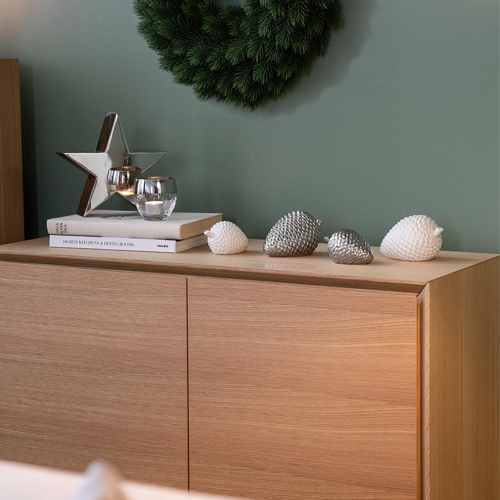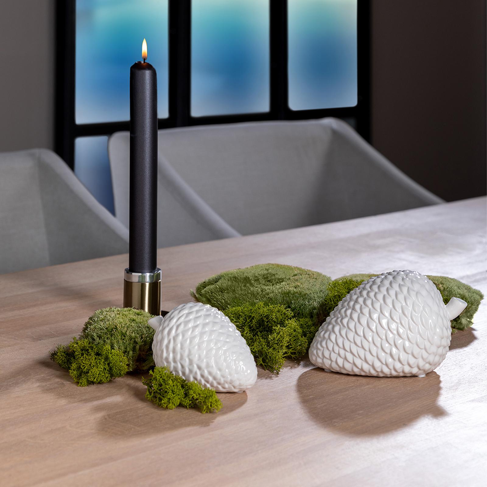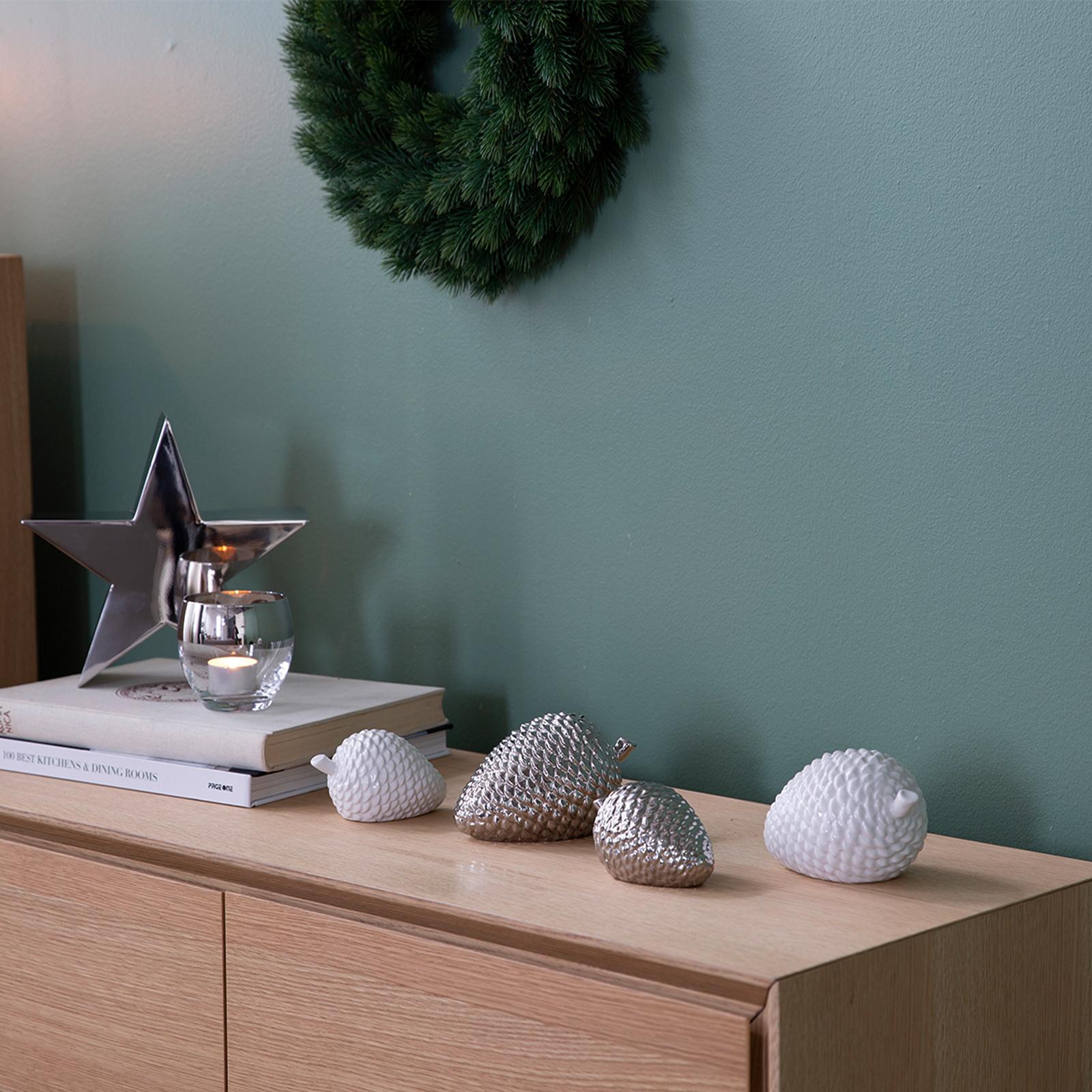 Dieser Porzellan-Zapfen mit einer Höhe von 15 cm verbindet schlichte Eleganz mit saisonaler Ausstrahlung. Die weiße Oberfläche und die feine Formgebung machen ihn zu einem dekorativen Detail, das sich in nahezu jedes Wohnambiente integrieren lässt. Besonders in den Wintermonaten entfaltet der Zapfen seine volle Wirkung und bringt einen Hauch von festlicher Stimmung in Ihr Zuhause. Dank seiner Größe lässt er sich vielseitig arrangieren - ob auf der Fensterbank, als Tischdekoration oder in Kombination mit Kerzen und Zweigen. Auch in Schalen, auf Tabletts oder in weihnachtlichen Arrangements mit anderen Porzellanfiguren kommt er gut zur Geltung. Die glatte Oberfläche setzt einen ruhigen Kontrast zu natürlichen Materialien wie Holz oder Tannengrün und unterstreicht die klare Linie moderner Dekoration. Durch die neutrale Farbgebung passt der Porzellan-Zapfen sowohl in klassische als auch in zeitgemäße Einrichtungen und bietet sich damit als flexibles Accessoire für unterschiedliche Einrichtungsstile an. Ob einzeln platziert oder als Teil einer dekorativen Gruppe, der kleine Zapfen schafft stimmungsvolle Akzente und lässt sich über die Weihnachtszeit hinaus als dezentes Wohnaccessoire nutzen.