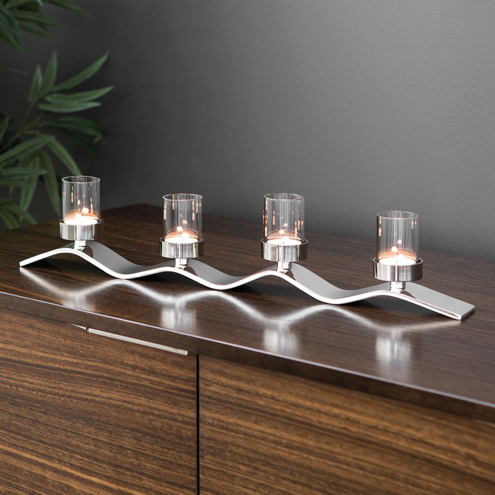 ✓ Eleganter 54 cm Teelichthalter - 4-flammiger Aluminium Kerzenständer für stilvolle Dekoarrangements ✓ Markantes Wellen-Design - geschwungene Form mit harmonischem Schwung als dekorativer Blickfang ✓ Hochwertig vernickelt & glänzend poliert, Kerzenhalter mit edler Oberfläche & luxuriöser Ausstrahlung ✓ Vielseitige Verwendung, geeignet für Teelichter & kleine Stumpenkerzen, ideal für festliche Momente ✓ Dekoratives Highlight - perfekter Kerzenleuchter für Tisch, Sideboard & auch moderne Raumgestaltung