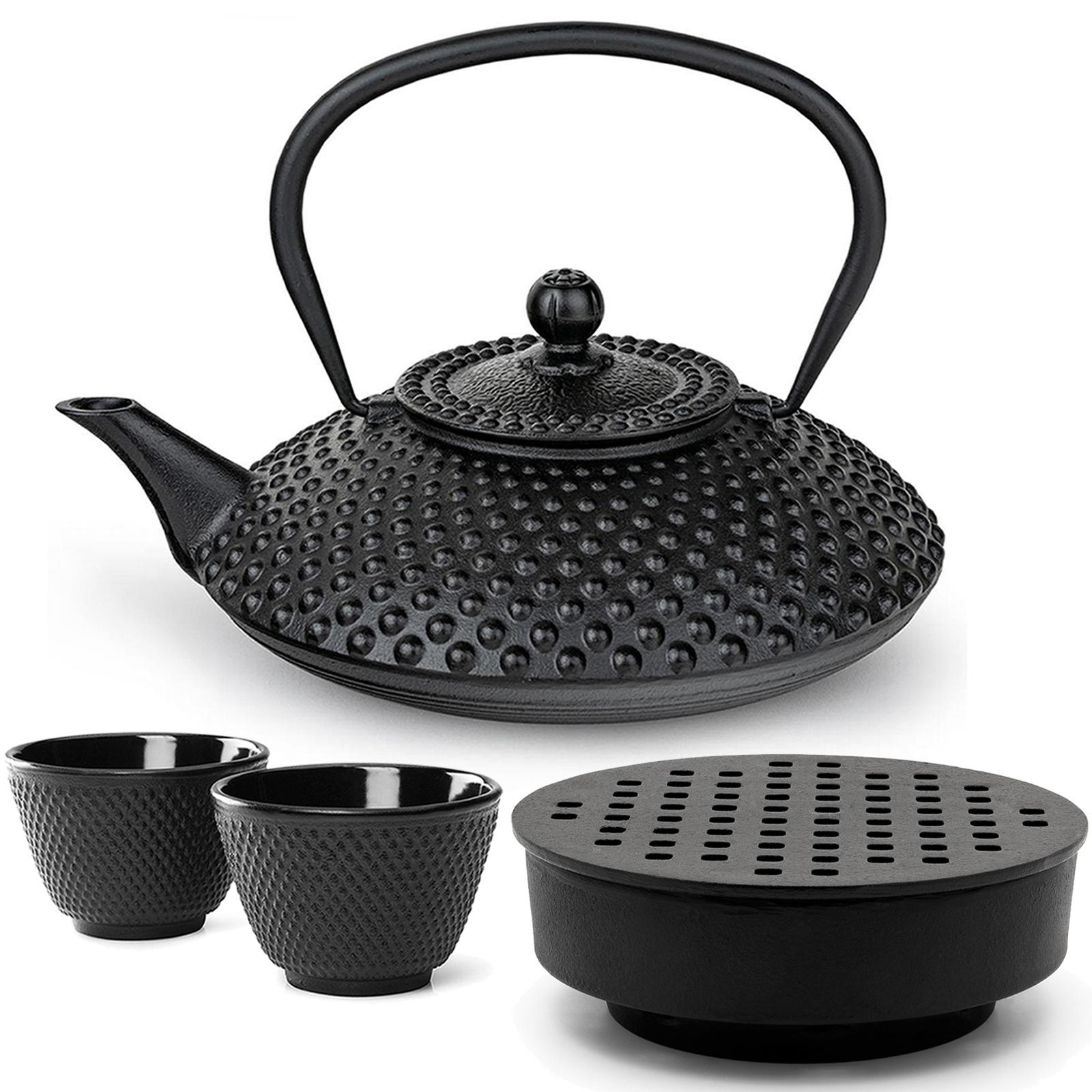 4-teiliges Teekannen-Set aus Gusseisen in flacher Formgebung und im Asien-Stil - Tradition im zeitlosen, eleganten Schwarz! Entdecken Sie den Charme fernöstlicher Teezeremonien mit diesem gusseisernen Teekannen-Set im traditionellen asiatischen Design. Das Set umfasst eine flache Gusseisen-Teekanne mit einem Fassungsvermögen von 1.25 Litern, 2 gusseiserne Teebecher und ein passender Teewärmer für ein Teelicht. Dieses Ensemble verbindet zeitloses Design mit herausragender Funktionalität und bietet ein harmonisches Erlebnis für Teeliebhaber. Die massive, induktive Gusseisen-Teekanne hält Ihren Tee besonders lange warm und sorgt für ein genussvolles Trinkerlebnis. Die emaillierte Innenseite verhindert, dass Aromen in das Material eindringen, und bewahrt so den reinen Geschmack Ihrer Teespezialitäten. Die flache, rundliche Form der Gussteekanne sorgt für eine gleichmäßige Verteilung der Aromen. Dadurch kann sich der Geschmack Ihres Tees optimal entfalten, was jeden Schluck zu einem besonderen Genuss macht. Ein herausnehmbarer Teefilter aus hochwertigem Edelstahl ermöglicht die einfache Zubereitung loser Teesorten. Egal, ob Sie feine Kräutermischungen, grünen Tee oder kräftigen Schwarztee bevorzugen - dieser Filter macht die Zubereitung unkompliziert und einfach. Die induktionsfähige Teekanne im tiefen Schwarz ist nicht nur ein optisches Highlight, sondern auch äußerst vielseitig einsetzbar. Sie ist für alle Herdarten geeignet, einschließlich Induktions- und Gaskochfeldern. Das macht die 1250 ml Gusskanne zu einem flexiblen Begleiter in jeder Küche. Die 2 gusseisernen Teebecher, die in diesem Set enthalten sind, runden das Erlebnis ab. Mit ihrer robusten Verarbeitung und der asiatischen Optik passen sie perfekt zur Teekanne. Die genoppte Oberfläche sorgt nicht nur für ein stilvolles Design, sondern auch für eine angenehme Haptik beim Genuss Ihres Tees. Der im Set enthaltene Teewärmer aus Gusseisen macht dieses Teekannen-Set zu einem besonderen Highlight. Es wurde speziell für ein Teelicht gestaltet, das Ihren Tee über längere Zeit warmhält und dabei eine stimmungsvolle Atmosphäre schafft. Mit seinem traditionellen asiatischen Design und der hochwertigen Verarbeitung ist es nicht nur funktional, sondern auch ein dekoratives Element auf jedem Tisch. Mit der richtigen Pflege bleibt dieses hochwertige Gusseisen-Set über viele Jahre hinweg ein zuverlässiger und ästhetischer Begleiter. Es eignet sich hervorragend für Ihre persönliche Teezeremonie und bietet sich ebenso als edles Geschenk an. Diese flache Teekanne aus Gusseisen kombiniert traditionelles asiatisches Design mit moderner Funktionalität und ist die perfekte Wahl für alle, die Wert auf Qualität, Langlebigkeit und Stil legen. Lassen Sie sich von diesem Gusseisen Tee-Set inspirieren und genießen Sie Tee auf die kunstvollste Weise!