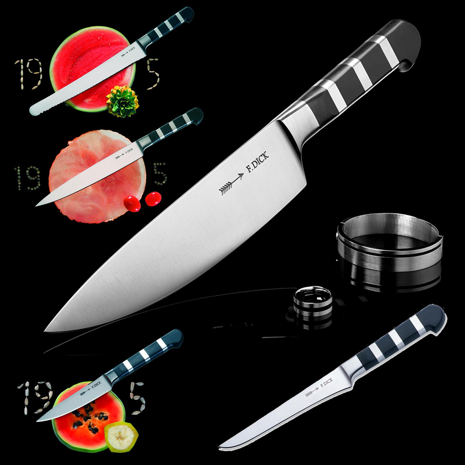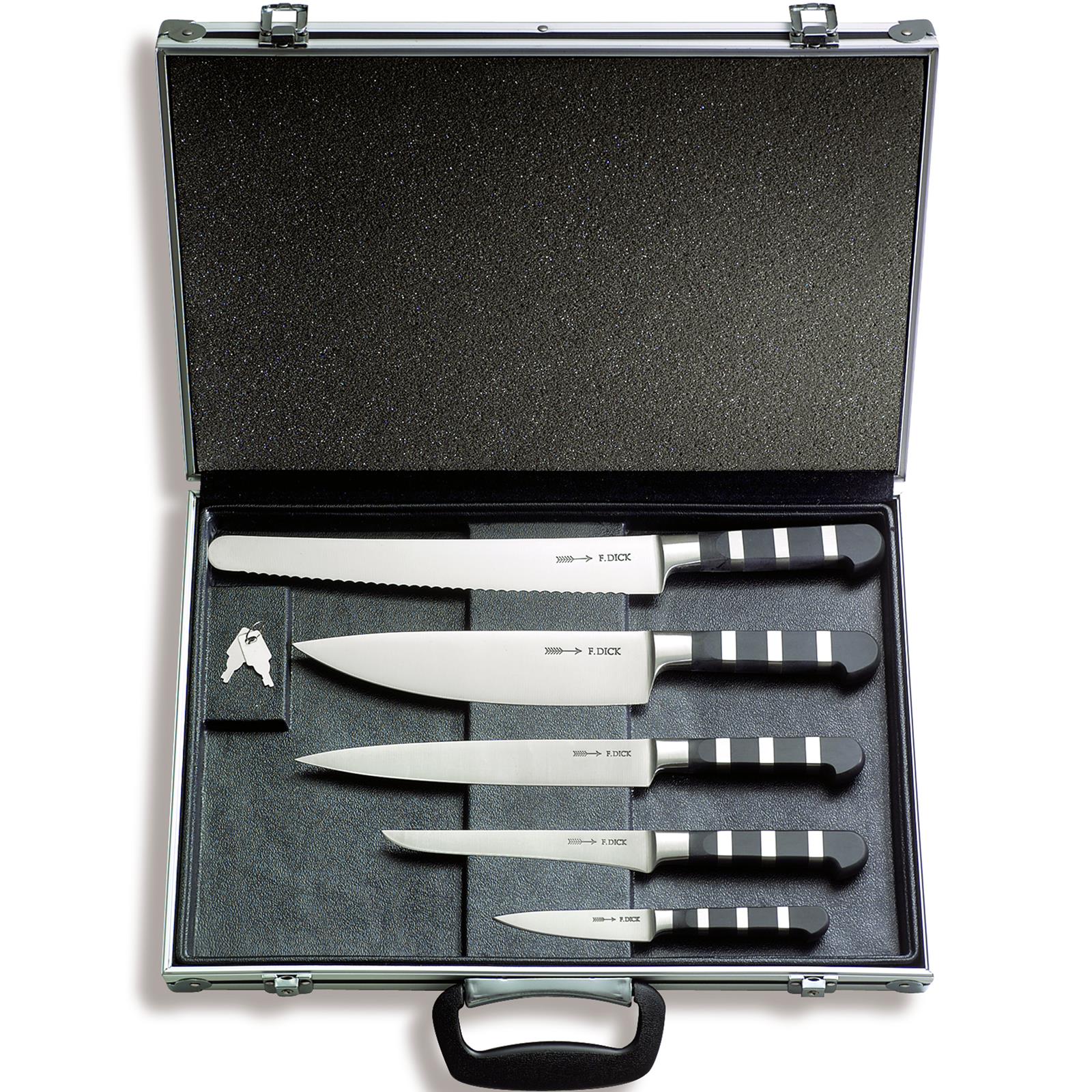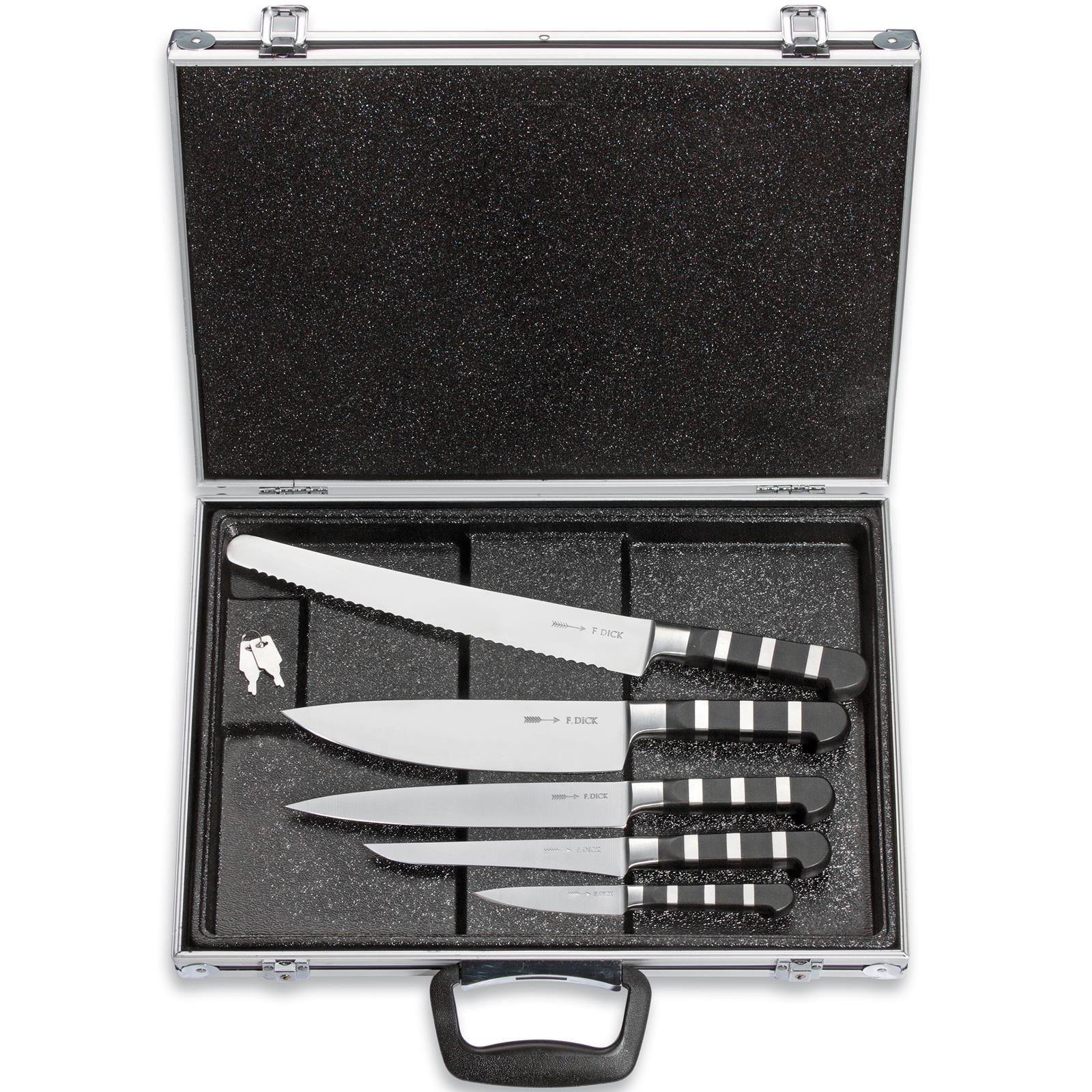 Hervorragender 5 teiliger Messer-Satz im Kochkoffer von Fr. Dick - Qualität, die man spüren und auf die man sich verlassen kann - von Profis für Profis. Dieser geräumige magnetische Alu Kochkoffer beinhaltet die Messer-Grundlage eines jeden Hobbykochs oder Profikochs aus der geschmiedeten Design-Serie "1905". An der integrierten magnetischen Einlage bleiben die Klingen Ihrer Messer unbedenklich haften und können somit auch während Sie unterwegs sind nicht zerstört werden. Dank des Schaumstoffes im Kofferdeckel des abschließbaren Messerkoffers sind Ihre Lieblingsmesser darüber hinaus vor Stößen oder Staub geschützt.