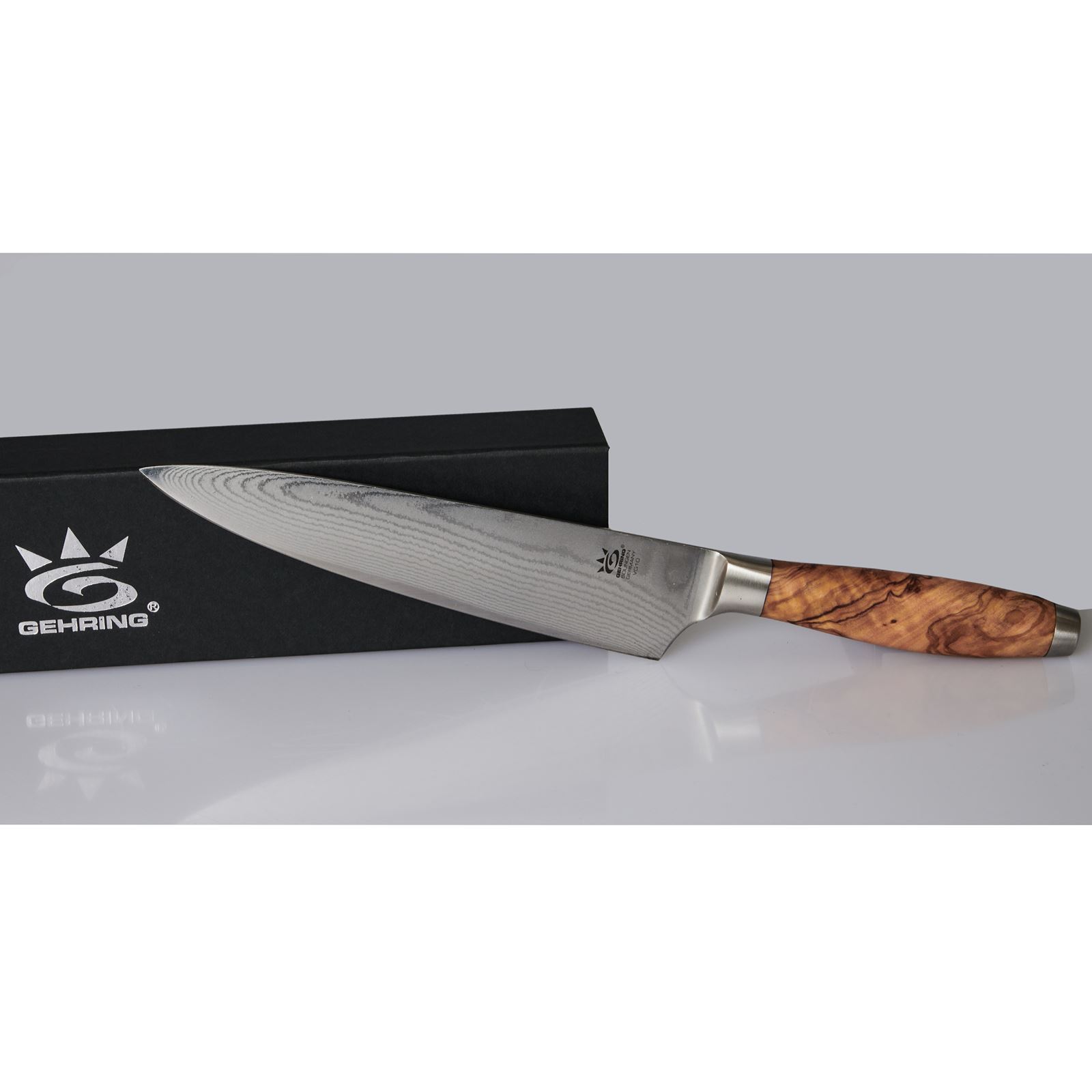 Das extra große 15 cm lange Profi-Kochmesser mit Mittelspitz und breiter präziser Klinge zum effizienten Schneiden, Schälen, Zerkleinern und Putzen besitzt ein Höchstmaß an Ästhetik in Funktion, Optik und Material und bringt jedes harte und weiche Gemüse, Fisch und Fleisch, auch Kräuter ganz souverän und schnell in die gewünschte Form. Das ausgefallene Universal-Messer ist als Allzweckküchenmesser eine sensationelle Schmiedekunst aus traditioneller Manufaktur-Herstellung Made in Germany aus Solingen und besteht aus hochlegierten eisgehärteten 65-lagigen Kohlenstoffstahl (VG10) in 59 61 HRC. Das Qualitätsmesser von Gehring ist ausgestattet mit einem formschönen gemaserten braunen Olivenholz-Heft mit ausgewogenen Edelstahl-Doppelkropfgriff, der Kropf ist das Zeichen für hohe Qualität und entsteht beim Schmiedevorgang, das Messer ist ausbalanciert und liegt somit optimal sicher in der Hand. Der erstklassige Stahl des Damast-Messers ist auf beiden Außenseiten rostbeständig und bruchsicher angefertigt worden. Die unverwechselbare Optik des High-End Profi-Messers entsteht durch das handgeführte Schleifen der Klinge und bekommt so mit Durchtrennen der Edelstahl-Lagen in den unterschiedlichen Längs- und Querrichtungen auf der gesamten Klingenlänge bis zum Griff die baumringähnliche Struktur. Das einzigartige Schälmesser ist robust, stabil und langlebig, sie erhalten die Nachhaltigkeit des kunstvollen Erscheinungsbildes und die volle Schnitthaltigkeit des Messers durch einfache Handreinigung unter heißem Wasser mit zusätzlichen milden Reinigern. Die gewünschte Schärfe des edlen Gemüse-Damastes kann ganz schnell und einfach wiedererlangt werden durch keramisch gebundene Schleifmittel.