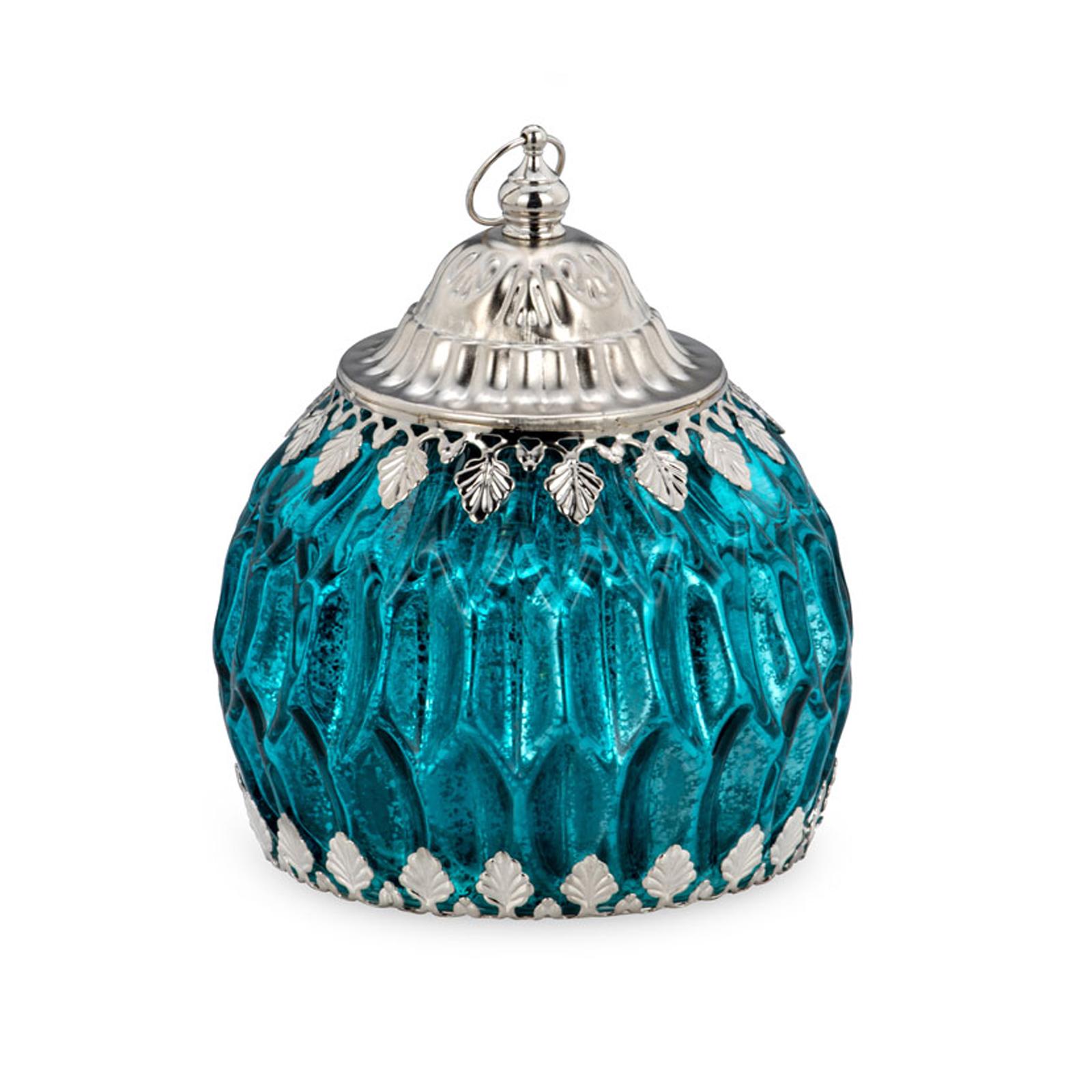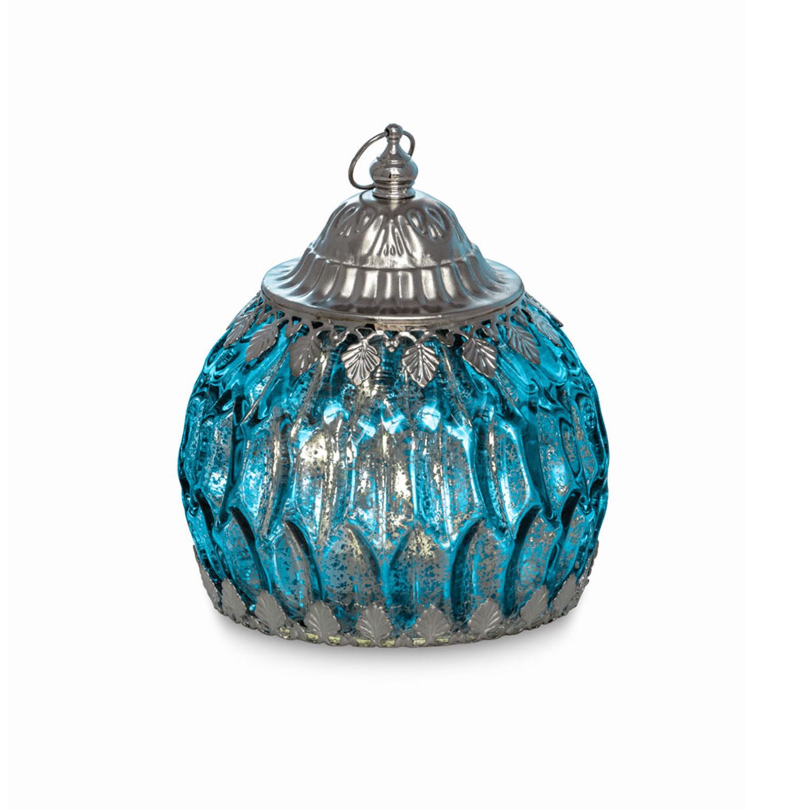 • Höhe ca.: 15 cm • Durchmesser ca.: 12.5 cm • Material: Glas • Material 1: Metall • Veredelung: vernickelt • Oberfläche Details: strukturiert • spülmaschinengeeignet: nein • Farbe: türkis • Eigenschaft: Beleuchtung zuschaltbar • Ausstattung: 5er LED Lichterkette • Ausstattung 1: An/Aus-Schalter • Ausstattung 2: Ring zum Aufhängen • Funktionalität: Zum Dekorieren und Beleuchten mit LED • Platzierungsart: zum Aufstellen oder Aufhängen • Form: rund • Dimension: mittelgroß • Motiv: Glocke • Motiv-Design: verzierte Glaslaterne im Glockenstil • Symbolik: Symbol für sommerliche Frische & leuchtende Leichtigkeit • Look & Stil: Lebendig, verspielt, stilvoll, lichtbetont, ausbalanciert • Umgebungsnutzung: Für Innenbereich und geschützten Außenbereich • Anlass: Für Dekoration, Wohnen, Geschenk, Abendstimmung, Ambiente • Nutzungsbereich: Tisch, Sideboard, Balkon, Terrasse, Eingang, Fensterbank • Nutzungsmöglichkeit: Laterne platzieren, Lichtakzente setzen, Stimmung erzeugen • Besonderheit: Ohne Timerfunktion! • Verbraucherhinweise: Lieferung ohne Batterie! Benötigt: 2× AAA (1,5V) • Gewicht ca.: 0,578 Kg
