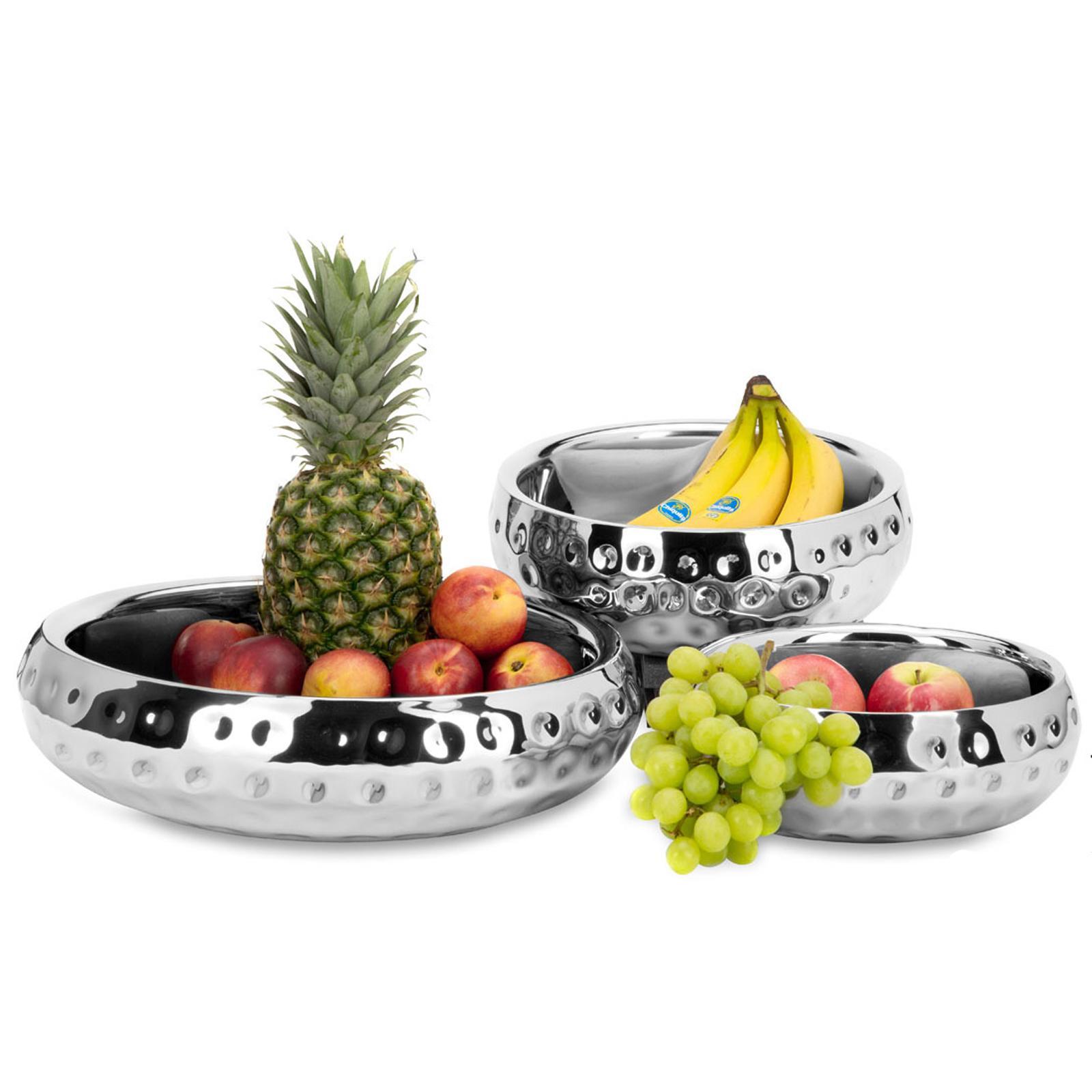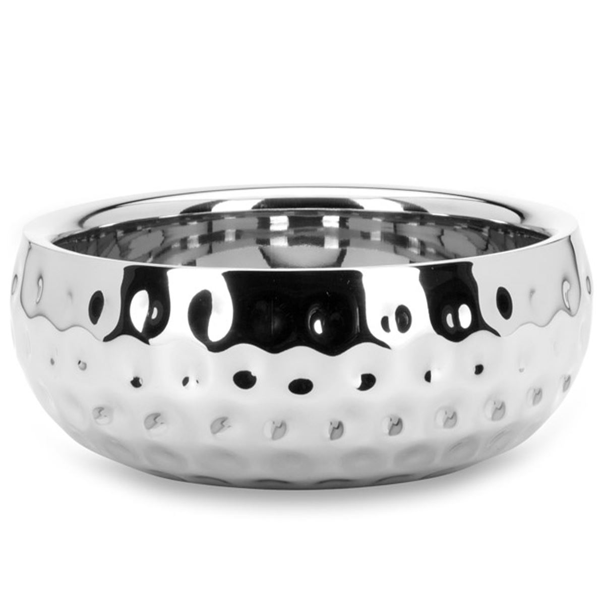 • Höhe ca.: 11 cm • Durchmesser ca.: 28 cm • Innenmaß ca.: Ø 25 cm • Randbreite ca.: 1.5 cm • Volumen: 3500 ml • Ausführung: hoch • Material: Edelstahl • Oberfläche: glatt poliert • Oberfläche Details: Außenseite gehämmert • spülmaschinengeeignet: ja • Farbe: silber • Eigenschaft: ohne Griffe - ohne Füße • Ausstattung: hoher Rand • Funktionalität: Zum Schmücken und Gestalten von Raum und Tisch • Platzierungsart: zum Aufstellen • Form: rund • Dimension: groß • Symbolik: Symbol für Präsenz, stilvolle Ruhe & kontemplative Ordnung • Look & Stil: klar konturiert, spiegelnd, geformt, großzügig, urban-edel • Umgebungsnutzung: Für Innenbereich und geschützten Außenbereich • Anlass: Für Dekoration, Wohnen, Präsent, Geschenk, Ambiente, Stil • Nutzungsbereich: Kommode, Fensterbank, Sideboard, Flur, Vitrine, Empfang • Nutzungsmöglichkeit: Deko arrangieren, Objekte präsentieren, Akzente setzen • Gewicht ca.: 1,41 Kg