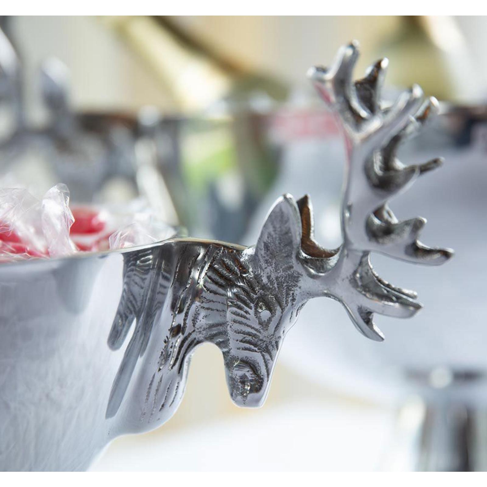 Verleihen Sie Ihrer Tischdekoration einen Hauch von Luxus und machen Sie diese extravagante Schale zum Mittelpunkt jeder Feier! Mit einem Durchmesser von 25,5 cm und einer Gesamtbreite von 42 cm inklusive der kunstvollen Hirschgriffe bietet diese runde Aluminiumschale genügend Platz für stilvolle Dekorationen oder das elegante Servieren von Obst und Snacks. Die stabilen zwei Griffe garantieren einen sicheren Transport, sodass die Schale sowohl bei besonderen Anlässen als auch im Alltag bequem genutzt werden kann. Dank der polierten Oberfläche reflektiert sie das Licht auf beeindruckende Weise und sorgt für einen glamourösen Effekt auf jeder Festtafel. Gefertigt aus hochwertigem Aluminium, ist diese silberfarbene Schale robust, langlebig und vielseitig einsetzbar. Die extravaganten Hirschgriffe verleihen ihr eine rustikale, aber zugleich elegante Optik, die besonders Naturfreunde und Liebhaber stilvoller, ländlicher Dekoration anspricht. Diese mittelgroße Dekoschale ist das perfekte Accessoire, um Ihre Wohn- und Tischdekoration auf ein neues Niveau zu heben.