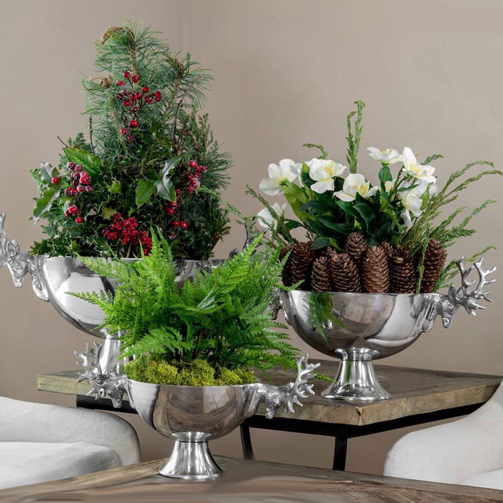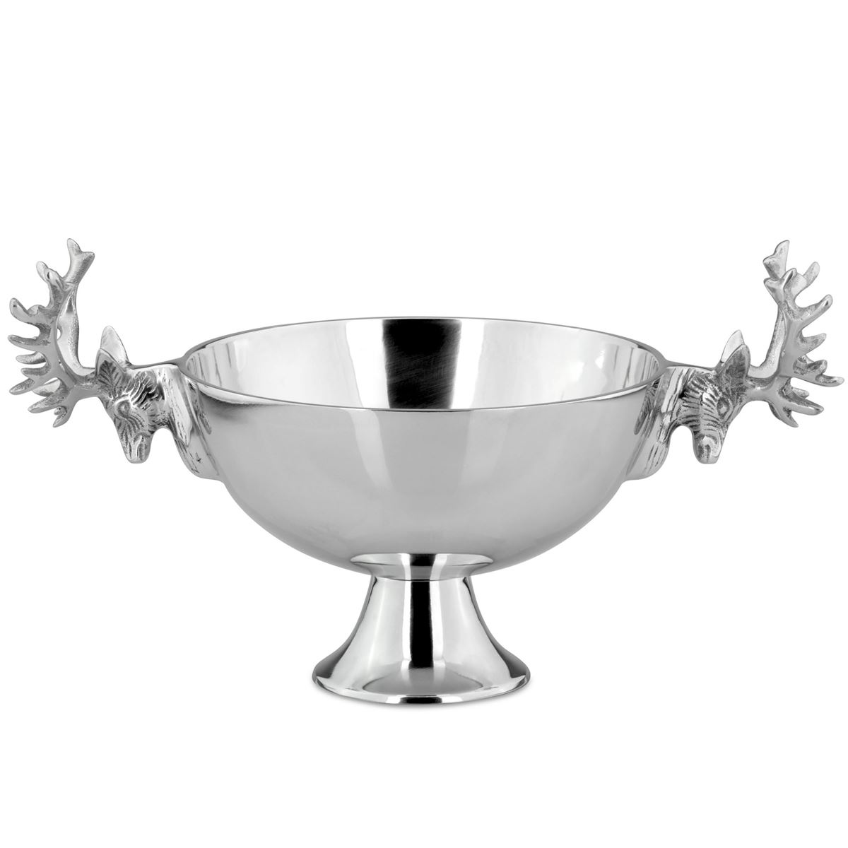 • Breite ca.: 42 cm • Höhe ca.: 23 cm • Durchmesser ca.: 25.5 cm • Detailmaß ca.: Fuß Ø 11.5 cm - mit Griffe Ø 42 cm • Material: Aluminium • Oberfläche: poliert • spülmaschinengeeignet: nein • Farbe: silber • Ausstattung: runder Standfuß • Ausstattung 1: 2 Tiermotiv-Griffe • Funktionalität: Zum Schmücken und Gestalten von Raum und Tisch • Platzierungsart: zum Aufstellen • Form: rund • Dimension: mittelgroß • Motiv: Hirsch • Motiv-Design: Griffe als Hirschkopf mit Geweih • Symbolik: Symbol für Naturverbundenheit, Stärke & ruhige Präsenz • Look & Stil: Markant, naturinspiriert, edel, rustikal, klar, präsent • Umgebungsnutzung: Nur für Innenbereich • Anlass: Für Dekoration, Wohnen, Präsent, Geschenk, Ambiente, Stil • Nutzungsbereich: Kommode, Fensterbank, Sideboard, Flur, Vitrine, Empfang • Nutzungsmöglichkeit: Deko arrangieren, Objekte präsentieren, Akzente setzen • Besonderheit: Nicht lebensmittelecht! • Besonderheit I: Nur für Indoor-Dekorationszwecke geeignet! • Gewicht ca.: 1,419 Kg