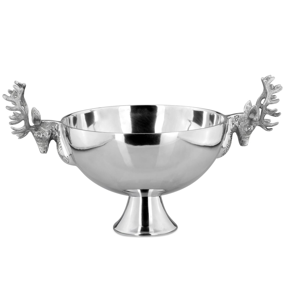• Breite ca.: 50 cm • Höhe ca.: 29 cm • Durchmesser ca.: 31 cm • Detailmaß ca.: Fuß Ø 12 cm - mit Griffe Ø 50 cm • Kapazität: 6600 ml • Material: Aluminium • Oberfläche: poliert • spülmaschinengeeignet: nein • Farbe: silber • Ausstattung: runder Standfuß • Ausstattung 1: 2 Tiermotiv-Griffe • Funktionalität: Zum Schmücken und Gestalten von Raum und Tisch • Platzierungsart: zum Aufstellen • Form: rund • Dimension: groß • Motiv: Hirsch • Motiv-Design: Griffe als Hirschkopf mit Geweih • Symbolik: Symbol für Naturkraft, Würde & dekorative Präsenz • Look & Stil: Majestätisch, tierisch akzentuiert, markant, rustikal edel • Umgebungsnutzung: Nur für Innenbereich • Anlass: Für Dekoration, Wohnen, Präsent, Geschenk, Ambiente, Stil • Nutzungsbereich: Kommode, Fensterbank, Sideboard, Flur, Vitrine, Empfang • Nutzungsmöglichkeit: Deko arrangieren, Objekte präsentieren, Akzente setzen • Besonderheit: Nicht lebensmittelecht! • Besonderheit I: Nur für Indoor-Dekorationszwecke geeignet! • Gewicht ca.: 2,4 Kg