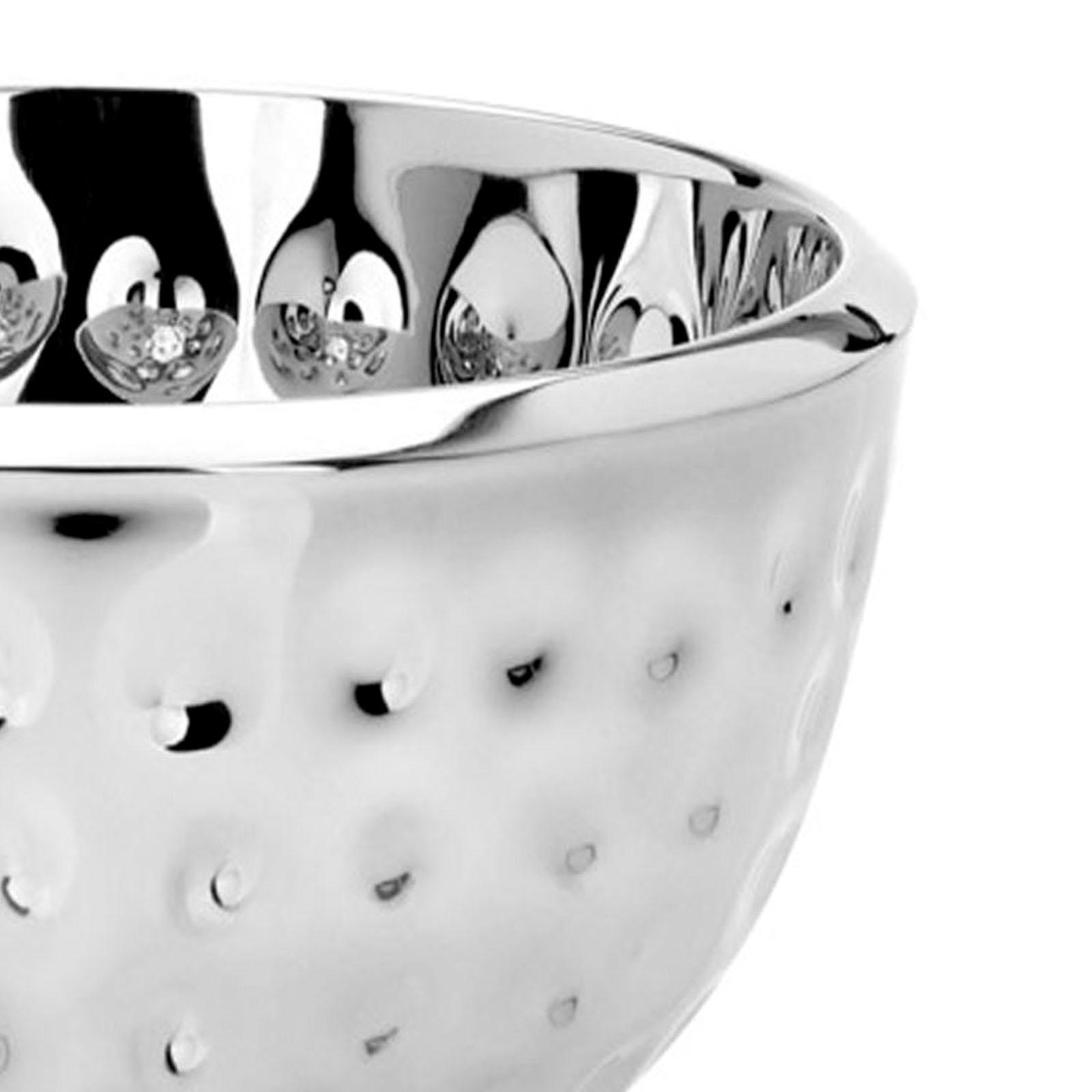 Elegantes Design in runder Form: Diese große, tiefe Dekoschale aus gehämmertem Edelstahl mit einem beeindruckenden Durchmesser von 30 cm ist der Inbegriff stilvoller Dekoration. Der tiefe Rand und die sorgfältig gehämmerte Oberfläche sorgen für einen einzigartigen Look, der jeden Raum aufwertet und die Blicke auf sich zieht. Luxuriöser Glanz und Qualität: Gefertigt aus hochwertigem, poliertem Edelstahl, bietet diese Schale nicht nur eine edle Optik, sondern auch eine robuste und langlebige Qualität. Die gehämmerte Struktur reflektiert das Licht auf faszinierende Weise, wodurch ein funkelnder Glanz entsteht, der Ihre Dekorationen ins beste Licht rückt. Dank der korrosionsbeständigen Eigenschaften bleibt die Schale über Jahre hinweg in makellosem Zustand. Vielseitig und zeitlos: Das großzügige, tiefe Design macht diese runde Edelstahl-Deko-Schale zu einem vielseitigen Highlight für jeden Einrichtungsstil. Ob auf dem Esstisch, dem Sideboard oder als Teil eines festlichen Arrangements - ihre schlichte Eleganz verleiht jedem Raum eine besondere Note und passt sich flexibel an verschiedene Dekorationsideen an. Meisterhafte Verarbeitung: Die polierte Oberfläche und die präzise gehämmerte Struktur sind ein Zeichen feinster Handwerkskunst. Die tiefe, runde Form verleiht der Schale nicht nur eine hohe Stabilität, sondern bietet auch vielfältige Möglichkeiten für eine stilvolle Präsentation. Dieses hochglänzende Dekorationsobjekt vereint Ästhetik und Funktionalität und wird so zum unverzichtbaren Bestandteil eines anspruchsvollen Wohnambientes.