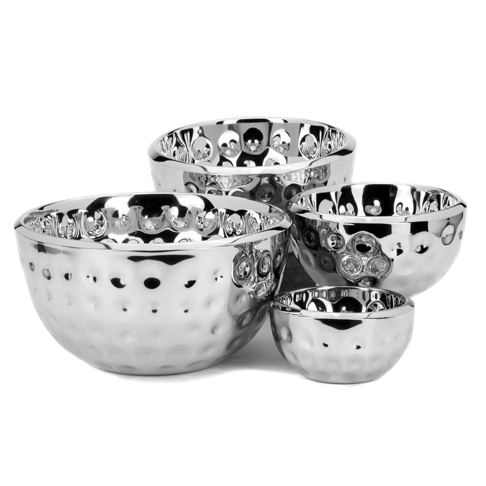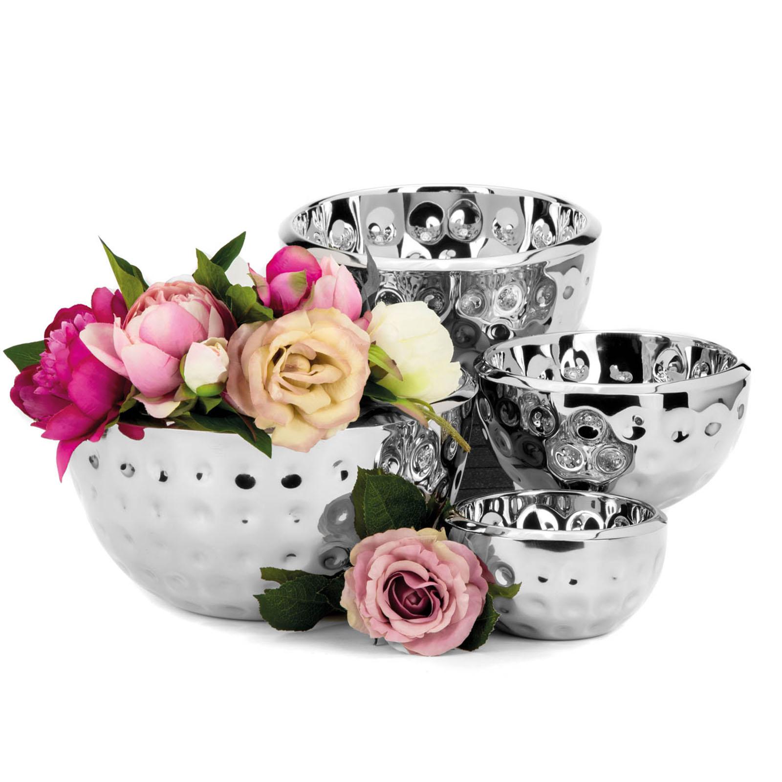 • Höhe ca.: 15.5 cm • Durchmesser ca.: 30 cm • Innenmaß ca.: Ø 27 cm • Randbreite ca.: 1.5 cm • Volumen: 5000 ml • Ausführung: hoch • Material: Edelstahl • Oberfläche: glatt poliert • Oberfläche Details: gehämmert • spülmaschinengeeignet: ja • Farbe: silber • Eigenschaft: ohne Griffe - ohne Füße • Ausstattung: hoher Rand • Funktionalität: Zum Anrichten und Servieren von Speisen • Platzierungsart: Zum Aufstellen auf dem Tisch • Form: rund • Dimension: groß • Symbolik: Symbol für Gastlichkeit, Formgefühl & kultivierte Ruhe • Look & Stil: leuchtend, ausdrucksstark, klar gefasst, kantfrei, stilvoll • Umgebungsnutzung: Für Innenbereich und geschützten Außenbereich • Anlass: Für Tischkultur, Wohnen, Empfang, Präsentation, Hotel, Stil • Nutzungsbereich: Esstisch, Küchentheke, Buffet, Empfang, Hotel, Gastronomie • Nutzungsmöglichkeit: Snacks servieren, Obst präsentieren, Tisch stilvoll decken • Gewicht ca.: 1,445 Kg
