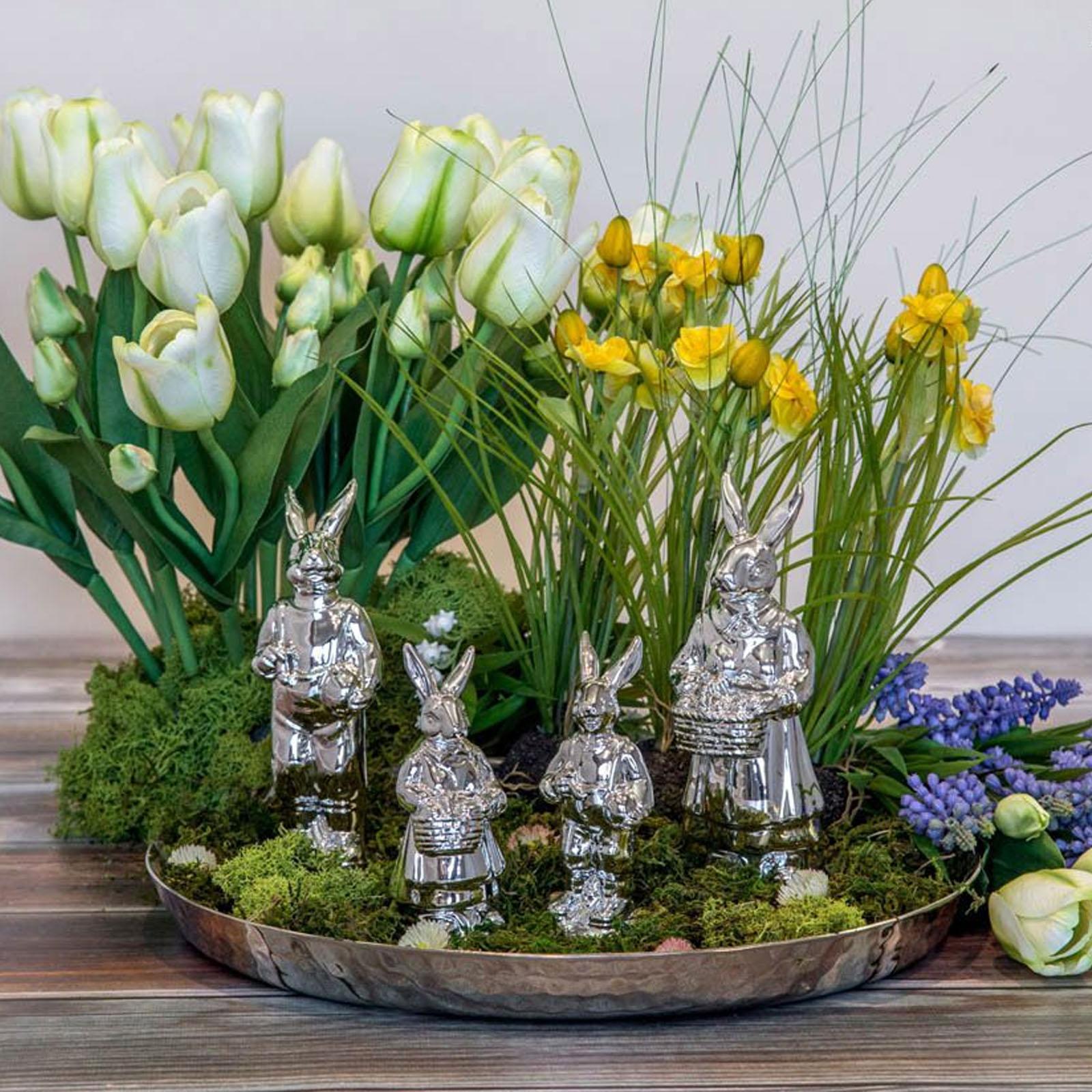 Bringen Sie stilvolle Eleganz in Ihre Osterdekoration mit diesem schlichten Porzellan-Hasenpaar. Das Set, bestehend aus zwei stehenden Figuren - einem Hasenmann mit Korb und einer Hasenfrau, die sich liebevoll zuwenden - verleiht Ihrer Frühlingsdeko eine harmonische und festliche Note. Mit einer beeindruckenden Höhe von 18,5 cm und einer glatt polierten, silberfarbenen Oberfläche setzen diese edlen Deko-Hasen Akzente in jedem Raum. Gefertigt aus hochwertigem Porzellan, überzeugen diese glänzenden Hasenfiguren durch ihre detailreiche Gestaltung und robuste Qualität. Die stilvolle Ausführung und der silberne Glanz reflektieren das Licht auf elegante Weise, wodurch Ihre Osterdeko zusätzlich aufgewertet wird. Das zeitlose Design fügt sich nahtlos in verschiedene Einrichtungsstile ein und sorgt für eine warme, einladende Atmosphäre. Dieses feine Hasen-Duo symbolisiert den Frühling und den Neuanfang. Die sorgfältig gearbeiteten Details, wie der Korb des Hasenmannes, unterstreichen die charmante Ausstrahlung dieser Porzellan-Tierfiguren. Ob auf dem Tisch, im Regal oder auf der Fensterbank - diese eleganten Deko-Hasen setzen überall einen besonderen Akzent und lassen Ihre Räume in festlichem Glanz erstrahlen. Verleihen Sie Ihrer Osterzeit eine besondere Note mit diesem stilvollen Hasenpaar-Set. Seine hochwertige Verarbeitung und das moderne Design machen es zu einem zeitlosen Dekoelement, das Jahr für Jahr Freude in Ihre Osterdekoration bringt.