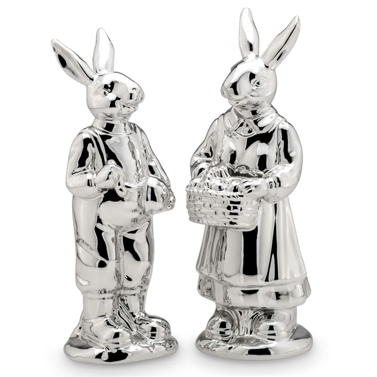• Länge ca.: 6.5 cm • Breite ca.: 6.7 cm • Höhe ca.: 18.5 cm • Detailmaß ca.: 6,5 x 6,7 x 18,5 cm - 6,4 x 5,5 x 17,7 cm • Material: Porzellan • Beschichtung: galvanisiert • Oberfläche: glatt poliert, glänzend • Oberfläche Details: klar und detailreich gestaltet • spülmaschinengeeignet: nein • Farbe: silber • Funktionalität: Zum Dekorieren in der Osterzeit • Platzierungsart: Zum Aufstellen • Form: figürlich • Dimension: groß • Motiv: Hasenpaar • Motiv-Design: Hasenmann & Hasenfrau beide stehend mit aufgestellten Ohren • Symbolik: Symbol für Liebe, Partnerschaft & stille Harmonie • Look & Stil: Edel, fein, ruhig, innig, symbolträchtig • Setumfang: 2-teilig • Umgebungsnutzung: Für Innenbereich und geschützten Außenbereich • Anlass: Für Geschenkidee, Dekozweck, Jahreszeit, Präsent, Feier • Nutzungsbereich: Sideboard, Fensterbank, Tischfläche, Empfang, Verkaufsraum • Nutzungsmöglichkeit: Figur aufstellen, Fläche gestalten, Blickrichtung lenken • Verbraucherhinweise: nur zur Dekoration geeignet - kein Kinderspielzeug • Gewicht ca.: 0,504 Kg