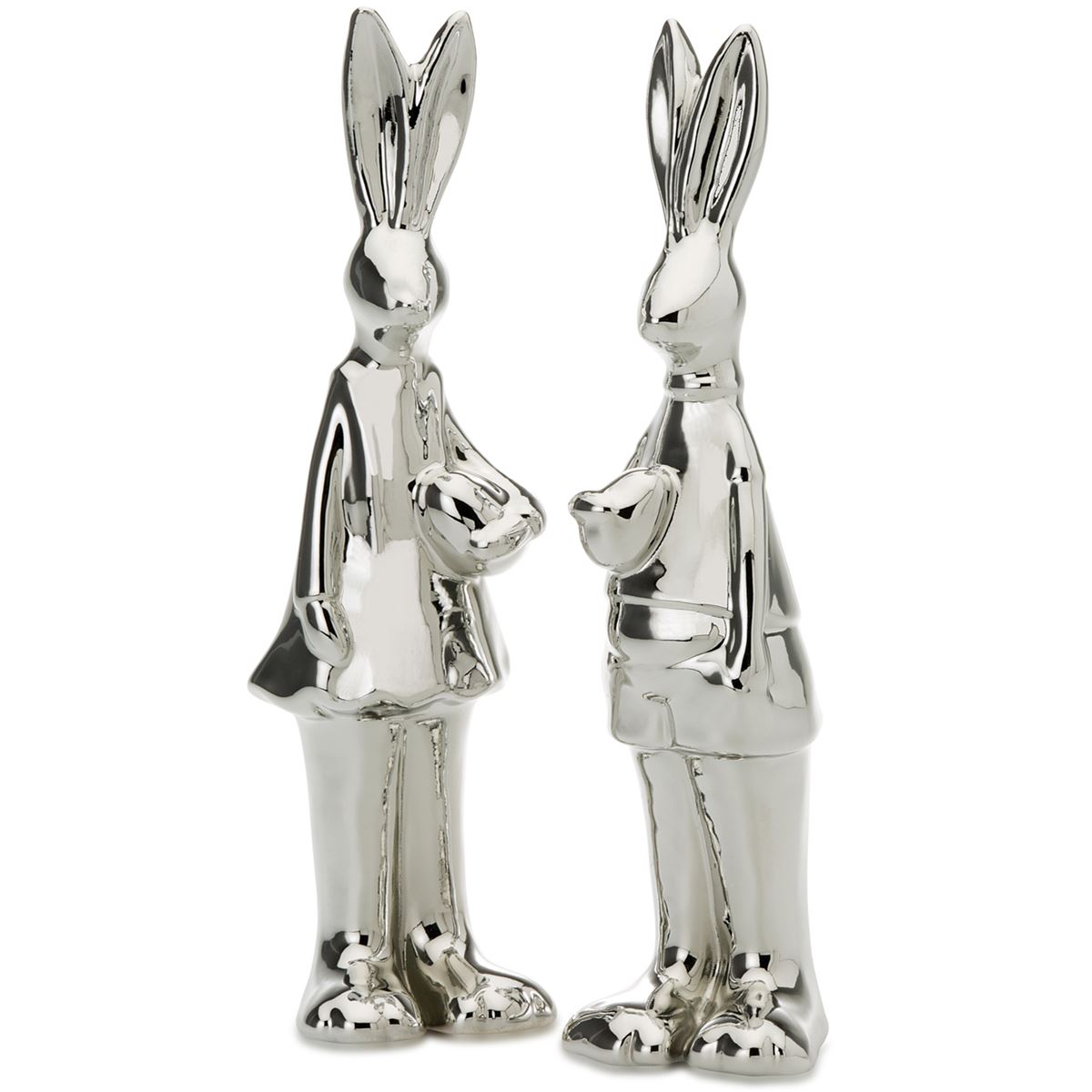 • Länge ca.: 4.9 cm • Breite ca.: 4.6 cm • Höhe ca.: 20.5 cm • Material: Porzellan • Oberfläche: glatt poliert • spülmaschinengeeignet: nein • Farbe: silber • Funktionalität: Zum Dekorieren in der Osterzeit • Platzierungsart: Zum Aufstellen • Form: figürlich • Dimension: groß • Motiv: Hasenpaar • Motiv-Design: beide stehend mit aufgestellten Ohren • Symbolik: Symbol für Achtsamkeit, Energie & Frühlingsfreude • Look & Stil: Markant, wach, präsent, fein, symbolträchtig • Setumfang: 2-teilig • Umgebungsnutzung: Für Innenbereich und geschützten Außenbereich • Anlass: Für Geschenkidee, Dekozweck, Jahreszeit, Präsent, Feier • Nutzungsbereich: Sideboard, Fensterbank, Tischfläche, Empfang, Verkaufsraum • Nutzungsmöglichkeit: Figur aufstellen, Fläche gestalten, Blickrichtung lenken • Verwendungshinweis: nur zur Dekoration geeignet - kein Kinderspielzeug • Gewicht ca.: 0,33 Kg