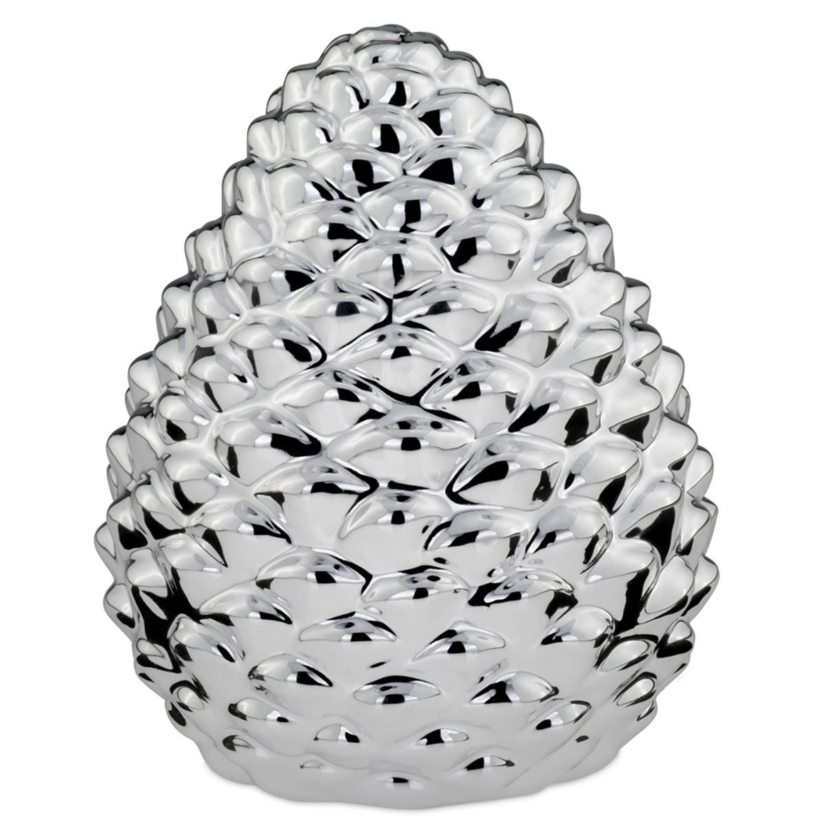 • Höhe ca.: 21 cm • Durchmesser ca.: 15 cm • Material: Porzellan • Beschichtung: galvanisiert • Oberfläche: glatt poliert, glänzend • spülmaschinengeeignet: nein • Farbe: silber • Eigenschaft: ohne Fuß • Funktionalität: Zum Dekorieren von Tisch und Raum • Platzierungsart: zum Aufstellen • Form: realistisch • Dimension: groß • Motiv: Pinienzapfen • Symbolik: Symbol für Schutz, Naturkraft & saisonale Erneuerung • Look & Stil: Plastisch, ausdrucksstark, klar, edel, dekorativ, saisonal • Umgebungsnutzung: Für Innenbereich und geschützten Außenbereich • Anlass: Für Herbst, Winter, Advent, Naturdeko, Geschenkidee • Nutzungsbereich: Wohnbereich, Fensterbank, Kommode, Eingangsbereich, Regal • Nutzungsmöglichkeit: Objekt platzieren, Tisch dekorieren, Raum optisch ergänzen • Verbraucherhinweise: nur zur Dekoration geeignet - kein Kinderspielzeug • Gewicht ca.: 0,899 Kg