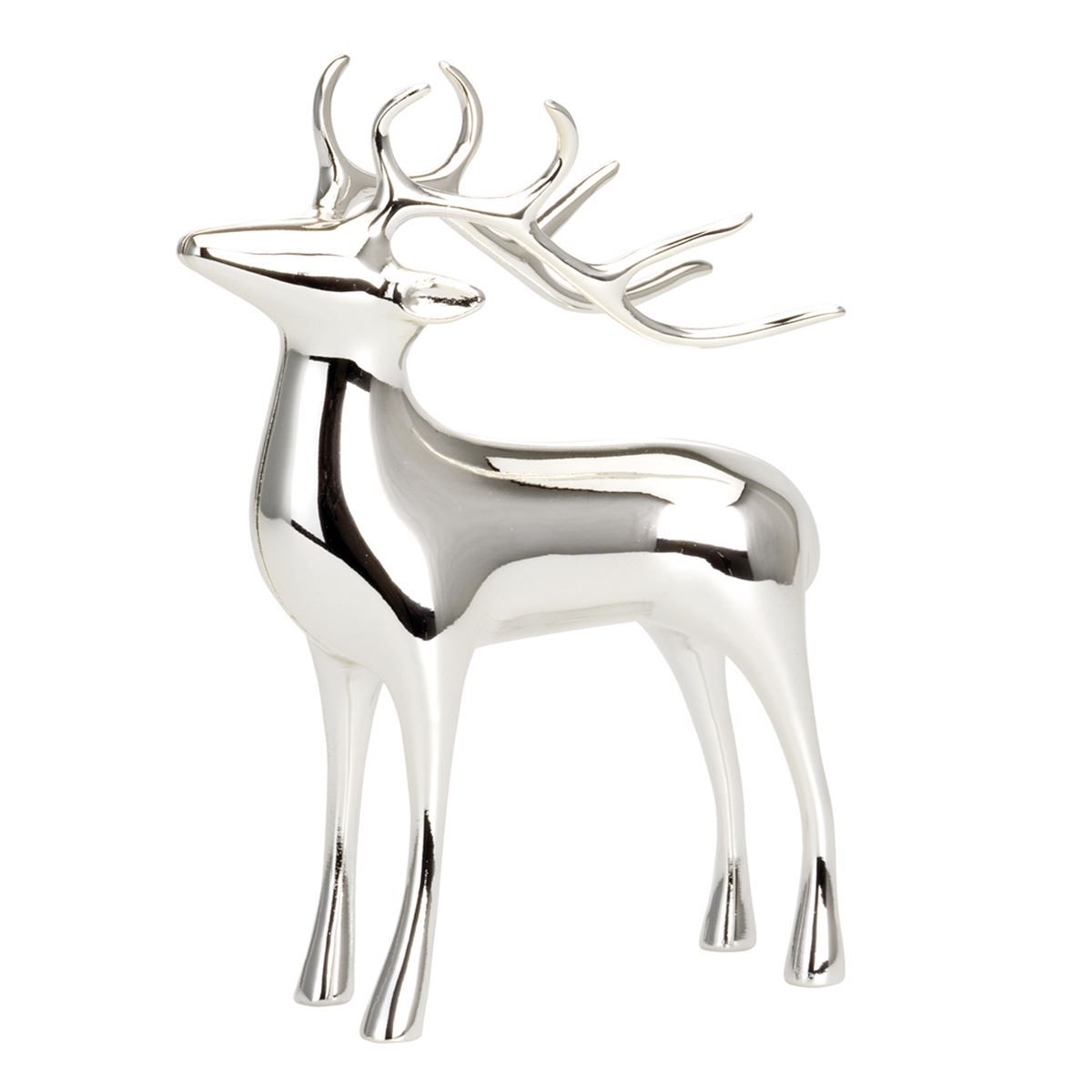 • Länge ca.: 11 cm • Höhe ca.: 15.5 cm • Material: Metall • Beschichtung: versilbert • Veredelung: anlaufgeschützt • Oberfläche: glatt poliert • spülmaschinengeeignet: nein • Farbe: silber • Funktionalität: Zum Dekorieren von Tisch und Raum • Platzierungsart: zum Aufstellen • Form: figürlich • Dimension: mittelgroß • Motiv: Rentier • Motiv-Design: stehend Kopf leicht nach oben • Symbolik: Symbol für Anmut, Stärke & die stille Eleganz des Winters • Look & Stil: Klar geformt, edel, ruhig, stilvoll, symbolisch, winterlich • Umgebungsnutzung: Für Innenbereich und geschützten Außenbereich • Anlass: Für Raumgestaltung, Winterzeit, Empfang, Saison, Dekozweck • Nutzungsbereich: Tisch, Fensterbrett, Eingang, Dekonische, Empfangsbereich • Nutzungsmöglichkeit: Deko platzieren, Stimmung erzeugen, Wohnambiente stärken • Verwendungshinweis: nur zur Dekoration geeignet - kein Kinderspielzeug • Gewicht ca.: 0,268 Kg