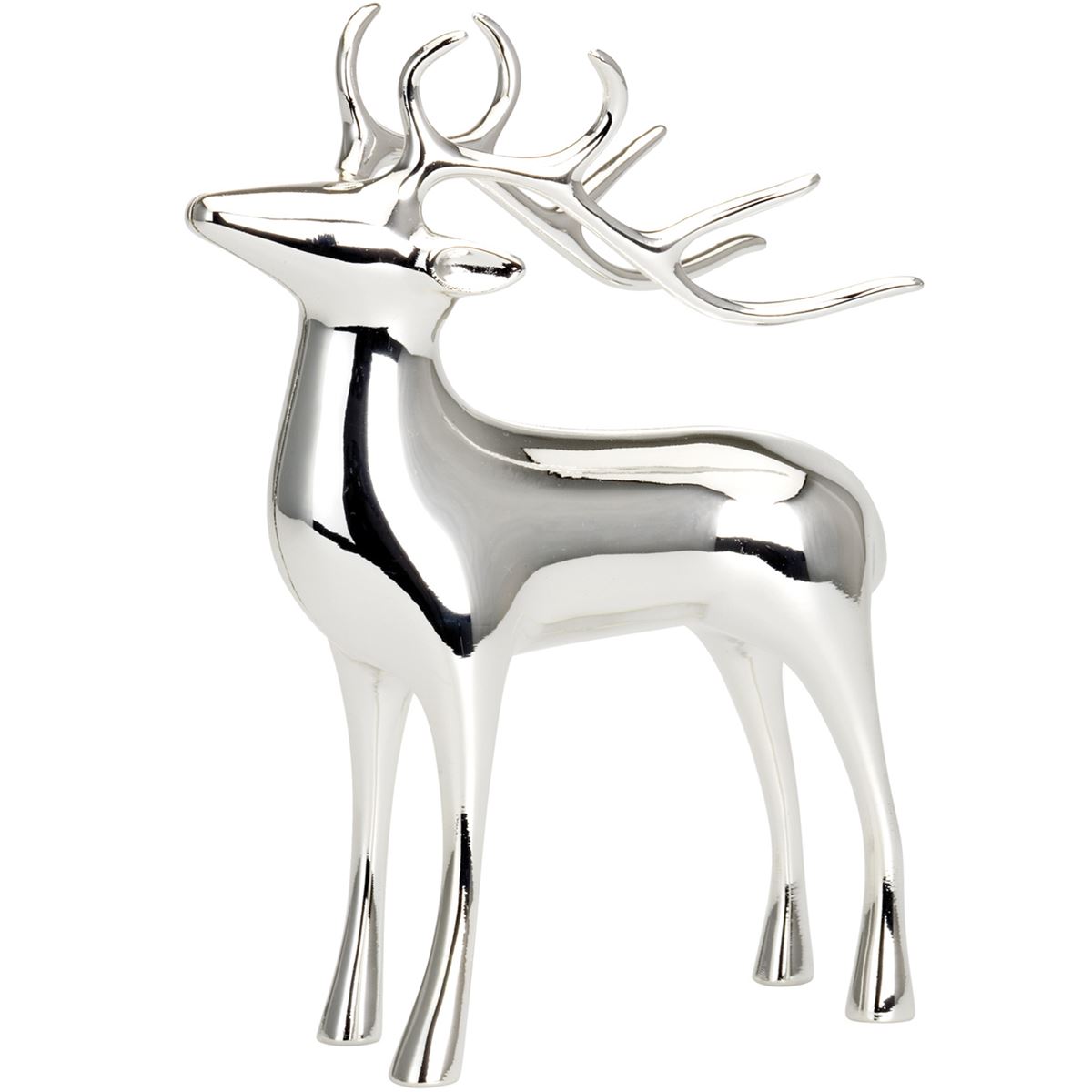 • Länge ca.: 14 cm • Höhe ca.: 19.5 cm • Material: Metall • Beschichtung: versilbert • Veredelung: anlaufgeschützt • Oberfläche: glatt poliert • spülmaschinengeeignet: nein • Farbe: silber • Funktionalität: Zum Dekorieren von Tisch und Raum • Platzierungsart: zum Aufstellen • Form: figürlich • Dimension: groß • Motiv: Rentier • Motiv-Design: stehend Kopf leicht nach oben • Symbolik: Symbol für Anmut, Stärke & die stille Magie des Winters • Look & Stil: Ruhig, stilvoll, präsent, symbolisch, winterlich, edel • Umgebungsnutzung: Für Innenbereich und geschützten Außenbereich • Anlass: Für Raumgestaltung, Winterzeit, Empfang, Saison, Dekozweck • Nutzungsbereich: Tisch, Fensterbrett, Eingang, Dekonische, Empfangsbereich • Nutzungsmöglichkeit: Deko platzieren, Stimmung erzeugen, Wohnambiente stärken • Verwendungshinweis: nur zur Dekoration geeignet - kein Kinderspielzeug • Gewicht ca.: 0,48 Kg