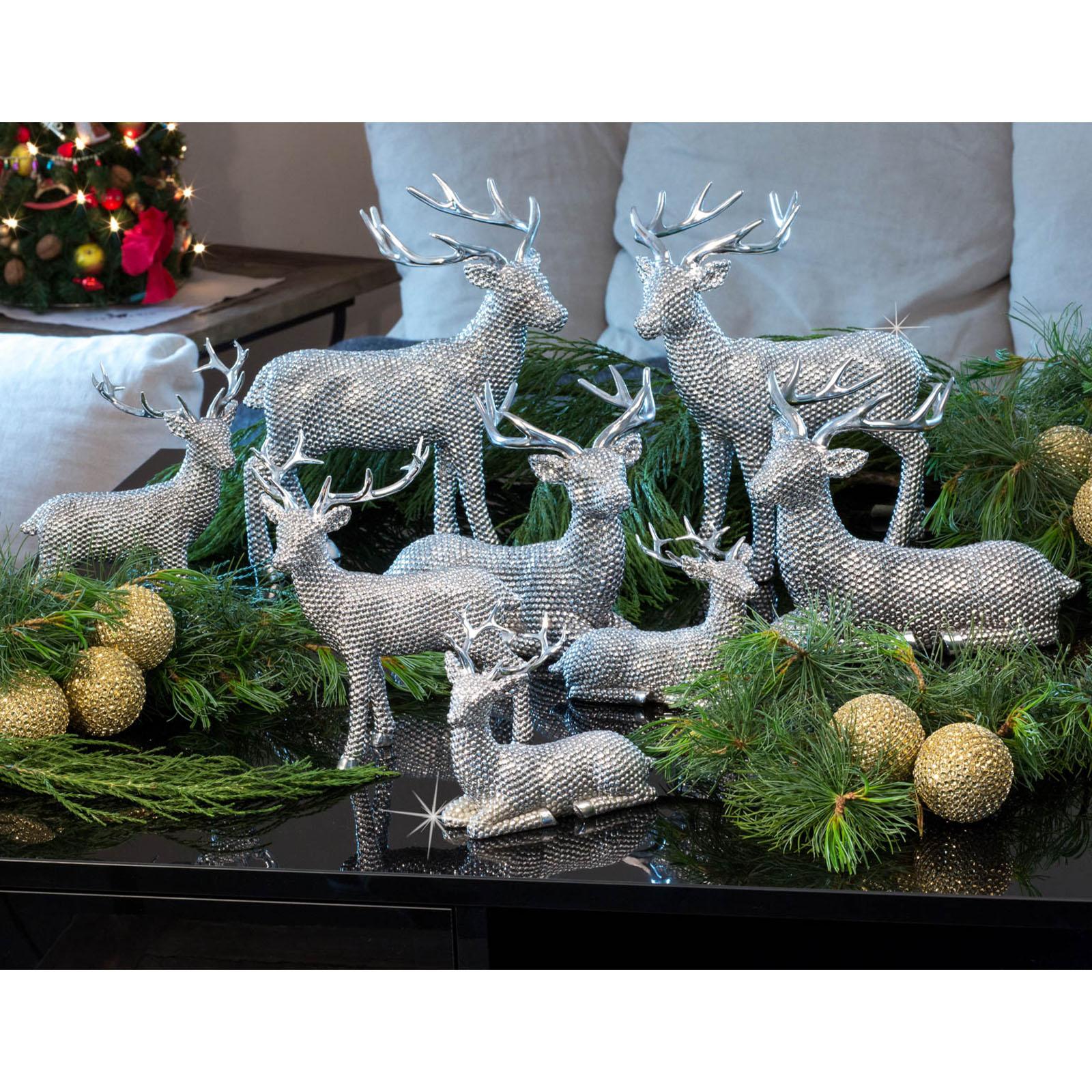 Holen Sie festlichen Glanz in Ihre Dekoration: Dieses große, stehende Rentier aus Kunststein beeindruckt mit seiner eleganten Diamanten-Optik und einer Höhe von 29 cm. Die glitzernde Oberfläche fängt das Licht auf faszinierende Weise ein und verleiht Ihrer Weihnachtsdekoration einen luxuriösen, edlen Charme. Hochwertiger Kunststein mit funkelnder Veredelung: Aus feinem Kunststein gefertigt und mit einer silbernen Diamanten-Optik veredelt, bewahrt dieses Rentier über Jahre hinweg seine anmutige Ausstrahlung. Seine robuste Beschaffenheit und das glanzvolle Finish machen es zu einem langlebigen Dekorationsstück, das jede Weihnachtssaison aufs Neue begeistert. Majestätisches Design mit Symbolkraft: In seiner aufrechten, stehenden Position symbolisiert das Rentier Anmut und Stärke. Die detailverliebte Gestaltung des Geweihs und die funkelnde Diamanten-Optik verleihen der Figur eine besondere Präsenz, die die winterliche Natur und die festliche Magie der Weihnachtszeit in Ihre Räume holt. Vielseitige Einsatzmöglichkeiten: Dank seiner imposanten Höhe lässt sich dieses Rentier-Deko-Stück vielseitig einsetzen. Ob als strahlender Mittelpunkt auf dem Kaminsims, als Blickfang auf dem Sideboard oder umgeben von weihnachtlichen Accessoires wie Kerzen und Tannenzapfen - es verleiht jedem Raum eine festliche Eleganz. Ein funkelnder Hingucker: Die Kombination aus seiner Größe und der Diamanten-Optik macht dieses große, stehende Deko-Rentier zu einem besonderen Highlight in Ihrer Dekoration. Es zieht alle Blicke auf sich und verleiht Ihrem Zuhause eine festliche Atmosphäre, die zum Träumen einlädt.