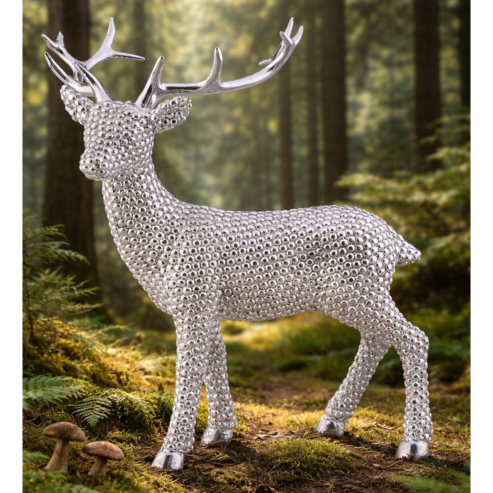 • Länge ca.: 25.3 cm • Breite ca.: 13.8 cm • Höhe ca.: 29.1 cm • Material: Kunststein • Beschichtung: galvanisiert • Oberfläche: glänzend • Oberfläche Details: mit Diamanten Optik • spülmaschinengeeignet: nein • Farbe: silber • Eigenschaft: Polyresin • Funktionalität: Zum Dekorieren von Tisch und Raum • Platzierungsart: zum Aufstellen • Form: figürlich • Dimension: sehr groß • Motiv: Rentier • Motiv-Design: stehend mit Blick nach links • Symbolik: Symbol für Wachsamkeit, Würde & stille Präsenz • Look & Stil: Charismatisch, ruhig, kontemplativ, subtil, formbewusst • Umgebungsnutzung: Für Innenbereich und geschützten Außenbereich • Anlass: Für Raumgestaltung, Winterzeit, Empfang, Saison, Dekozweck • Nutzungsbereich: Tisch, Fensterbrett, Eingang, Dekonische, Empfangsbereich • Nutzungsmöglichkeit: Deko platzieren, Stimmung erzeugen, Wohnambiente stärken • Verwendungshinweis: nur zur Dekoration geeignet - kein Kinderspielzeug • Gewicht ca.: 0,936 Kg
