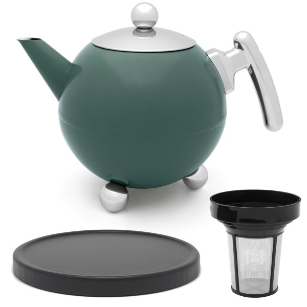 Der Vorteil dieser smaragd-grünen doppelwandigen Edelstahlteekanne mit schwarzem Holz Untersetzer im 3er Set ist seine isolierende Eigenschaft. Dank der doppelten Wand der praktischen breiten Teekanne mit 1.2 L Fassungsvermögen bleibt Ihr Tee, je nach Füllungsgrad, bis zu einer Stunde warm und geschmackvoll. Die funktionelle Kanne für Tee sorgt für einen idealen Temperaturverlauf und hält auch danach Ihr Heißgetränk langanhaltend warm! Durch den komfortablen, chromfarbenen Kunststoff-Griff der außergewöhnlichen molligen Teekanne mit Filter lässt sie sich auch befüllt gut handhaben. Der gutsitzende Teekannen-Deckel bleibt beim Eingießen auf der kugelrunden modernen Teekanne - selbst wenn Sie das in dem Tee-Set enthaltene feine Teesieb nutzen. Das langlebige Filter-Sieb erleichtert zudem Ihre Teezubereitung enorm. Das feinporige Teesieb aus Kunststoff und Edelstahl bietet neben der Nachhaltigkeit auch ein optimales Aroma des Tees: Ganze Teeblätter haben genug Platz, um ihren Geschmack voll entfalten zu können und klein gemahlene Teeblätter bleiben in dem feingliedrigen Teesieb dieser farbigen Edelstahlteekanne. Über Teekannenflecken brauchen Sie sich bei der dunkelgrünen kugeligen Teekanne nicht zu sorgen, denn diese isolierende Teekanne verfügt über drei stabile Kunststoff-Füße. Dazu bezaubert das moderne, farbenfrohe Design der stilvollen Edelstahl-Teekanne jeden Teeliebhaber.
