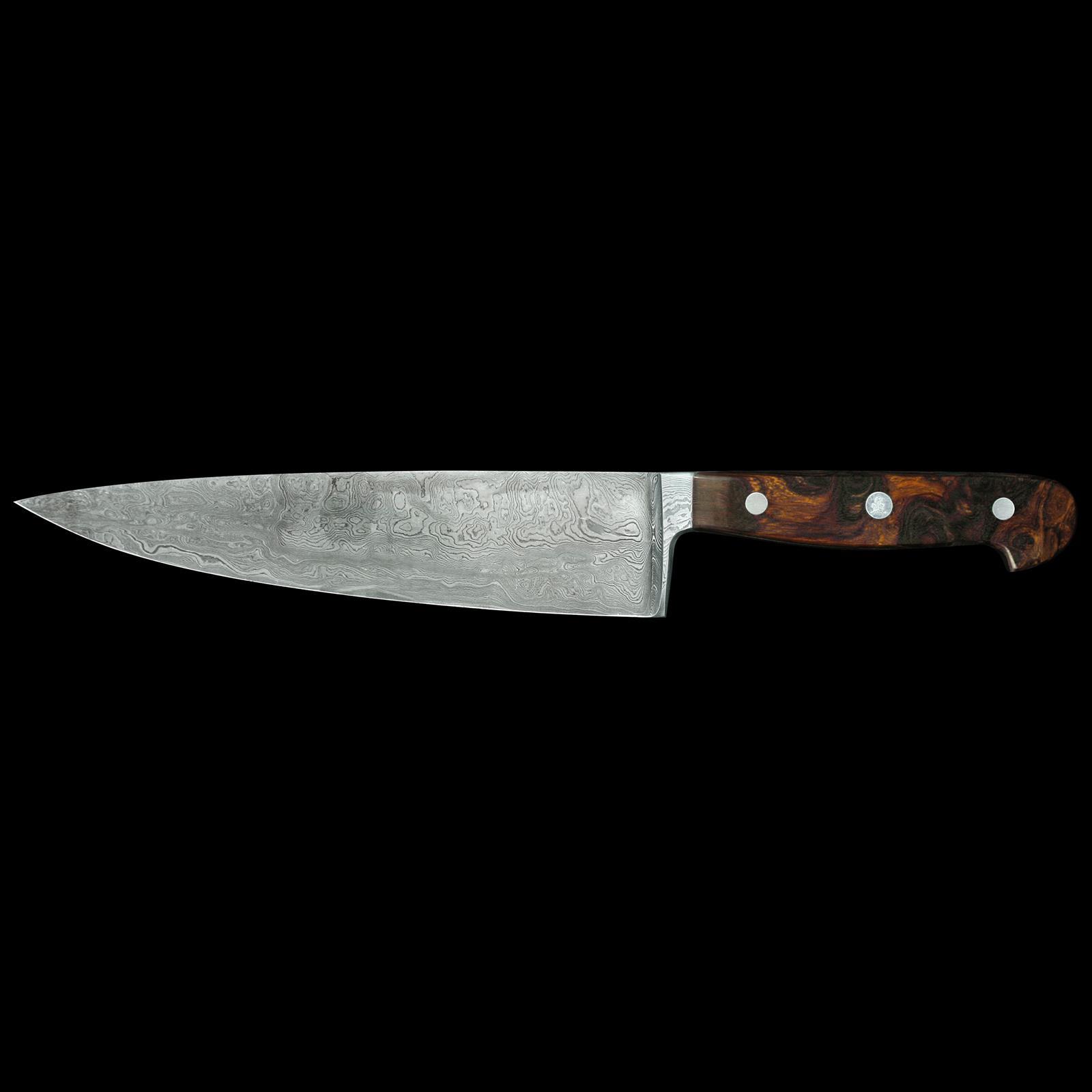 Erstaunliches Kochmesser aus der beeindruckenden Damast Serie von Güde - Handwerkliche Kunst und hochwertiges Design aus Solingen in Deutschland mit höchster Klingenqualität: Für Kenner, die höchste Ansprüche an Qualität und Präzision stellen, Könner, die ihr Handwerk in Perfektion beherrschen, und Kochbegeisterte, die mit Leidenschaft und Liebe zum Detail ihre kulinarischen Kreationen perfektionieren. Dieses nicht-rostfreie Damast Küchenmesser, dessen Griff aus bis zu 1.500 Jahre altem Wüsten-Eisenholz besteht, verfügt über eine scharfe, breite Schneide, welche aus einem Stück geschmiedet wurde. Das große Allzweckmesser mit einer Klingenlänge von 21 cm ermöglicht verschiedene Schneidaufgaben, darunter Schneiden, Hacken, Würfeln, Zerkleinern und Wiegen von Gemüse, Fleisch und Kräutern. Das Chefmesser ist gut ausbalanciert und eignet sich besonders für präzise und saubere Schnitte, die Schärfe trägt zur Effizienz und zur Genauigkeit beim Schneiden bei. Dieses geschmiedete Güde Kochmesser bietet Ihnen eine Kombination aus Funktionalität und ästhetischem Design, die es zu einem wertvollen Allround-Messer in jeder Küche macht - über 300 Lagen Damast Stahl in maximaler Exzellenz verarbeitet.