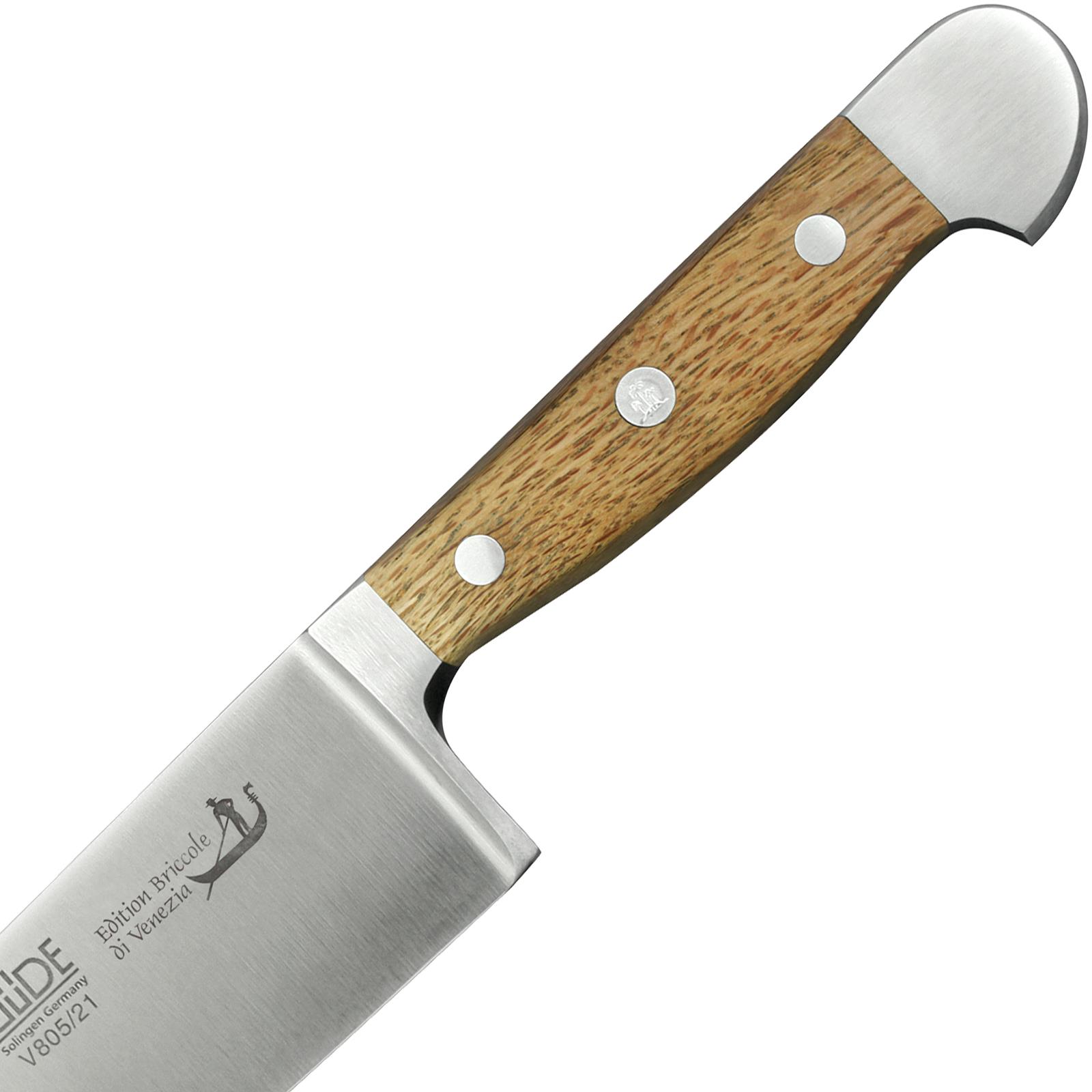 Besonderes Kochmesser aus der Serie Alpha-Briccole Di Venezia von Güde - Bemerkenswertes Design aus Solingen in Deutschland und höchste Klingenqualität in Handarbeit: Für Kenner, die höchste Ansprüche an Qualität und Präzision stellen, Könner, die ihr Handwerk in Perfektion beherrschen, und Kochbegeisterte, die mit Leidenschaft und Liebe zum Detail ihre kulinarischen Kreationen perfektionieren. Dieses rostfreie Küchenmesser, dessen Griff aus außergewöhnlichem Eichenholz besteht, verfügt über eine scharfe, breite Schneide, welche aus einem Stück geschmiedet wurde. Die edlen Griffschalen dieses Messers sind aus dem Eichen-Holz venezianischer Gondelpfähle (Briccole) gefertigt, diese Pfähle werden alle 100 Jahre ausgetauscht. Das große Allzweckmesser mit einer eisgehärteten Klingenlänge von 21 cm ermöglicht verschiedene Schneidaufgaben, darunter Schneiden, Hacken, Würfeln, Zerkleinern und Wiegen von Gemüse, Fleisch und Kräutern. Das Chefmesser ist gut ausbalanciert und eignet sich besonders für präzise und saubere Schnitte, die Schärfe trägt zur Effizienz und zur Genauigkeit beim Schneiden bei. Dieses geschmiedete Güde Kochmesser bietet dir eine Kombination aus Funktionalität und ästhetischem Design, die es zu einem wertvollen Allround-Messer in jeder Küche macht.