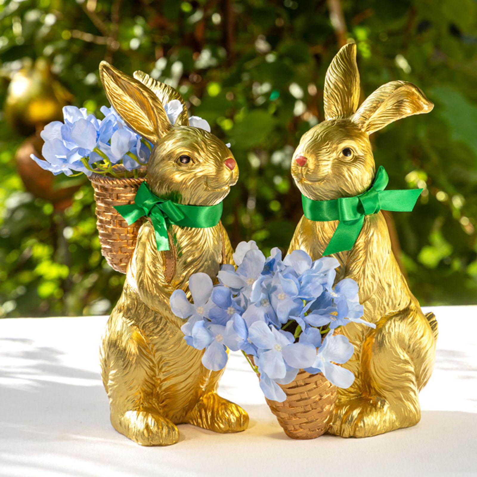 ✓ Hase in Goldoptik mit Blumen-Korb auf dem Rücken und grüner Schleife für frühlingshafte Akzente ✓ Große Deko Hasenfigur aus Kunststein mit fein modellierten Details und golden matter Oberfläche ✓ Mit ca. 32 cm Höhe präsent proportioniert & ideal für Böden, Sideboards & großzügige Tischflächen ✓ Vielseitig einsetzbare Frühlingsdeko für Wohnräume, Eingangsbereiche & saisonale Präsentationen ✓ Stilvolle Aufmerksamkeit zu Ostern oder als zeitlose Hasendekoration für moderne Einrichtungen