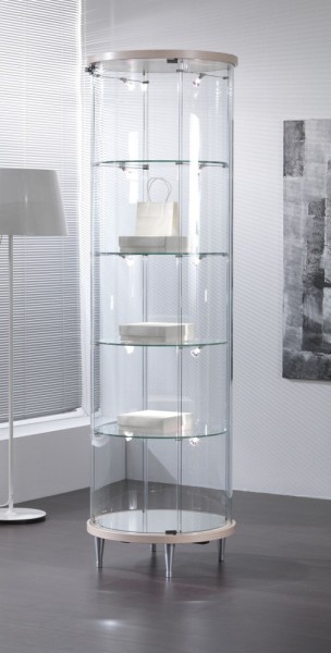 Die runde unbeleuchtete Design Glasvitrine mit einem Durchmesser von 56 cm eignet sich besonders gut für Ausstellungen oder Waren-Präsentationen. Dank der rahmenlosen Konstruktion der edlen modernen Ausstellungsvitrine aus Sicherheitsglas liegt der Fokus auf dem Produkt selbst und wird dadurch optimal in Szene gesetzt. In dieser großen abschließbaren Stand-Präsentationsvitrine aus Glas können Sie ihre Exponate, Kunstobjekte, Waren, Produkte oder Sammlerstücke auf mehreren Ebenen von allen Seiten ansprechend ausstellen und präsentieren. In der verschließbaren hochwertigen Messe-Vitrine aus Sicherheitsglas sind Ihre Ausstellungsstücke oder Produkte sicher untergebracht. Durch die 4 montierten regulierbaren 11 cm hohen Standfüßen am Holzsockel ist die Schauvitrine aus Glas in Ihren Ausstellungs- oder Geschäftsräumen mit einem festen Stand sicher platzierbar. Die runde Vitrine Glas ist schnell und einfach montiert und demontiert und eignet sich deshalb besonders für den Messebau. Für die Stabilität der Stand-Vitrine mit gerundeten Glasteilen sorgen unauffällige Verbindungen im oberen und unteren eichefarbigen Holzsockel in denen die Glasteile verschraubt werden. Für ein optisches Highlight sorgt die auf dem Holzboden aufgelegte Spiegelplatte. Die 4 mitgelieferten stufenlos verstellbaren Glasböden der Glasvitrine tragen bei verteilter Last ca. 5-7 Kg je Fachboden. Den Holzboden und den Holzdeckel erhalten Sie optional auf Anfrage auch in den Farben wenge oder kirschbaum ohne Mehrpreis.