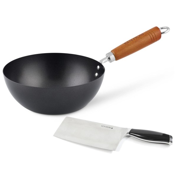 Produkt-Eigenschaften des Karbon-Wok Sets✓ Der kleine Antihaft Wok 20 cm aus gehärtetem Karbonstahl eignet sich hervorragend für das Kurzbraten